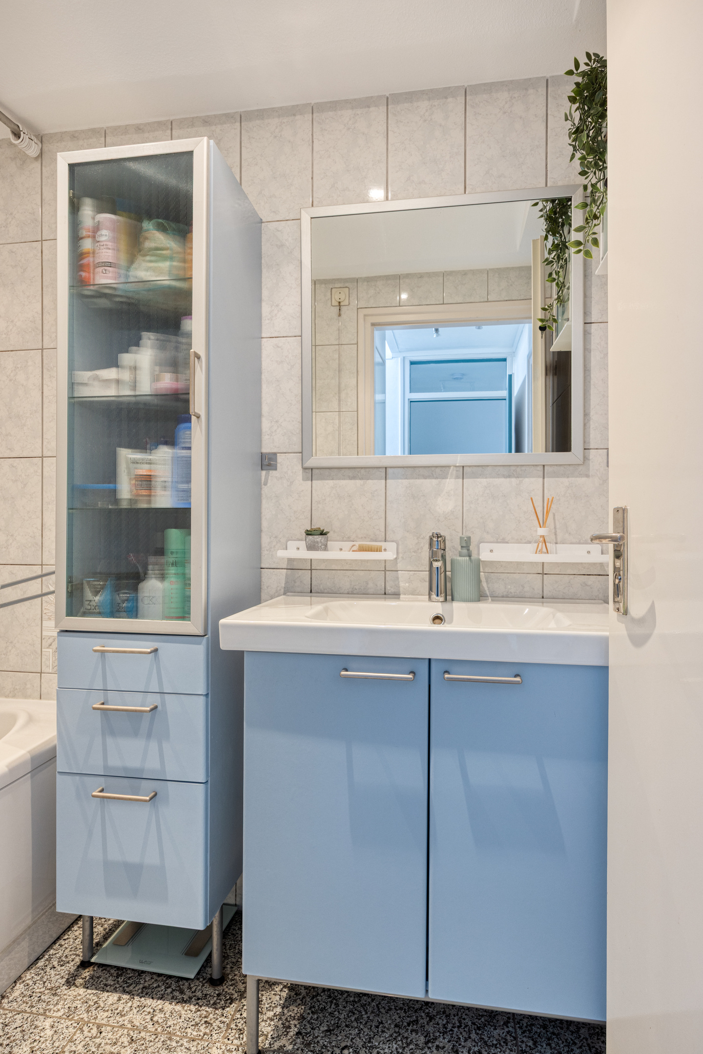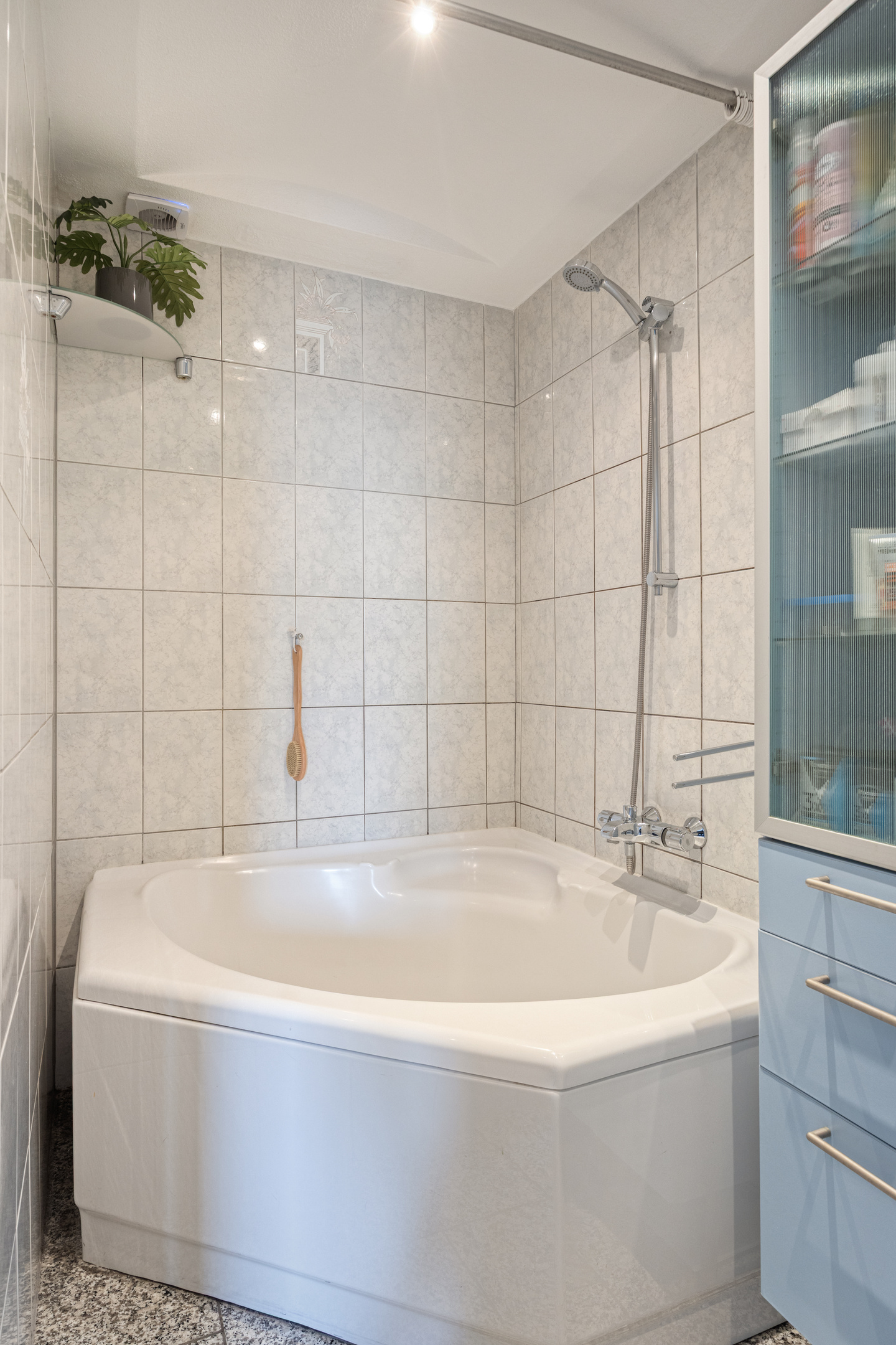 Geheel betegelde badkamer met hoek-zitbad en een vaste wastafel in een badkamermeubel.