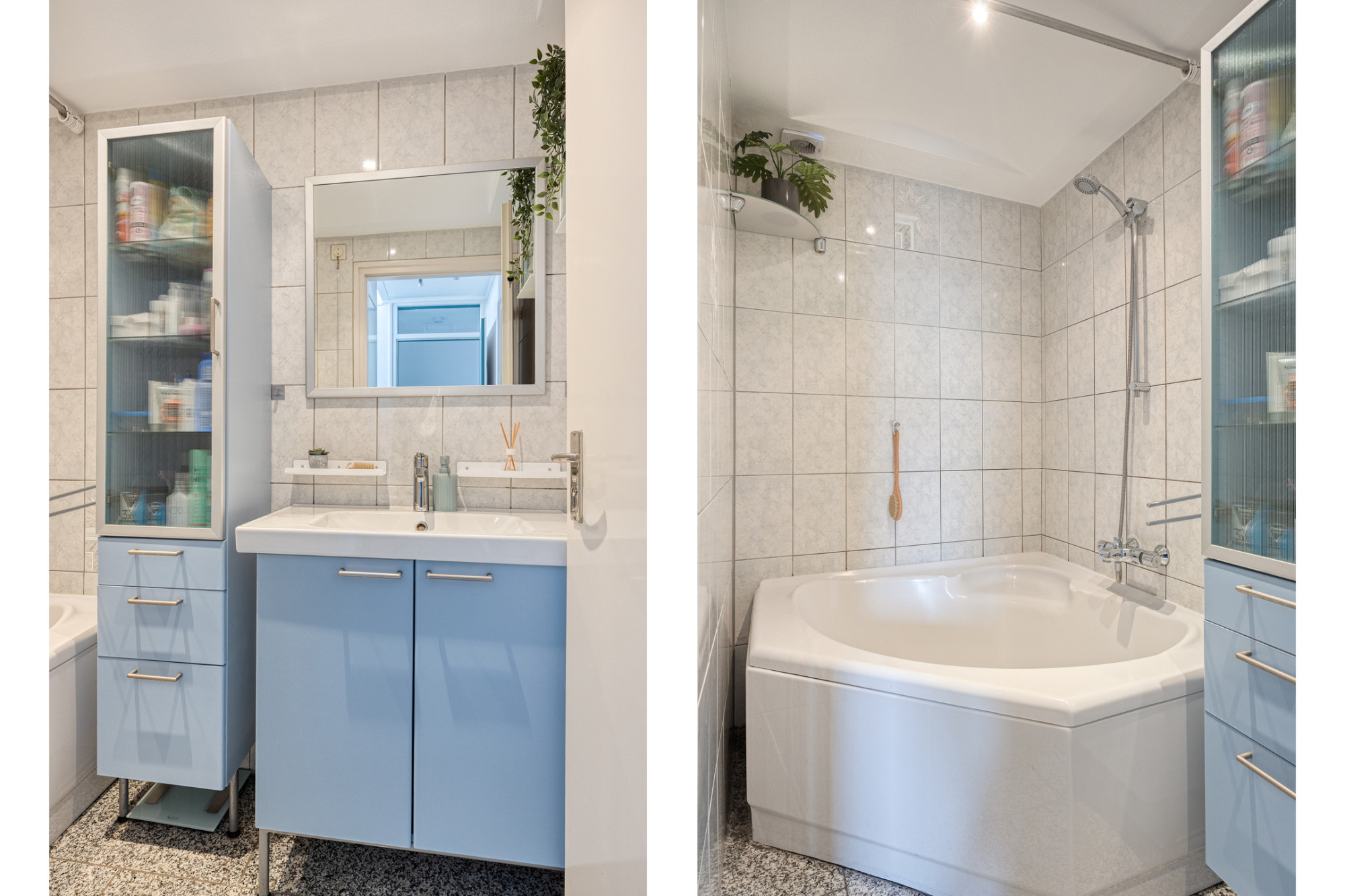 * GEHEEL BETEGELDE BADKAMER MET HOEK-ZITBAD EN WASTAFEL IN EEN BADKAMERMEUBEL