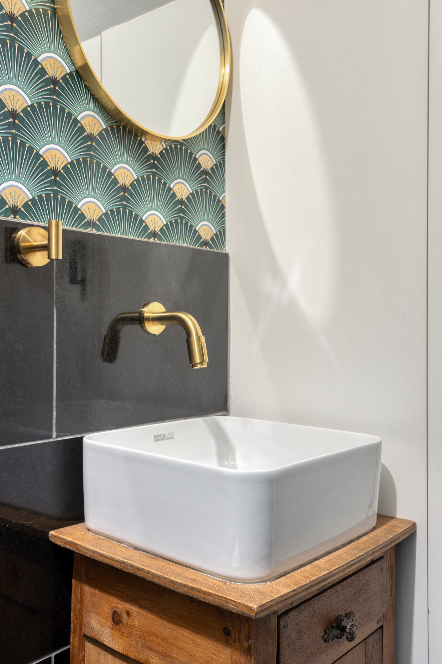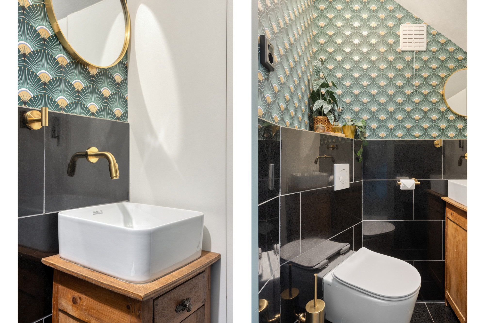 Het modern afgewerkte gastentoilet beschikt over een zwevend wandcloset en een waskom.