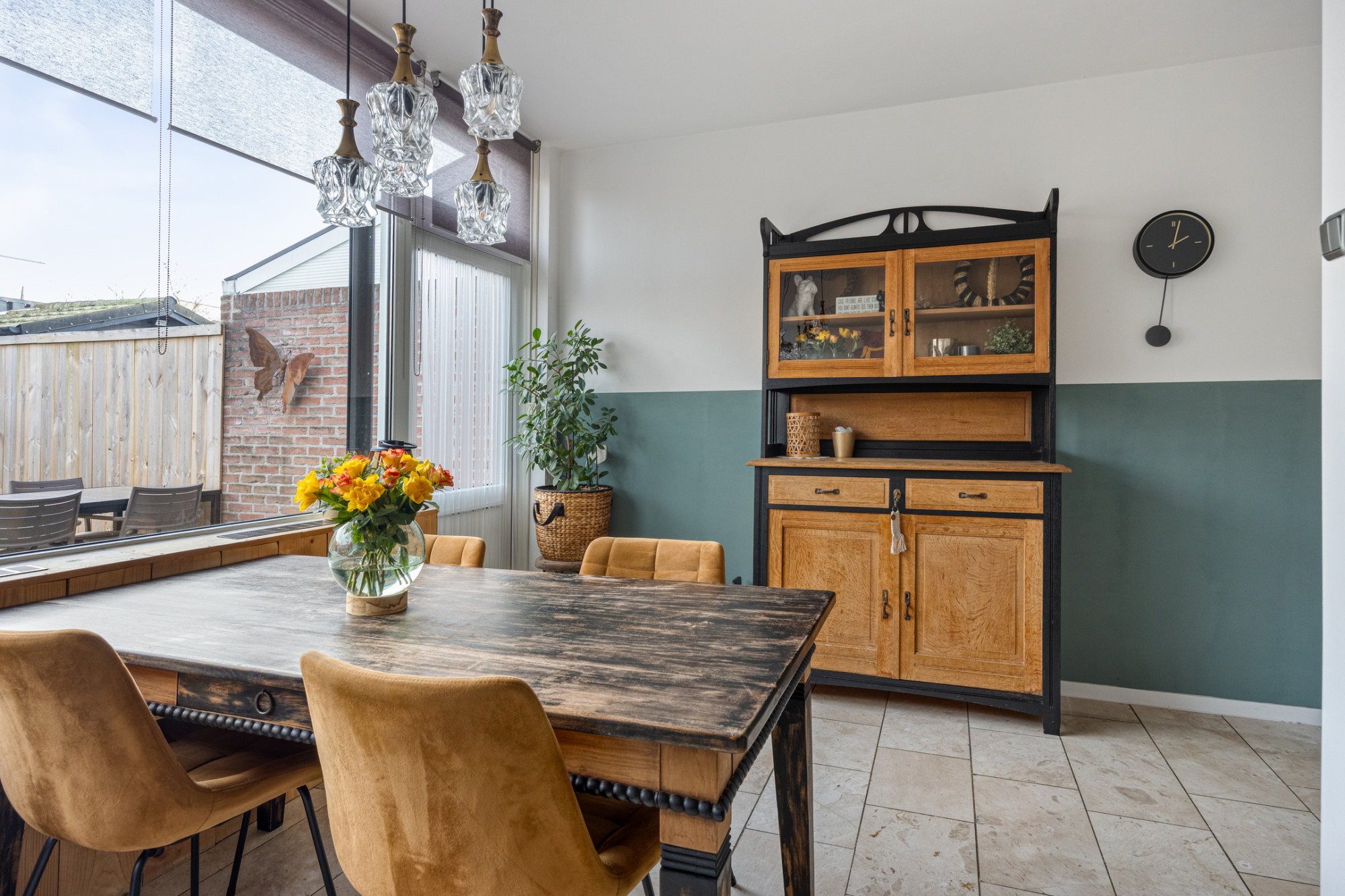De halfopen keuken is ingericht met een eigentijdse inbouwkeuken in hoekopstelling en voorzien van diverse apparatuur. Aansluitend bevindt zich de achtergelegen eethoek, welke via een loopdeur direct toegang biedt tot de achtertuin.