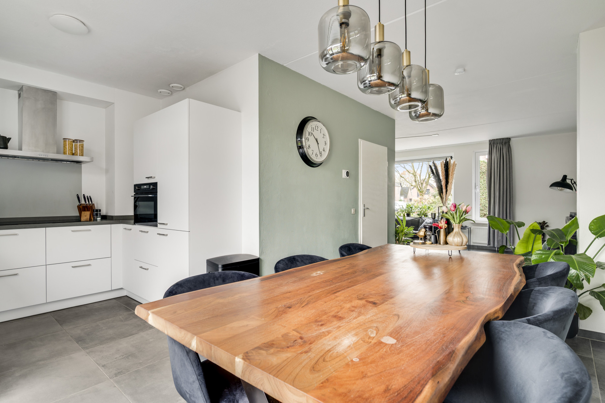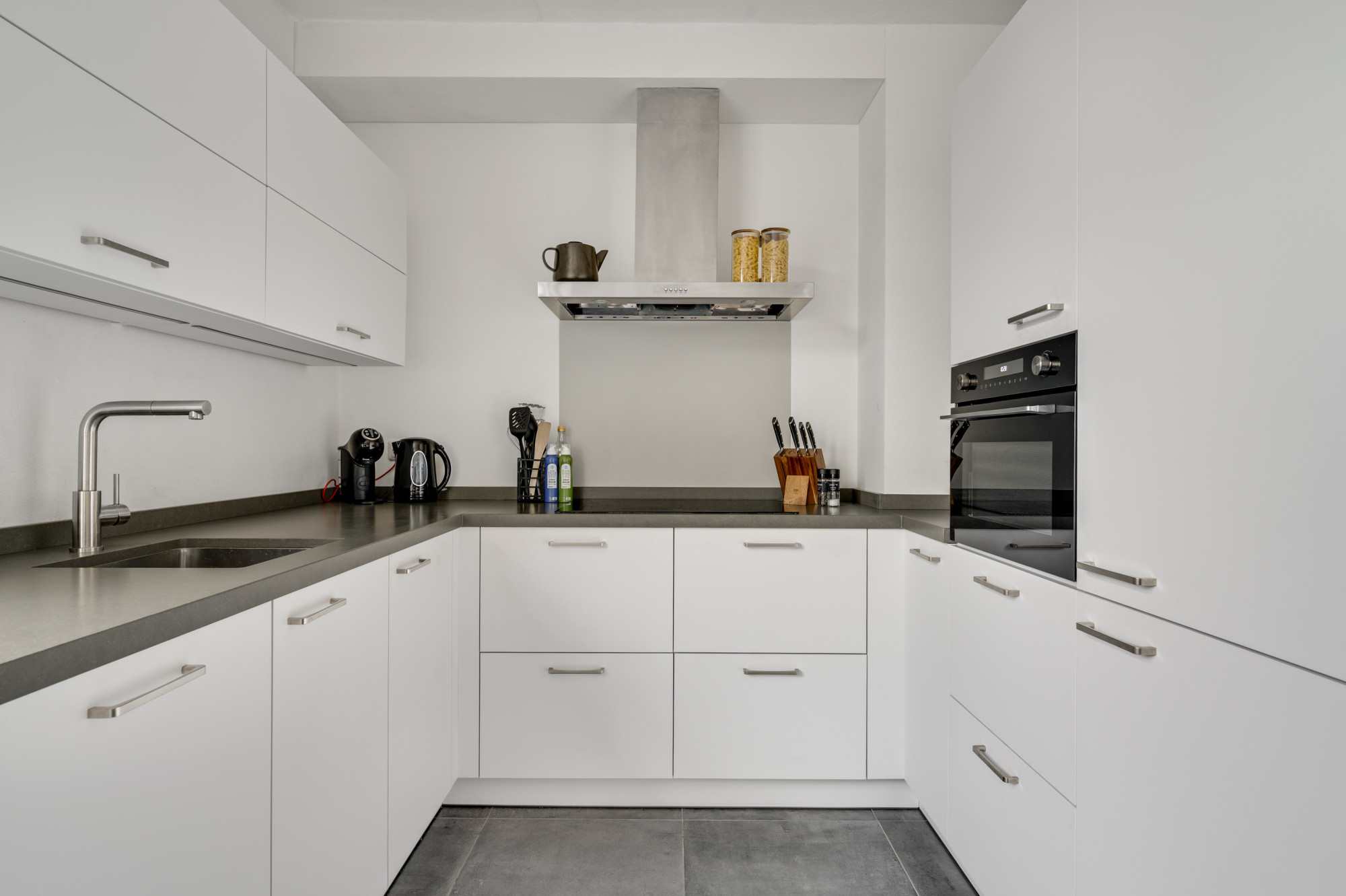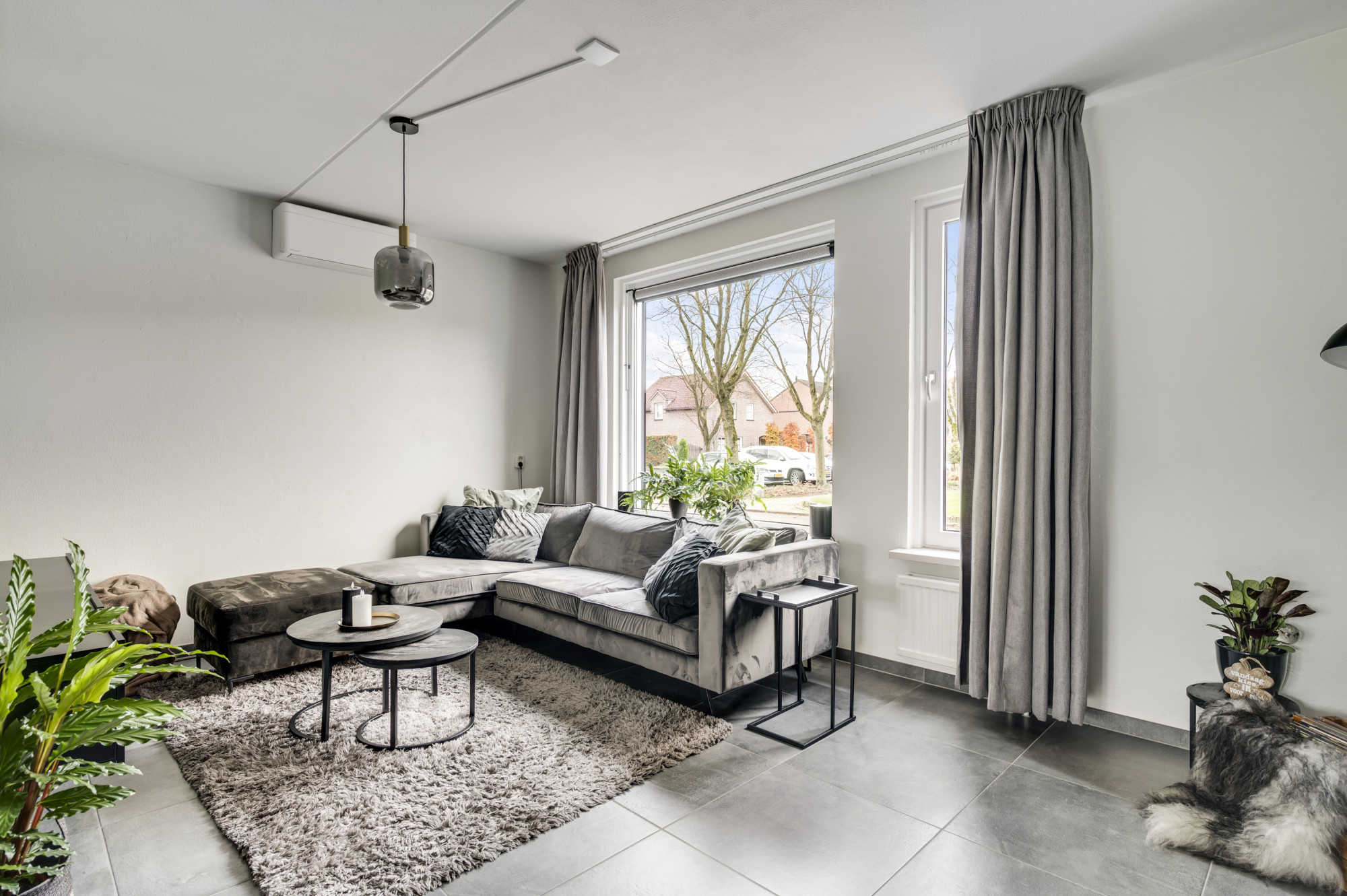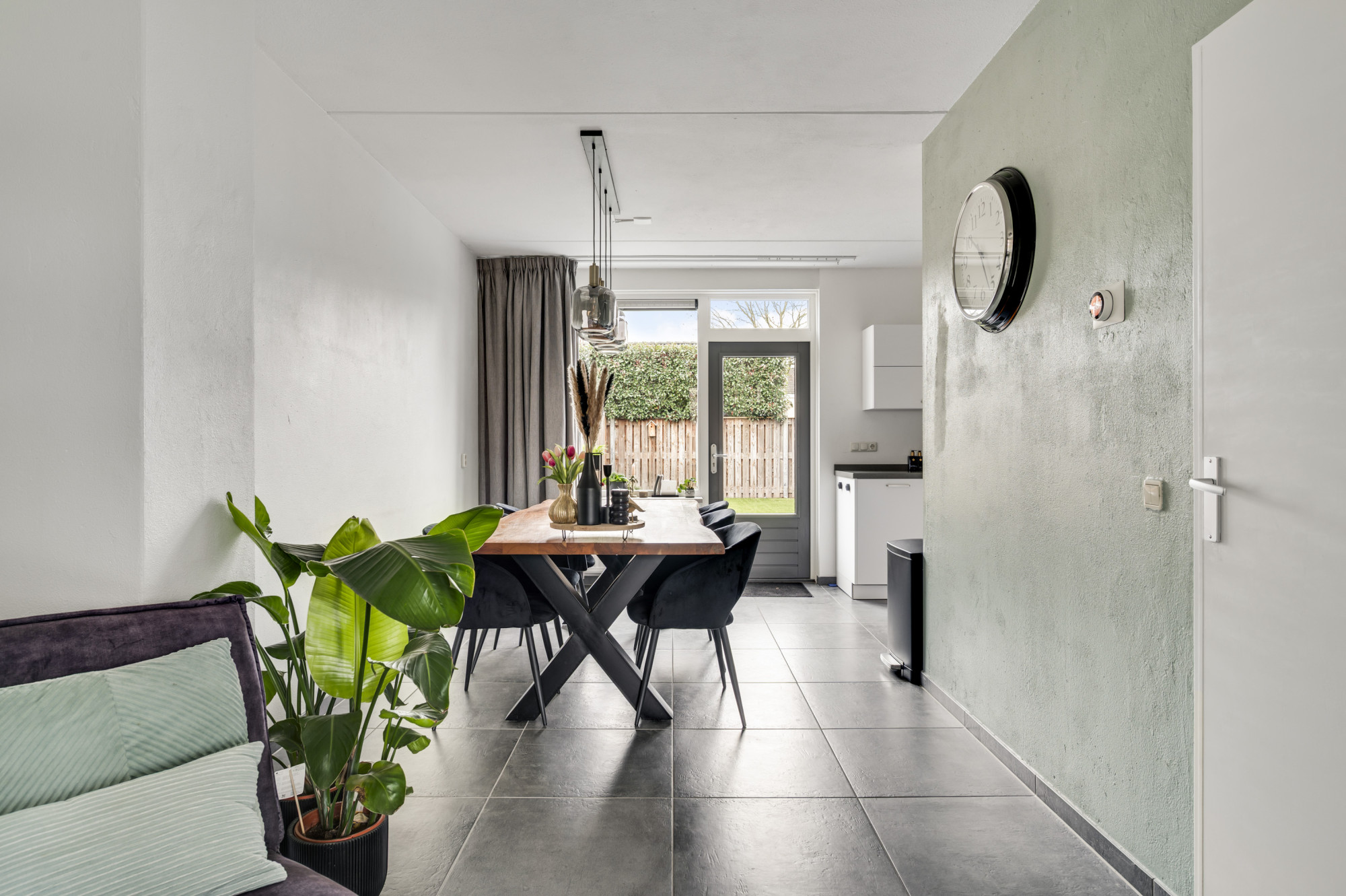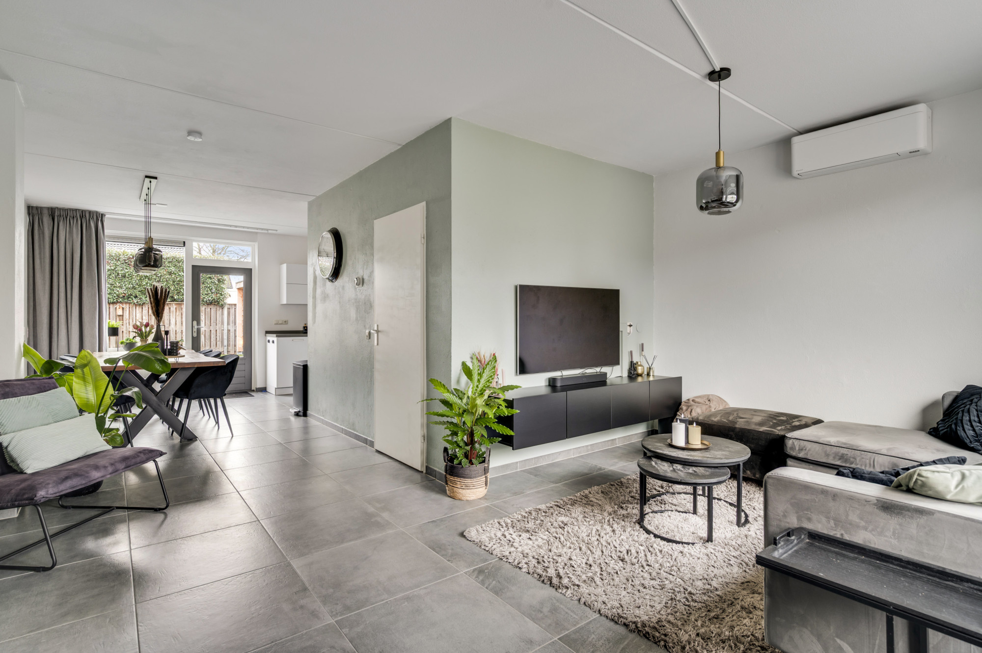 Via de hal bereikt u het moderne toilet, de meterkast, de trapopgang en de lichte L-vormige woonkamer. De ruimte is sfeervol en eigentijds afgewerkt met een luxe tegelvloer en beschikt over airconditioning. De open keuken sluit hier perfect op aan en is uitgerust met moderne inbouwapparatuur: een inductiekookplaat, RVS afzuigkap, koelkast, combi-oven en vaatwasser. Via de loopdeur loopt u direct de tuin in — praktisch en comfortabel in het dagelijks gebruik.