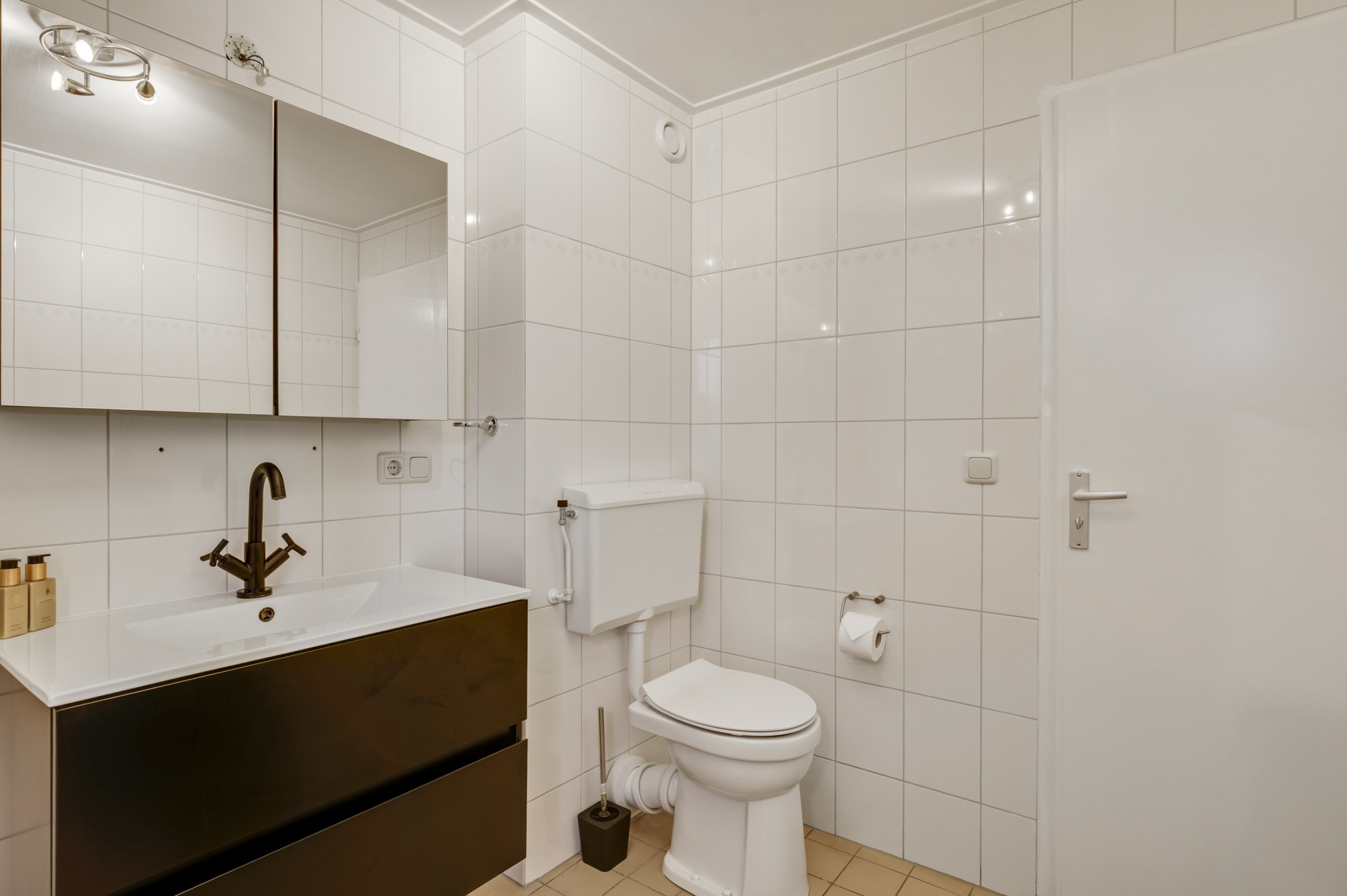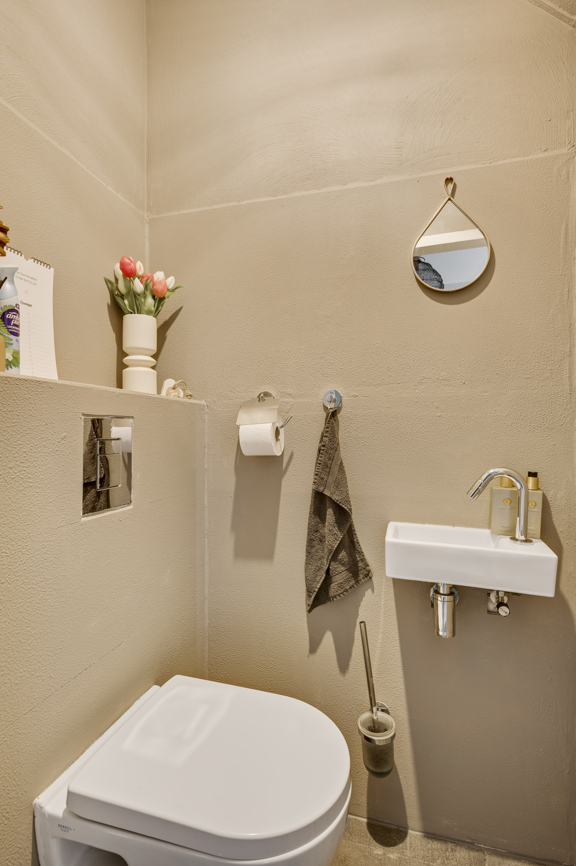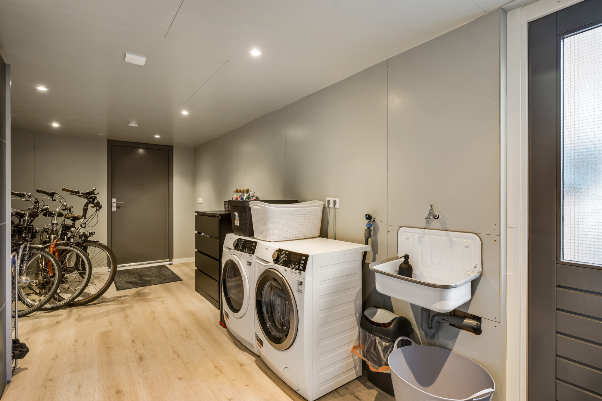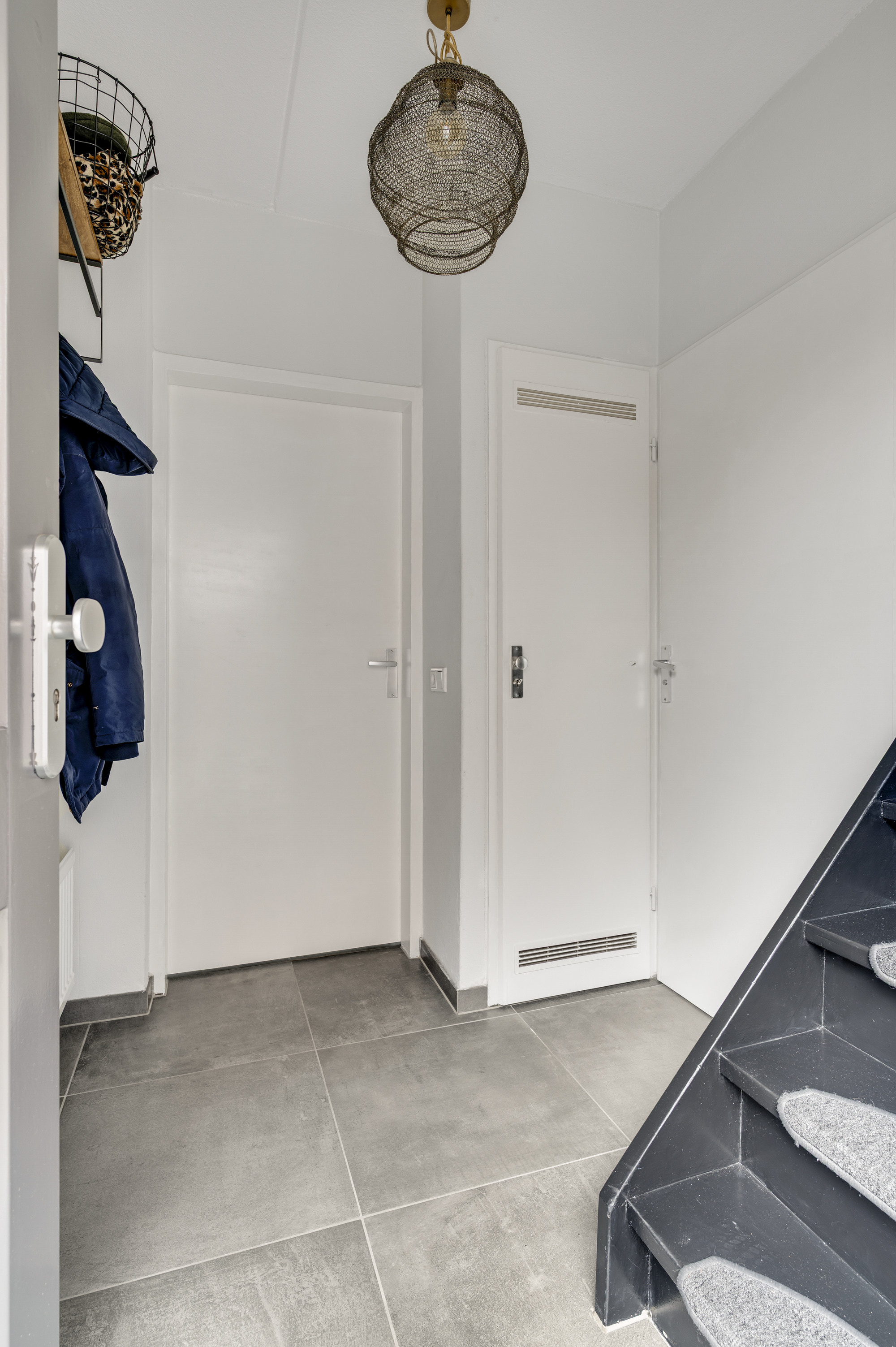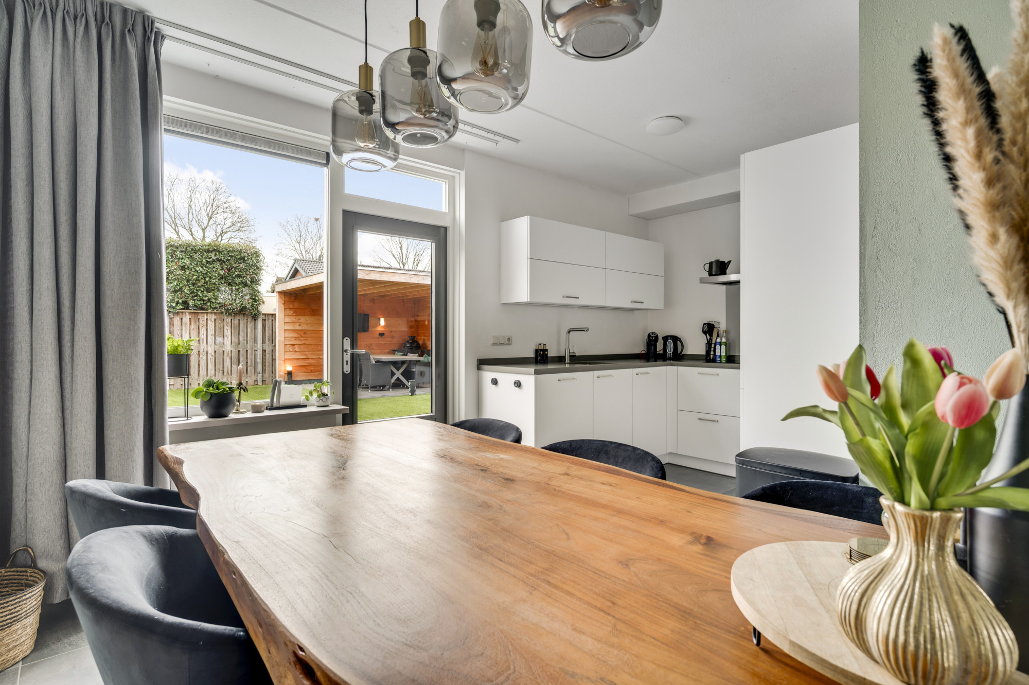 Via de hal bereikt u het moderne toilet, de meterkast, de trapopgang en de lichte L-vormige woonkamer. De ruimte is sfeervol en eigentijds afgewerkt met een luxe tegelvloer en beschikt over airconditioning. De open keuken sluit hier perfect op aan en is uitgerust met moderne inbouwapparatuur: een inductiekookplaat, RVS afzuigkap, koelkast, combi-oven en vaatwasser. Via de loopdeur loopt u direct de tuin in — praktisch en comfortabel in het dagelijks gebruik.