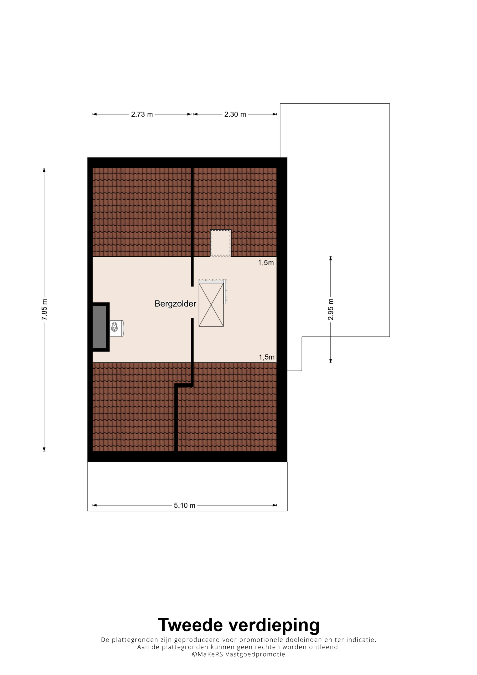 Via een vlizotrap bereikt u de royale zolderverdieping met dakraam. Deze biedt volop opbergmogelijkheden en indien gewenst kan hier een vaste trap worden geplaatst om een extra kamer te realiseren. Tevens bevindt zich hier de opstelling van de cv-installatie (Nefit Trendline HRC 30 CW5, eigendom, ca. 2023).
