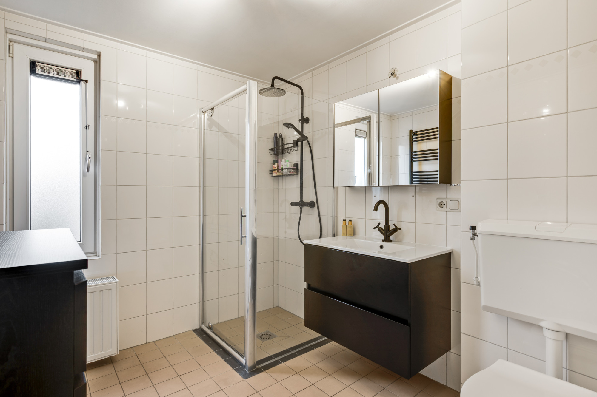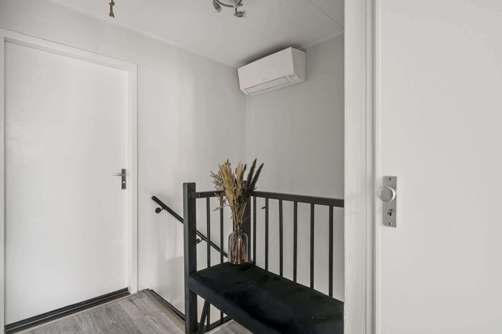 De overloop met airconditioning biedt toegang tot drie ruime en lichte slaapkamers, afgewerkt met een laminaatvloer. De badkamer is stijlvol vernieuwd en beschikt over een moderne regendouche, een fraai badkamermeubel, een toilet en aansluitingen voor wassen en drogen. Een muurkast op de overloop zorgt voor extra bergruimte.