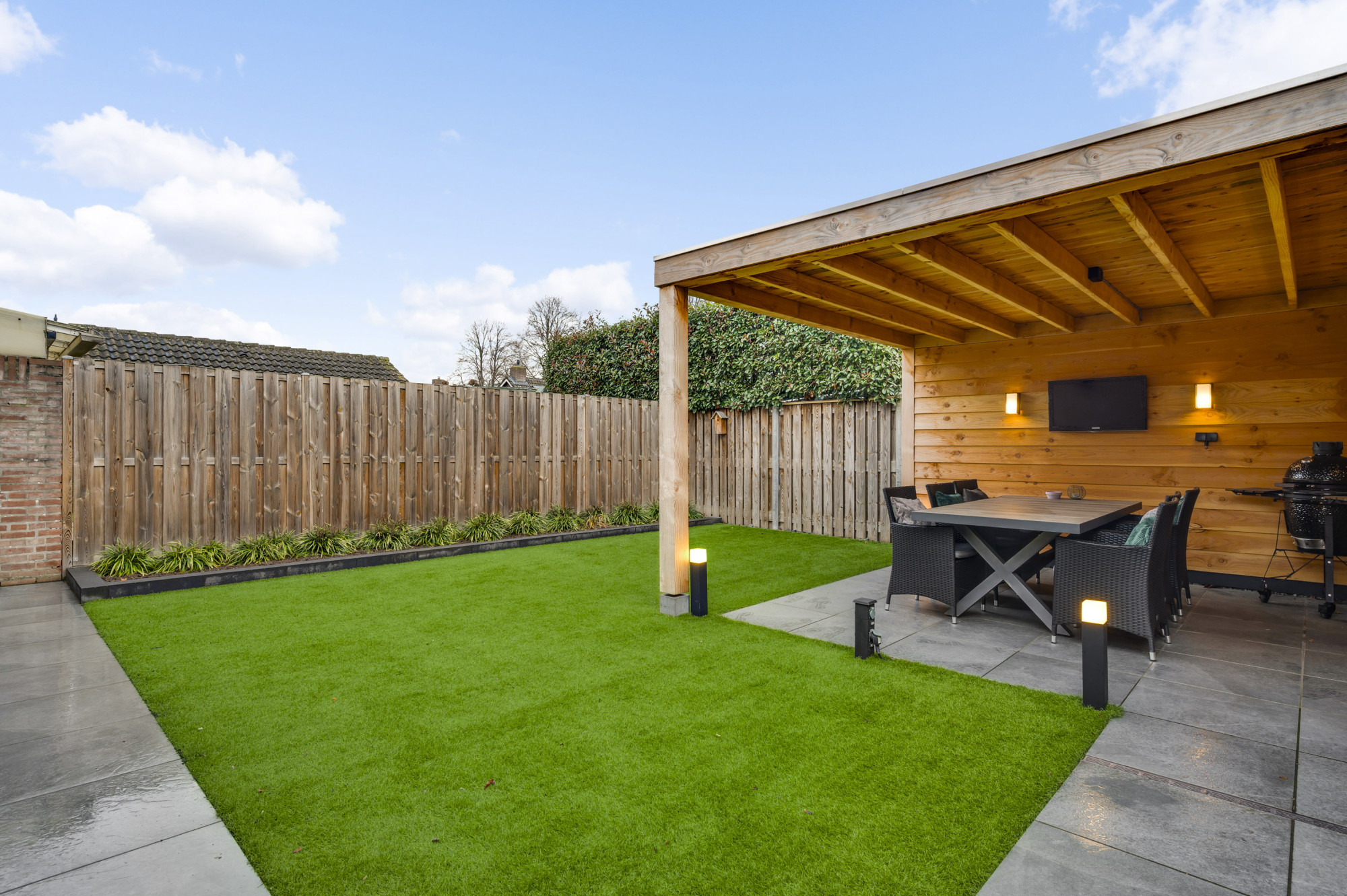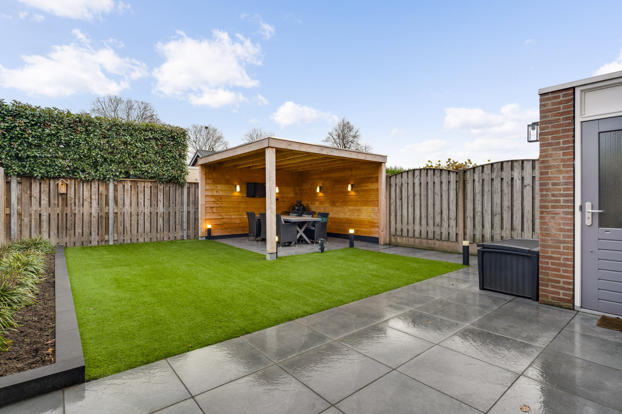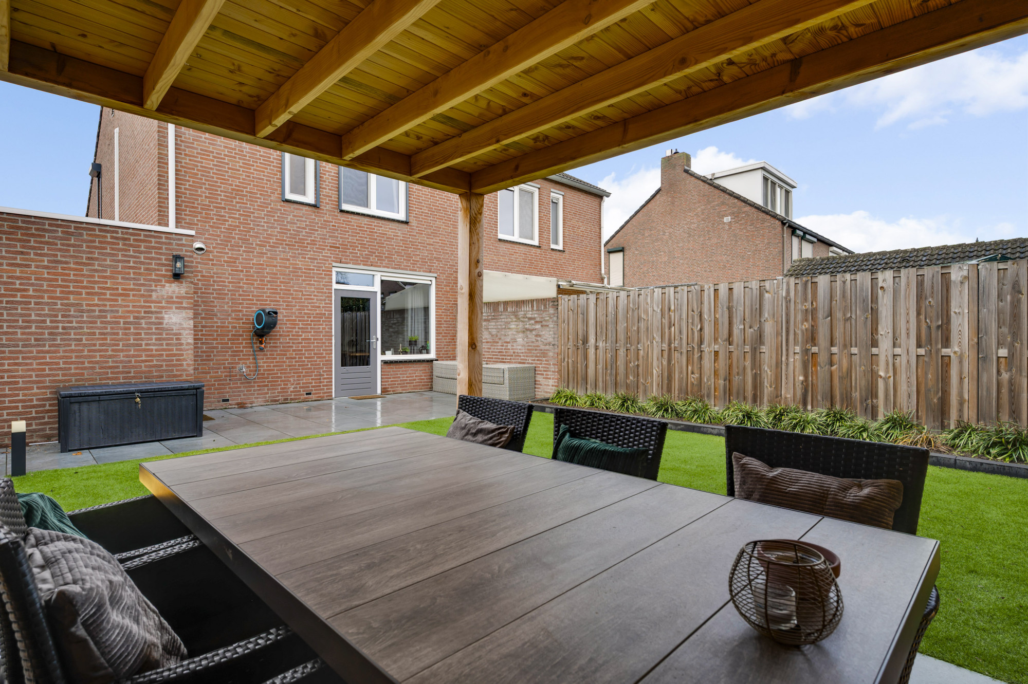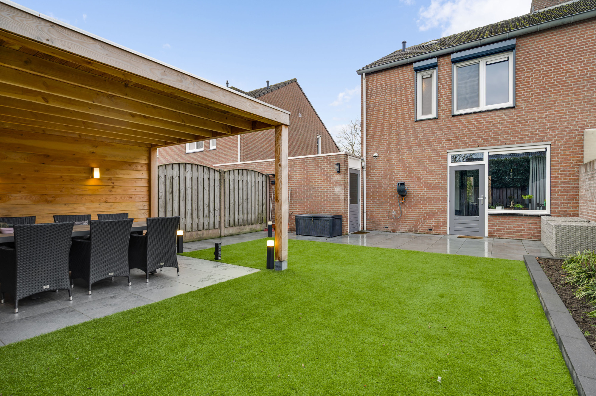 Er is een onderhoudsvriendelijke voortuin en een oprit die leidt naar de praktische garage, voorzien van vloerverwarming, elektra, de witgoedaansluitingen en een loopdeur naar de achtertuin. De achtertuin is recent opnieuw ingericht en voorzien van een royale overkapping, terras, kunstgazon en borders. De ligging op het noordoosten zorgt voor een prettige combinatie van zon en schaduw gedurende de dag.