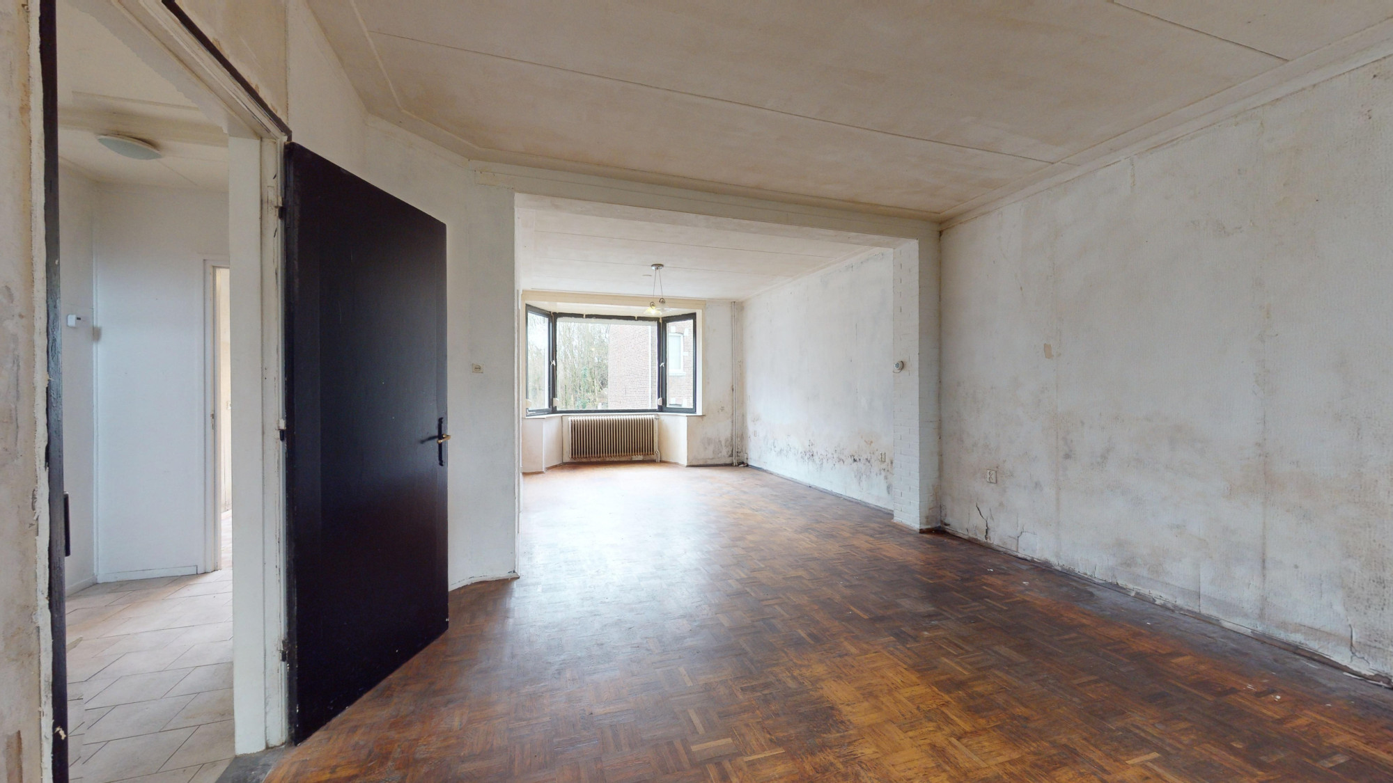 Ruime woonkamer 8,45 x 4,3/3,5 m) voorzien van parketvloer.