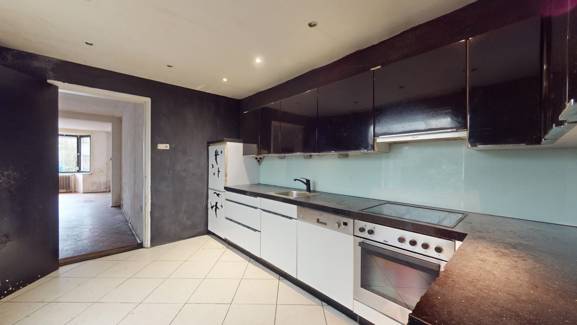Gesloten keuken (4,00 x 3,00 m) voorzien van plavuizen en uitgerust met een hoekopstelling met de volgende inbouwapparatuur: kookplaat, afzuigkap, oven en vaatwasser.