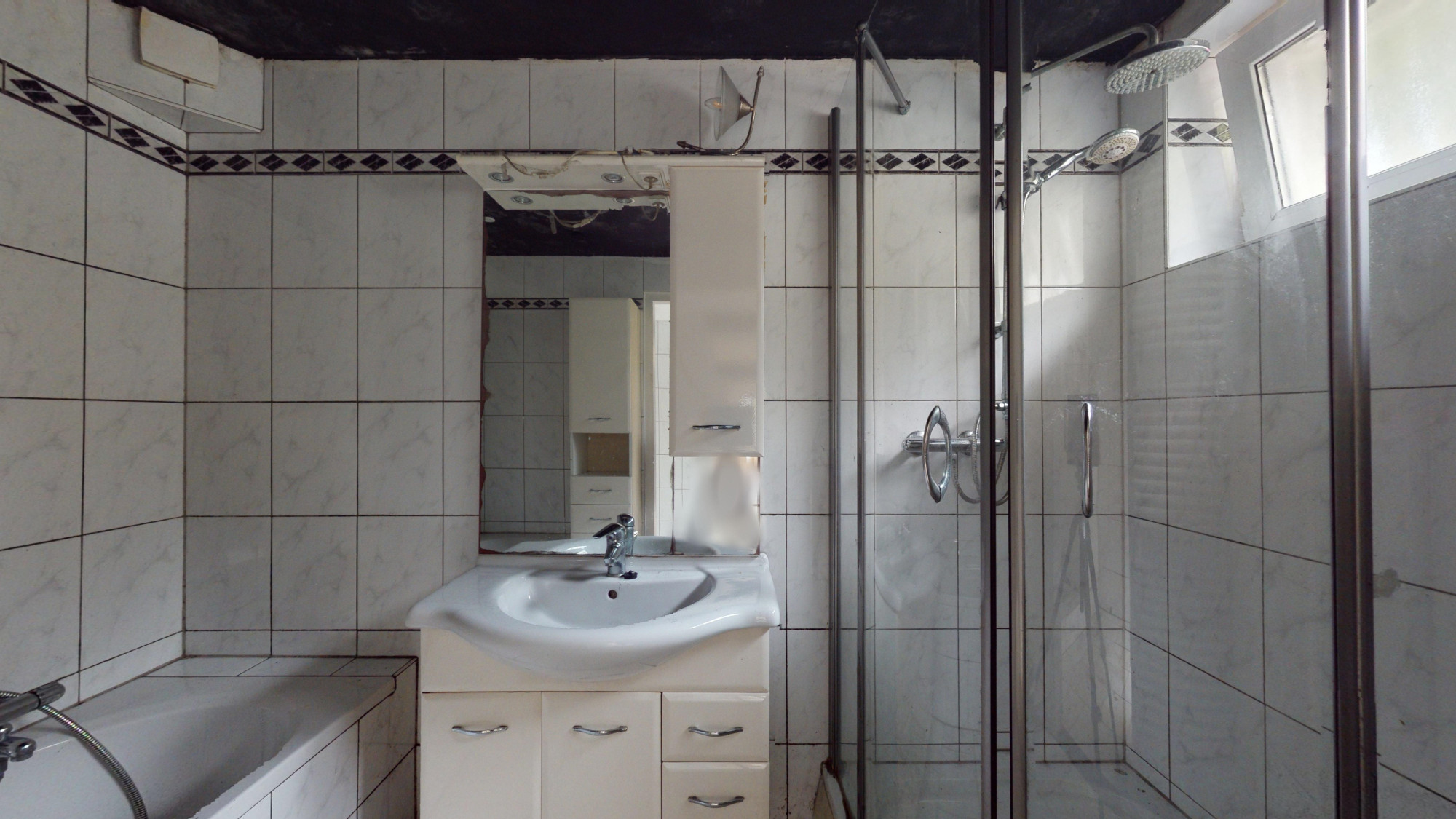 Badkamer 1 (3,00 x 1,90 m) uitgerust met een ligbad, douchecabine, wastafel en toilet.