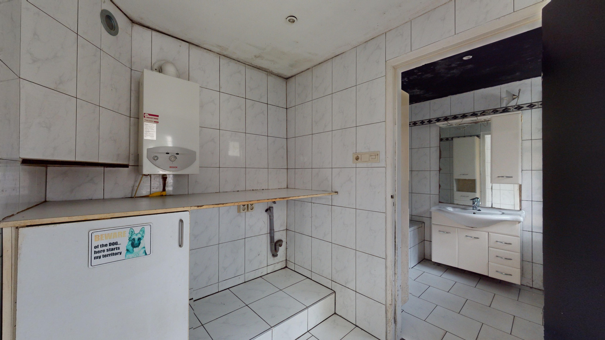 Bijkeuken/wasruimte (3,00 x 1,80 m) voorzien van plavuizen, alwaar aansluiting wasautomaten en toegang tot de achtertuin.