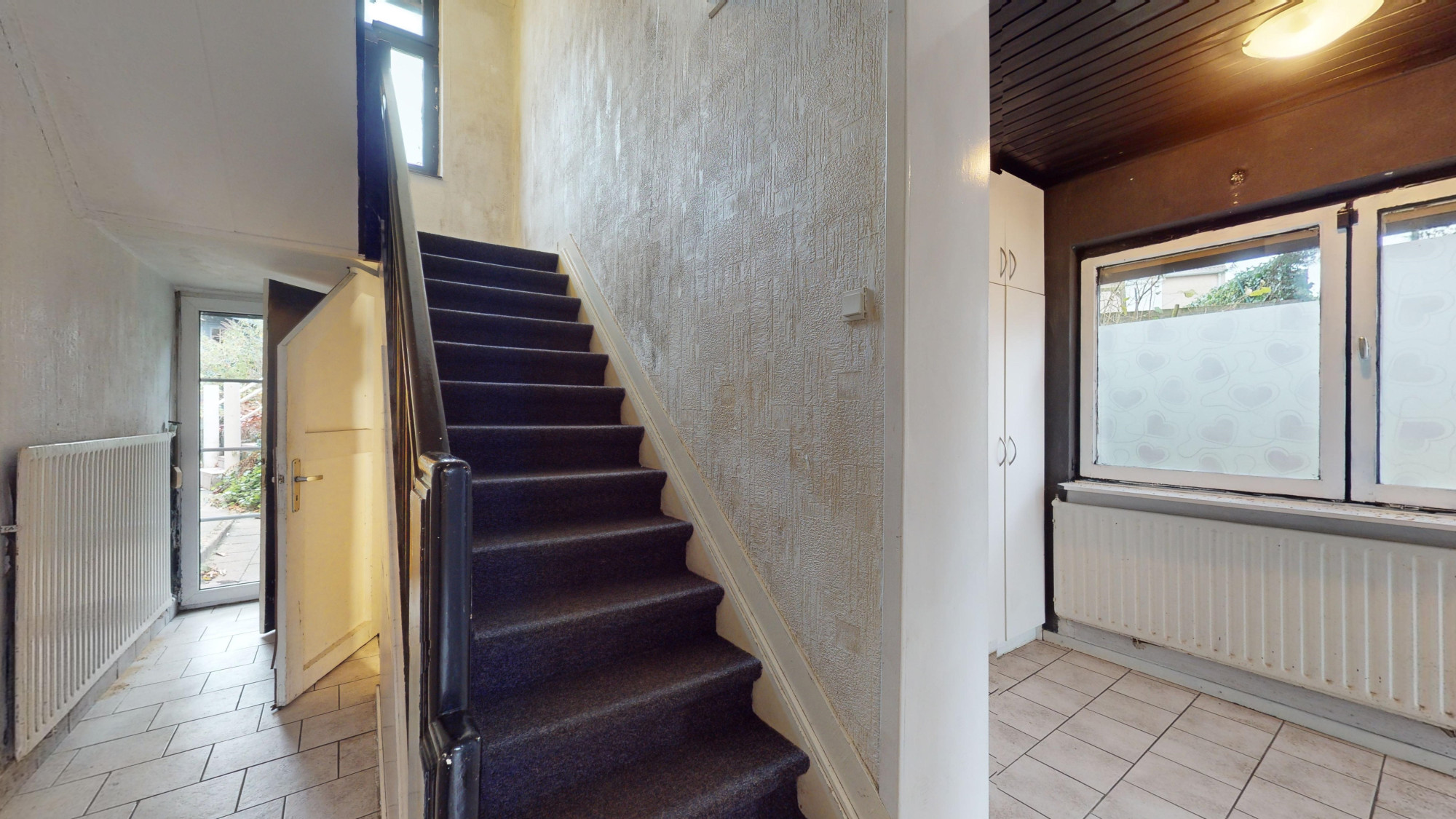 Tussenruimte (5,25 x 2 m) voorzien van plavuizen, alwaar trapopgang naar eerste verdieping, trapafgang naar het souterrain en toegang tot achtertuin.
