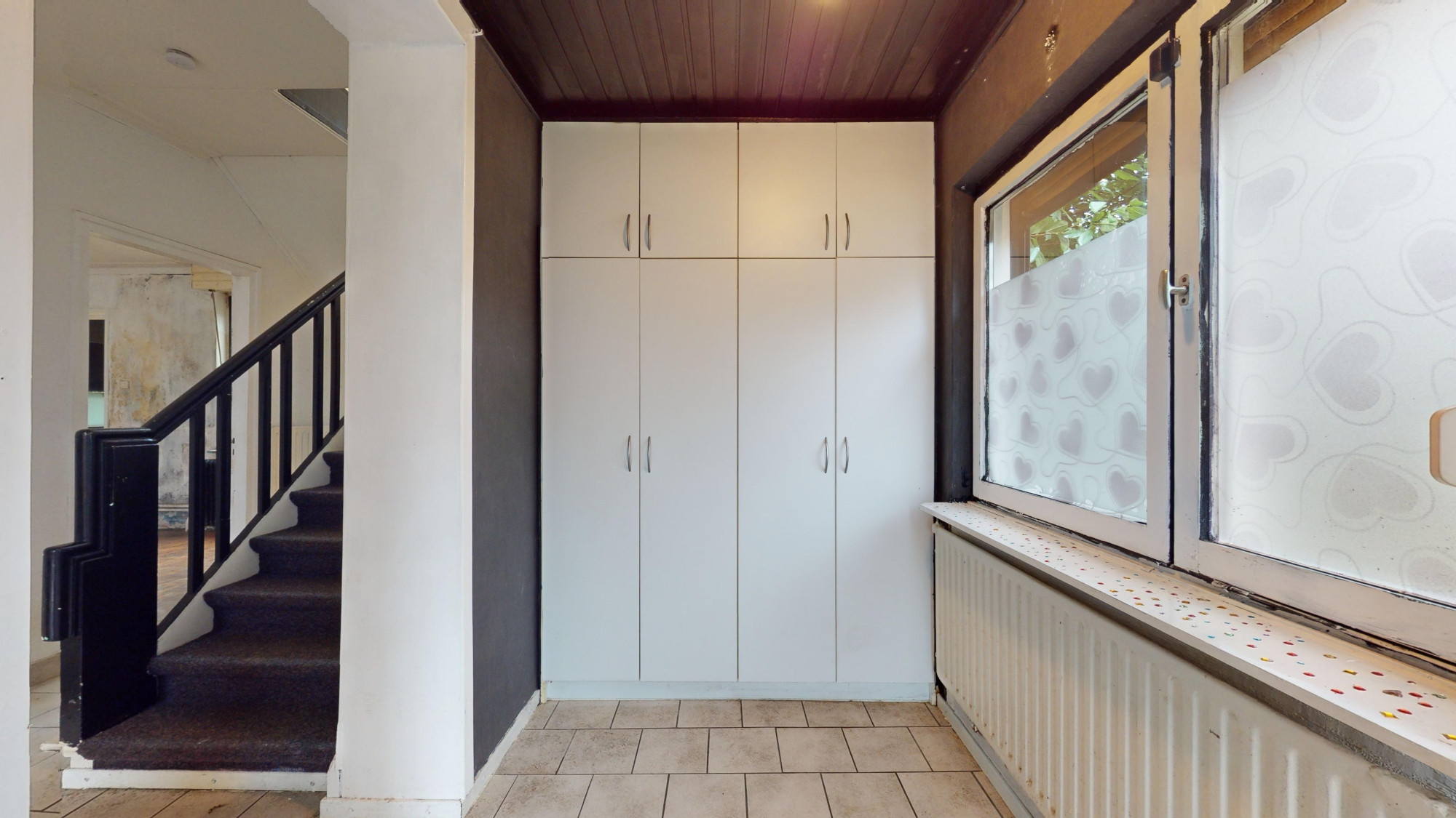 Ruime hal (3,35 x 1,70 m) voorzien van plavuizen en kastenwand, alwaar elektrische installatie.