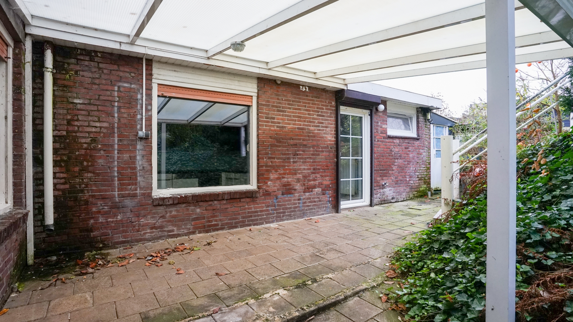 Onderste niveau (10 x 15/10 m) met een bestraat terras (10 x 4 m), riante overkapping (5 x 4 m), berging (3 x 1,5 m) en pad vanaf voorzijde van de woning.