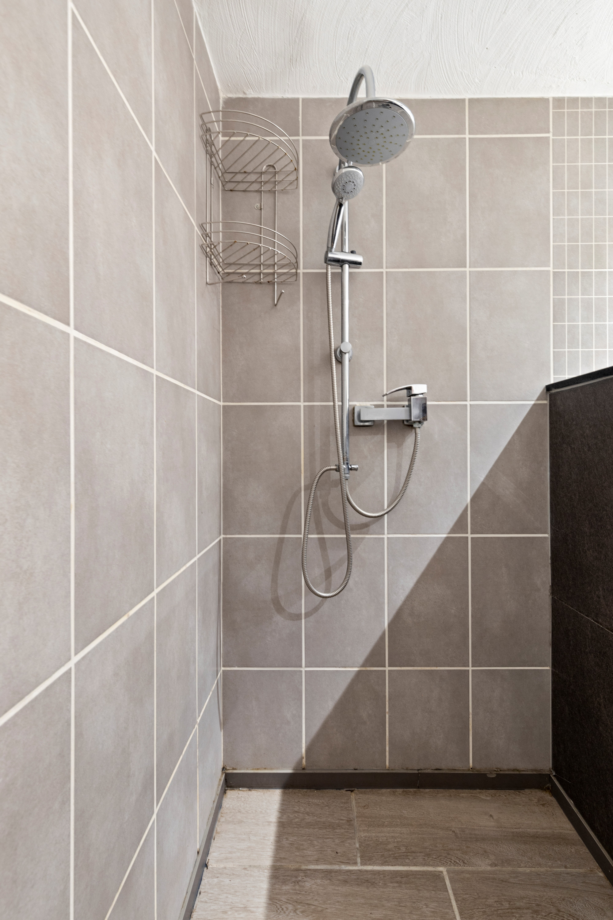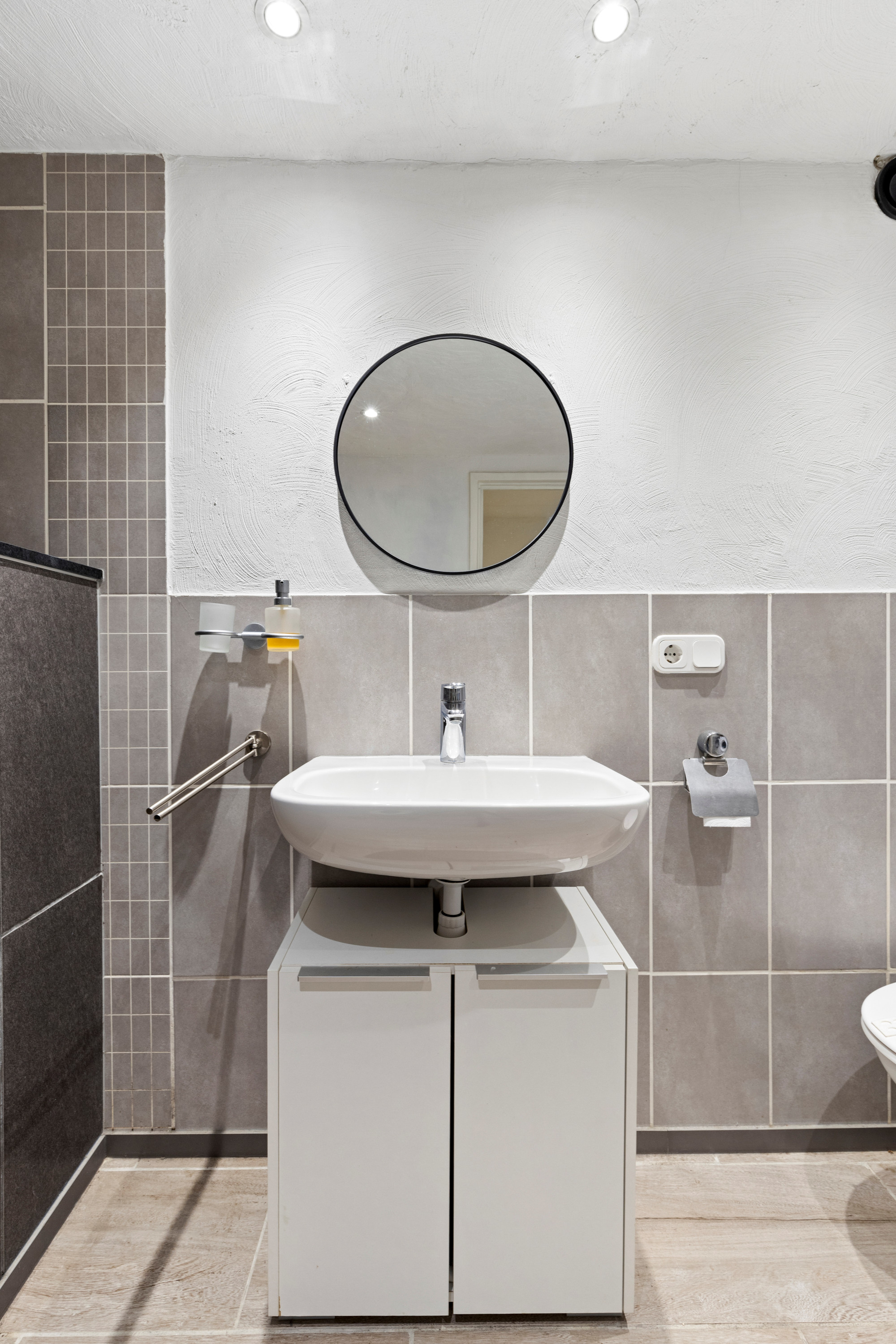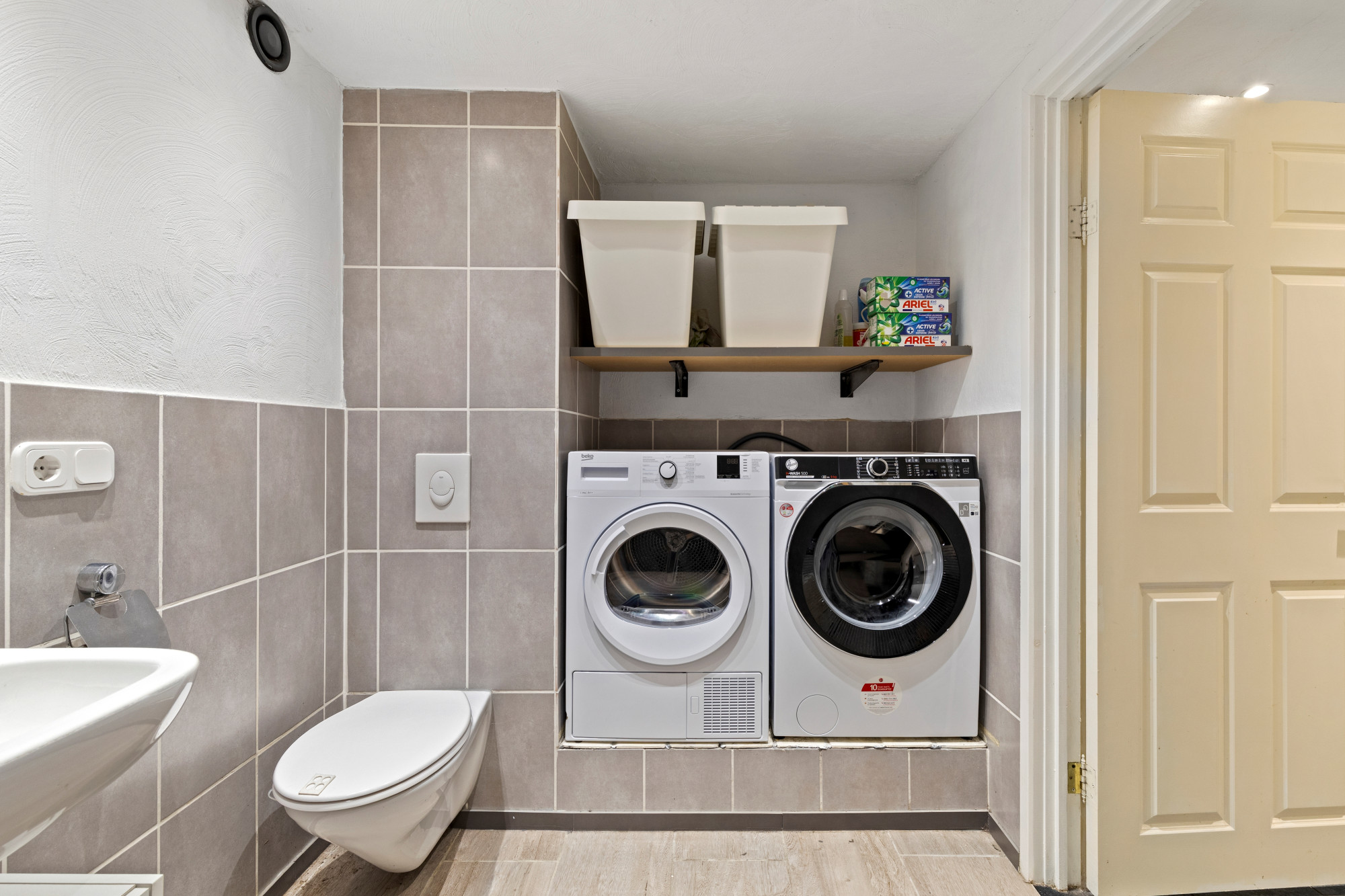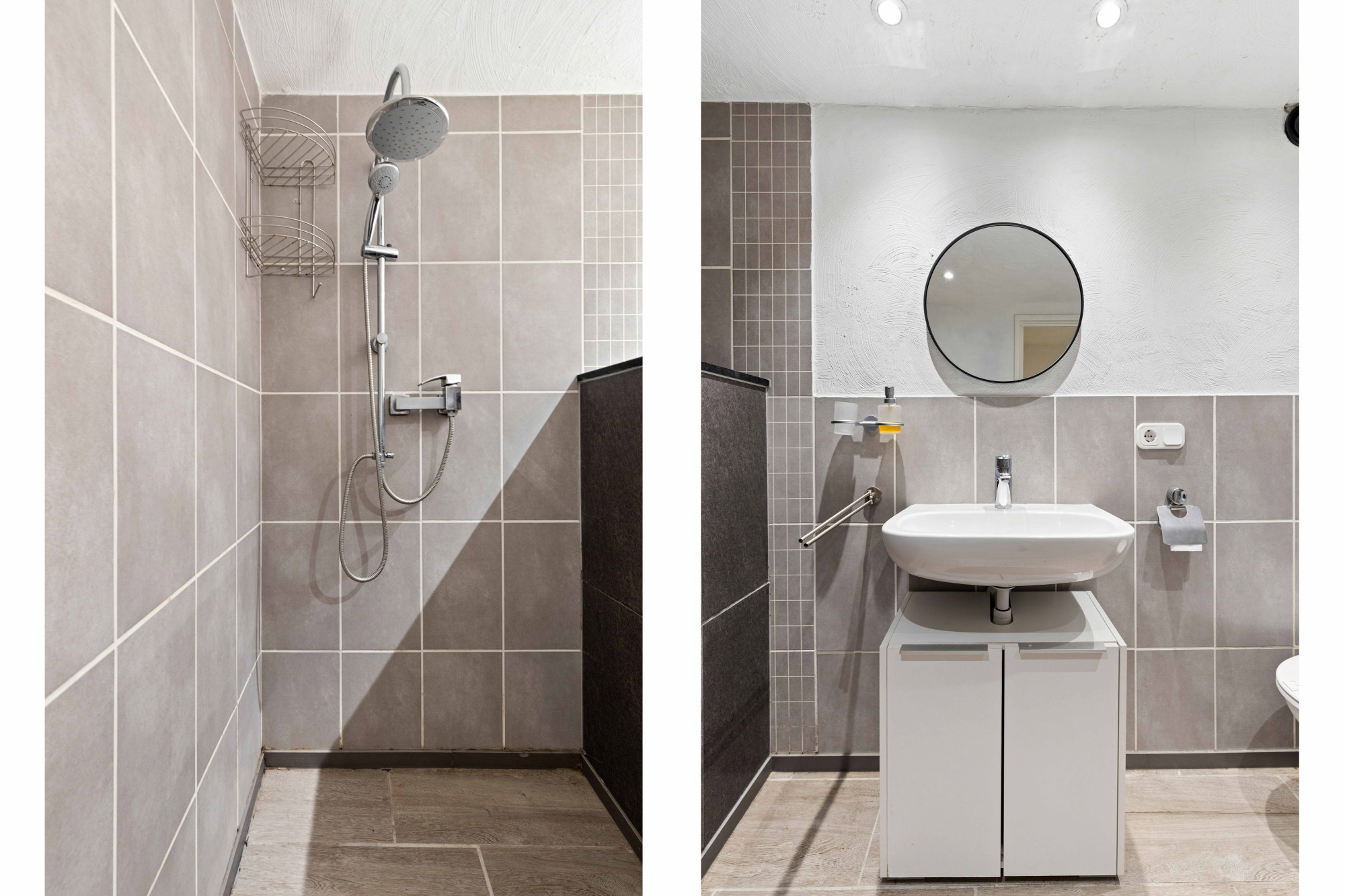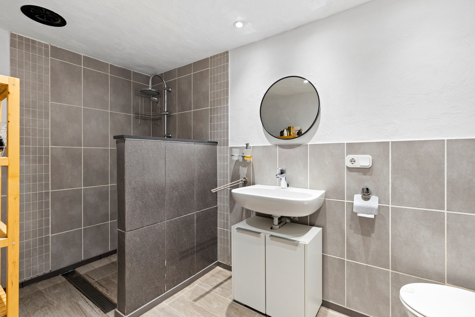 Betegelde badkamer v.v. inloopdouche, vaste wastafel, 2e toilet en aansluitpunt voor wasmachine en droger.
