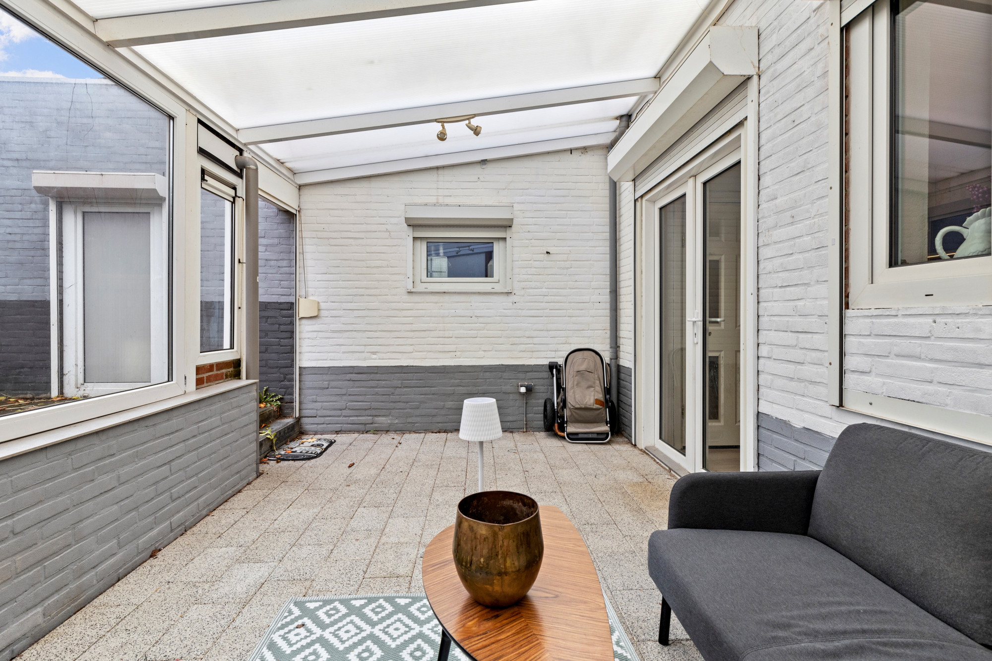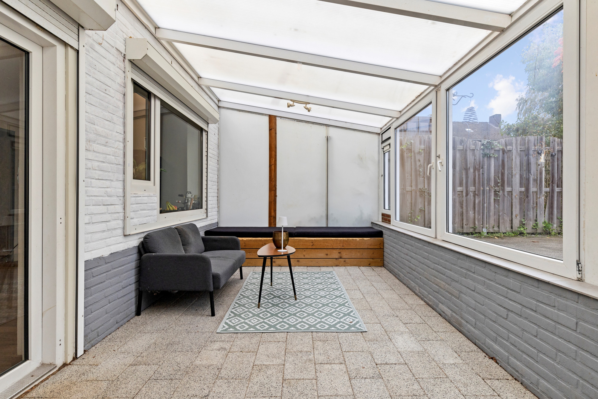 Ruime serre v.v. kunststoffen puien met dubbele beglazing en toegang naar de 14m diepe grotendeels beklinkerde achtertuin met houten tuinberging en naastgelegen overdekte opslag.