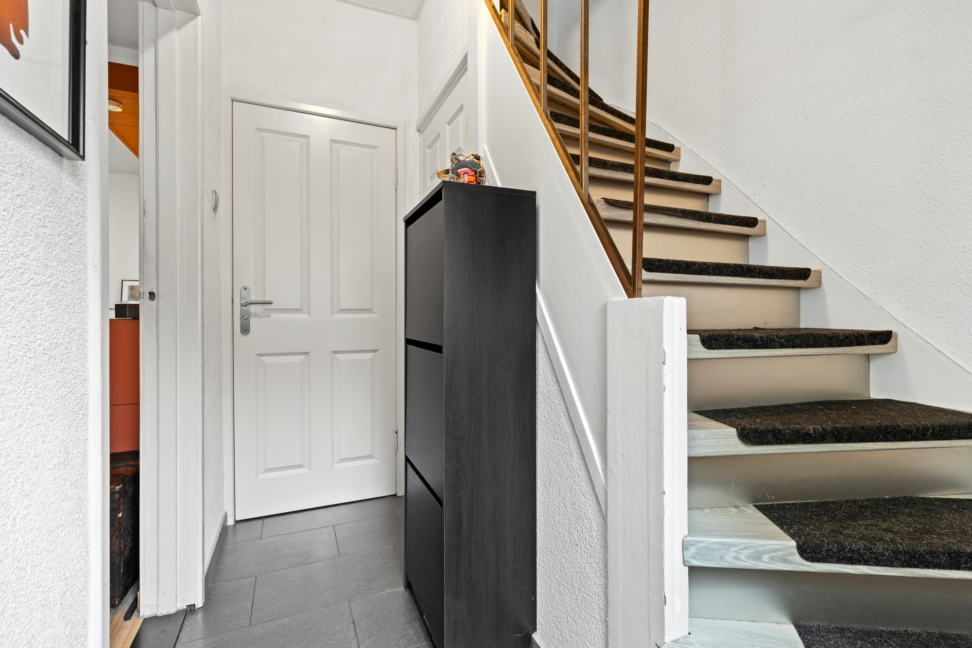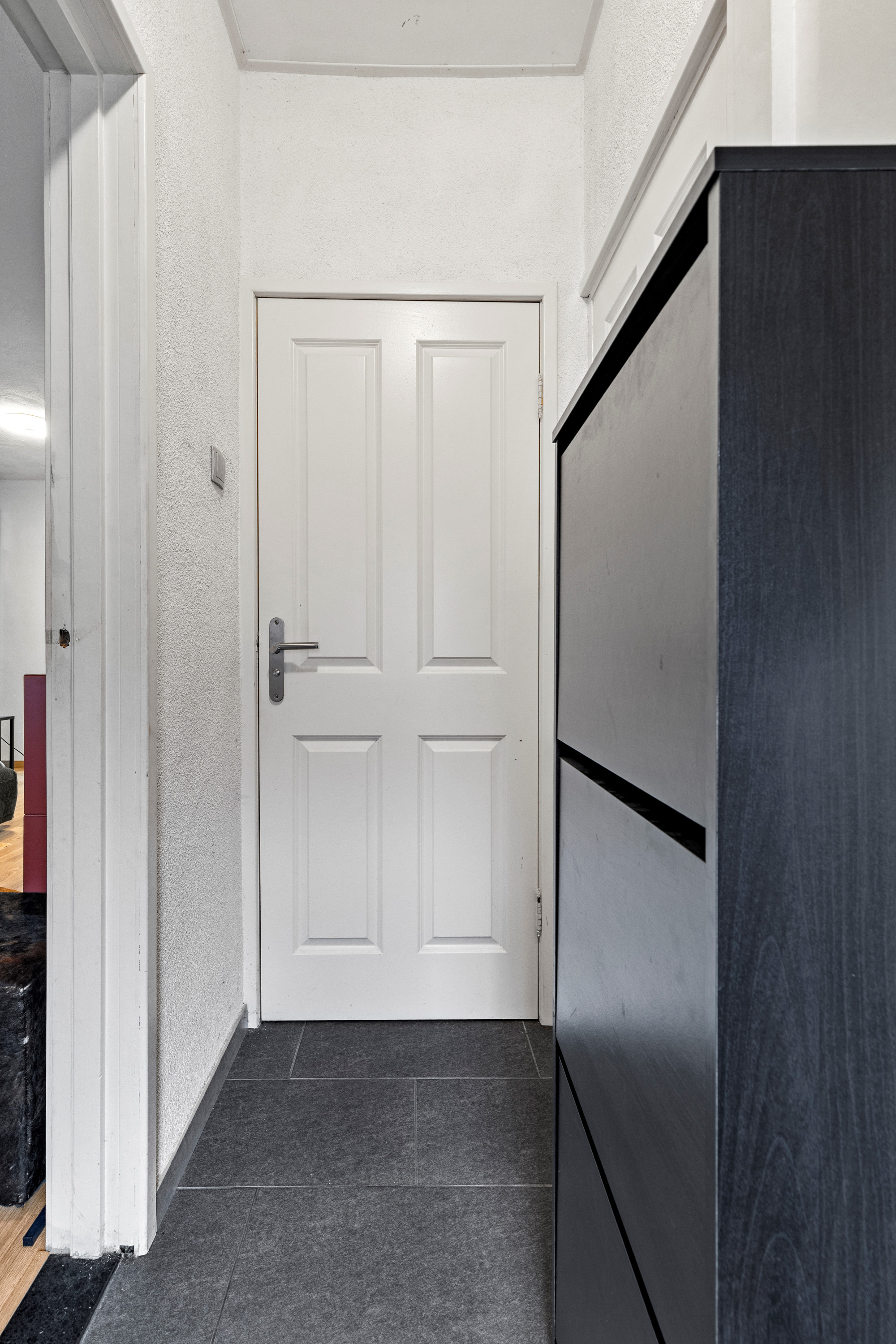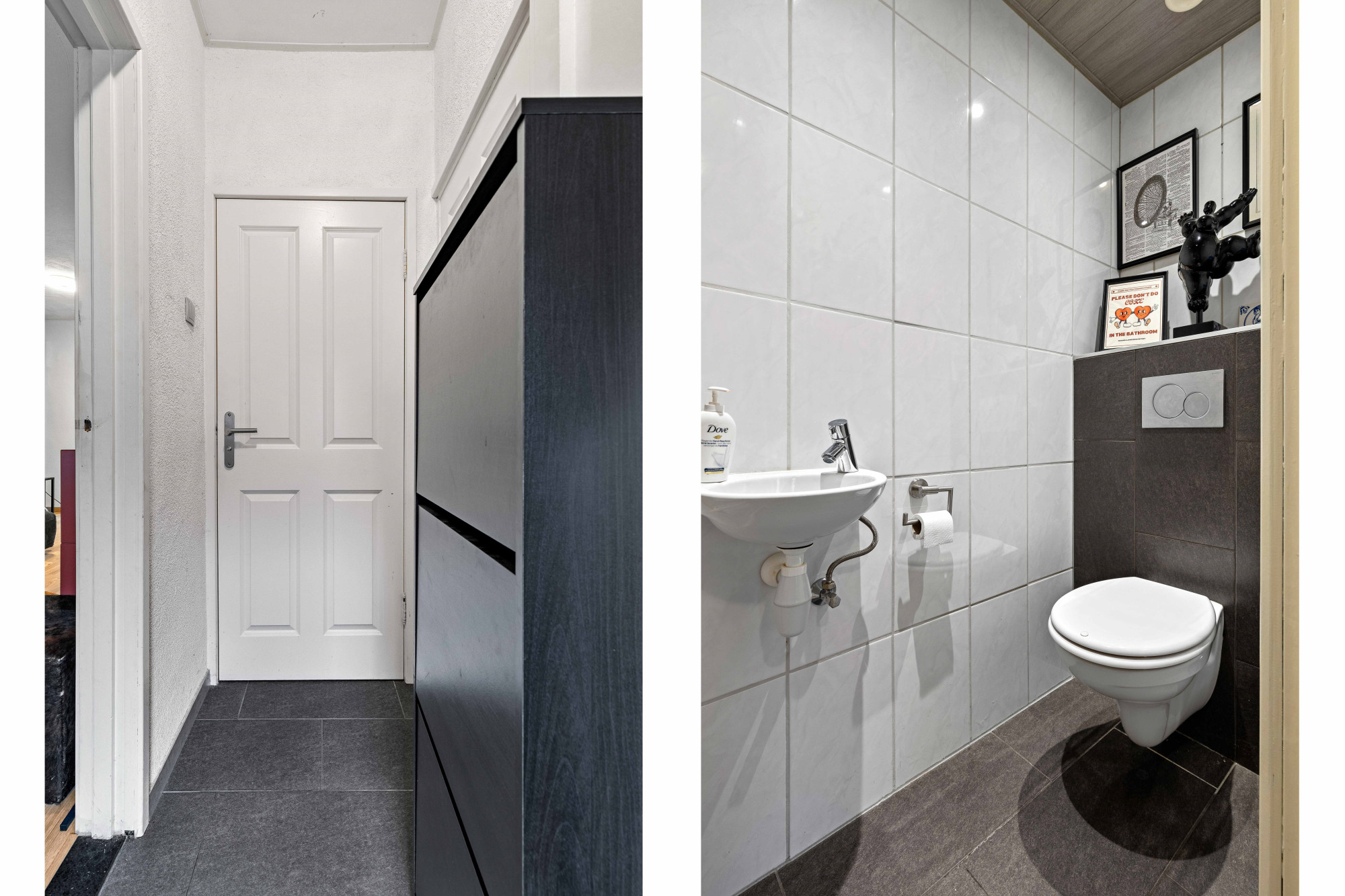 Hal/entree v.v. tegelvloer en meterkast, betegelde toiletruimte met fonteintje.