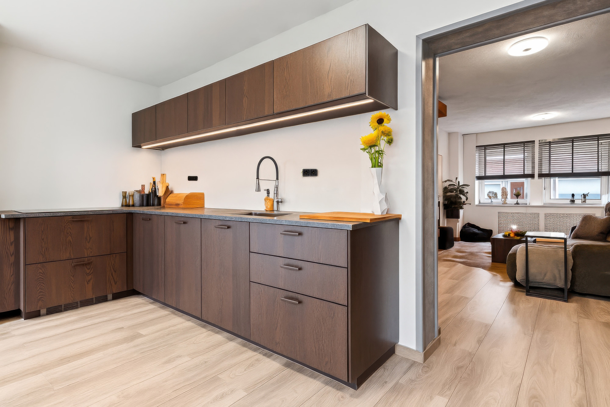 Royale L-woonkamer v.v. een laminaatvloer. Ruime aanbouw alwaar moderne keukeninstallatie (1 jaar oud) incl. apparatuur, te weten, vaatwasser, inductie kookplaat incl. kookveldafzuiging, losse koelkast. Via de aanbouw middels een dubbele deur toegang naar de achtergelegen serre.