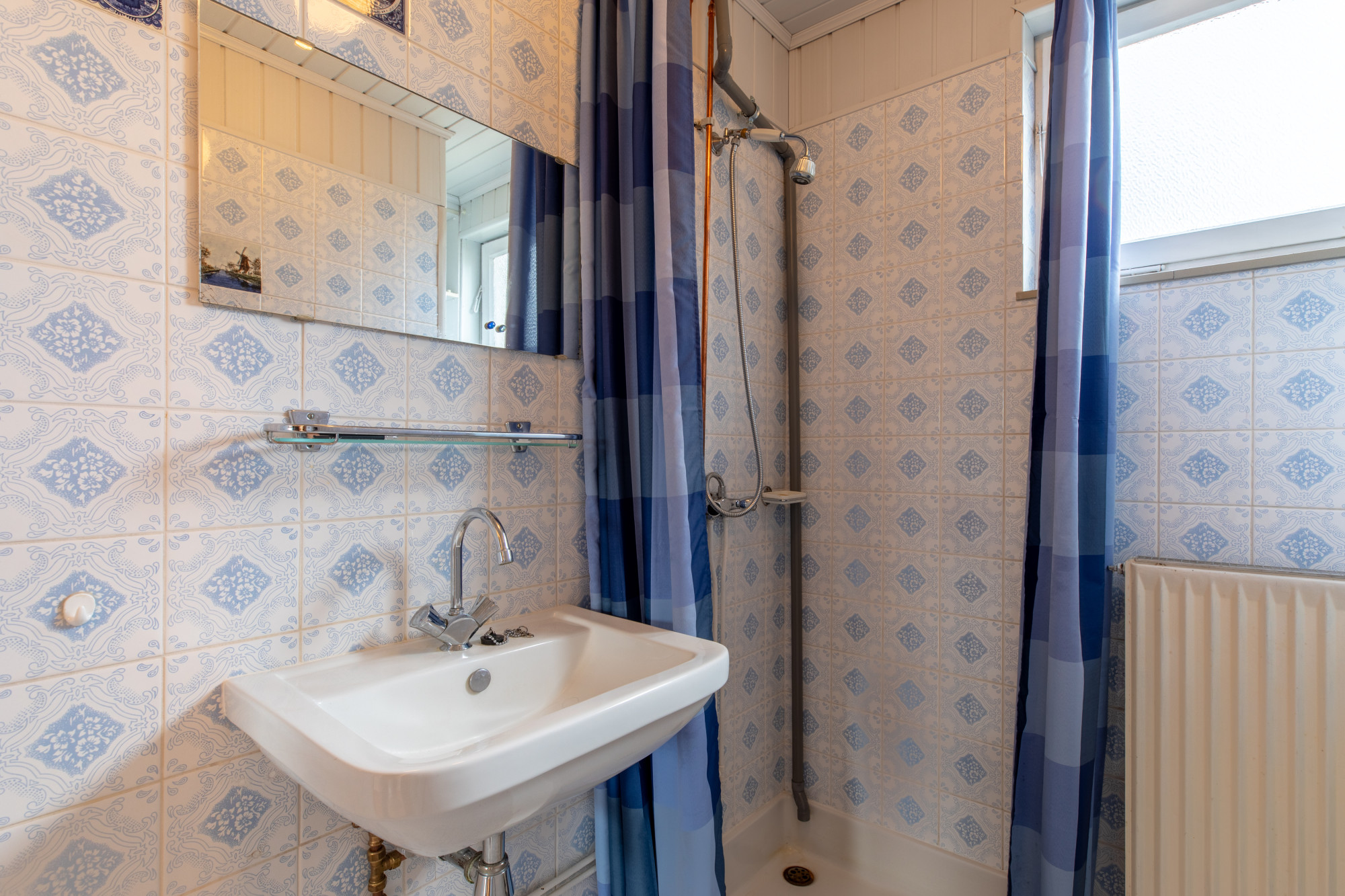 Betegelde compacte badkamer (2.11 x 1.31 m) met douche en vaste wastafel.