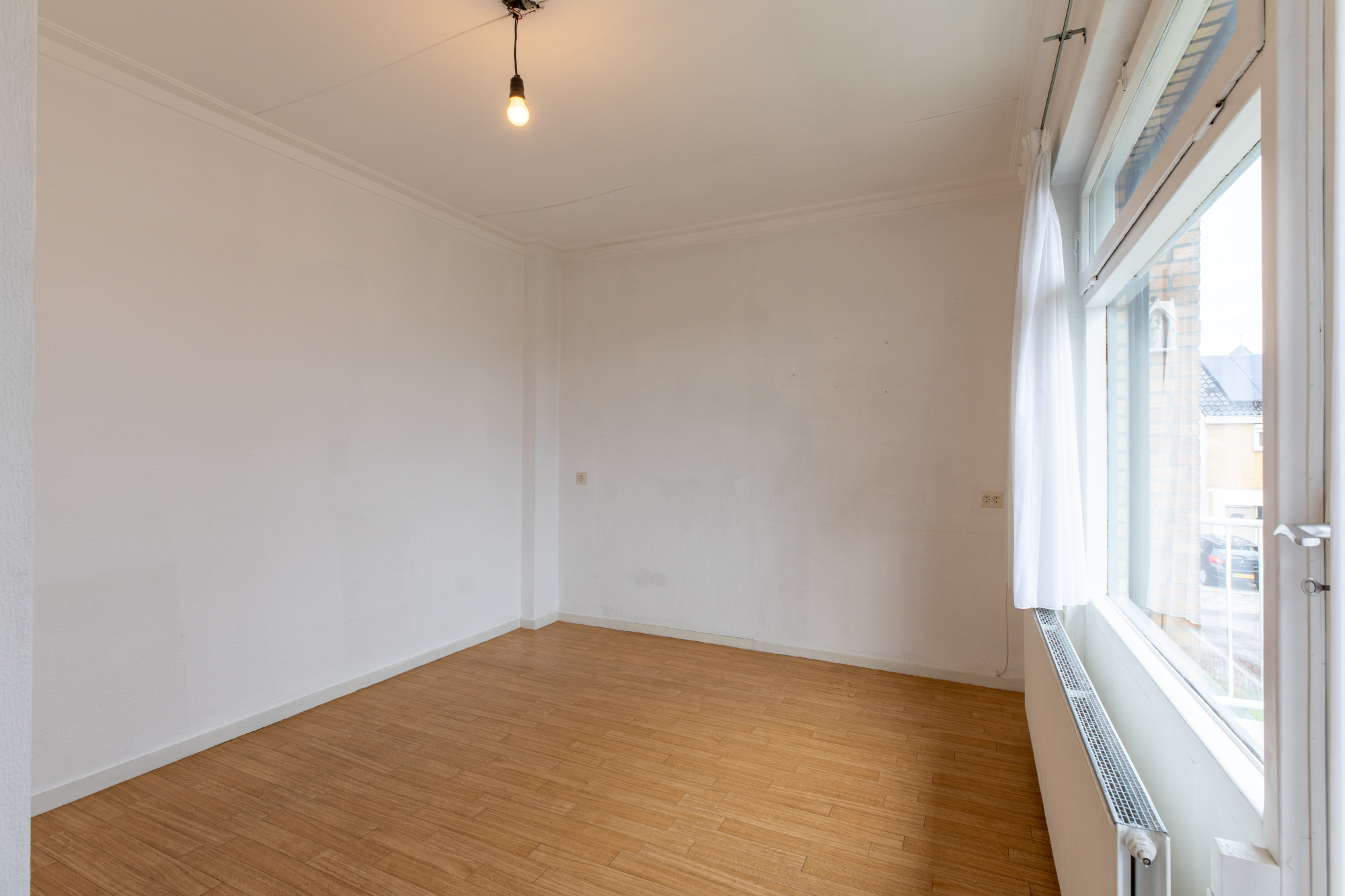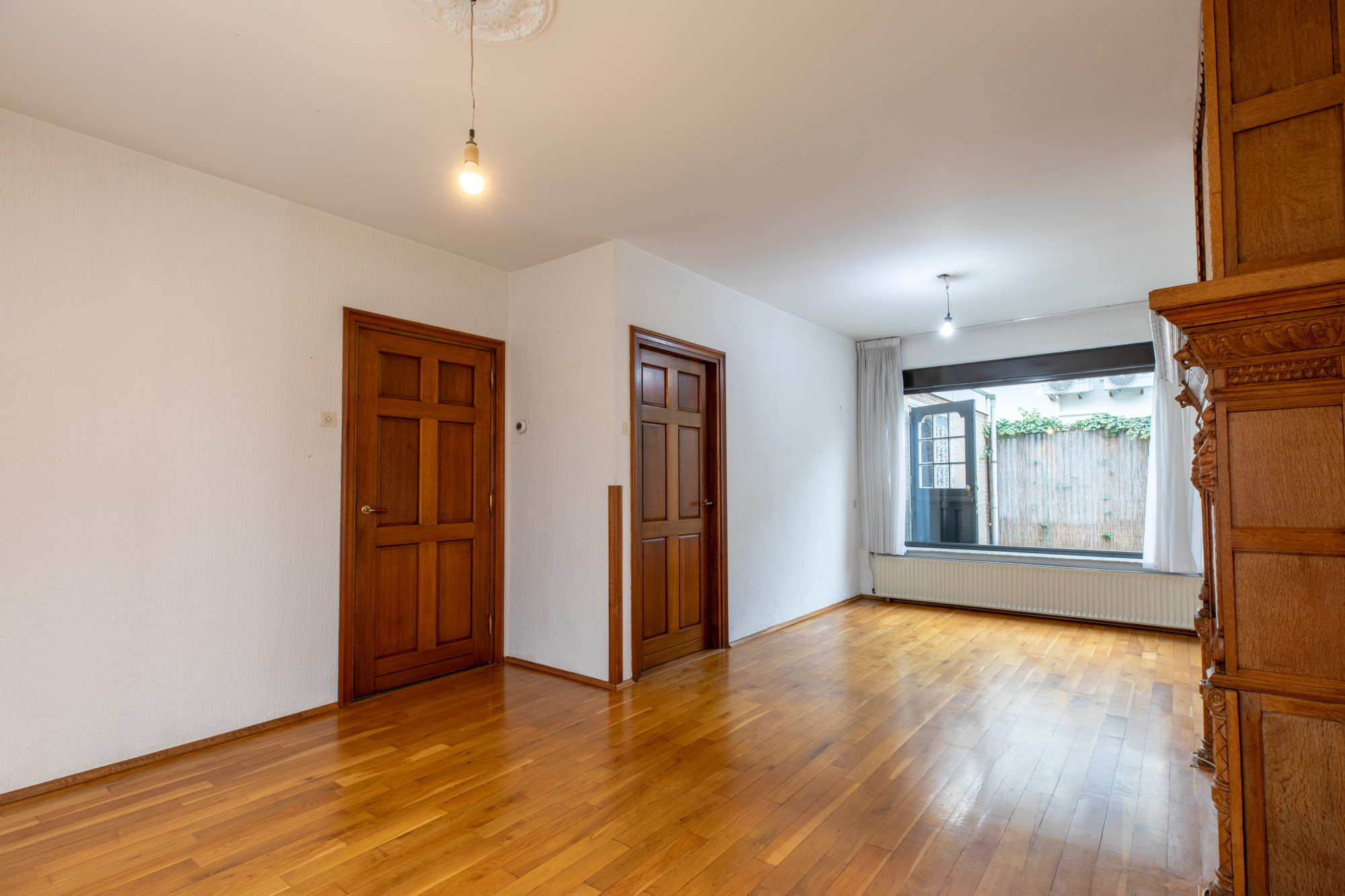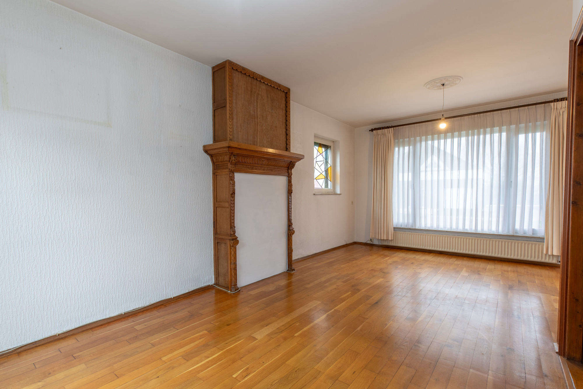 Woonkamer (6.66 x 3.95 m) voorzien van parketvloer en met schoorsteenkanaal.