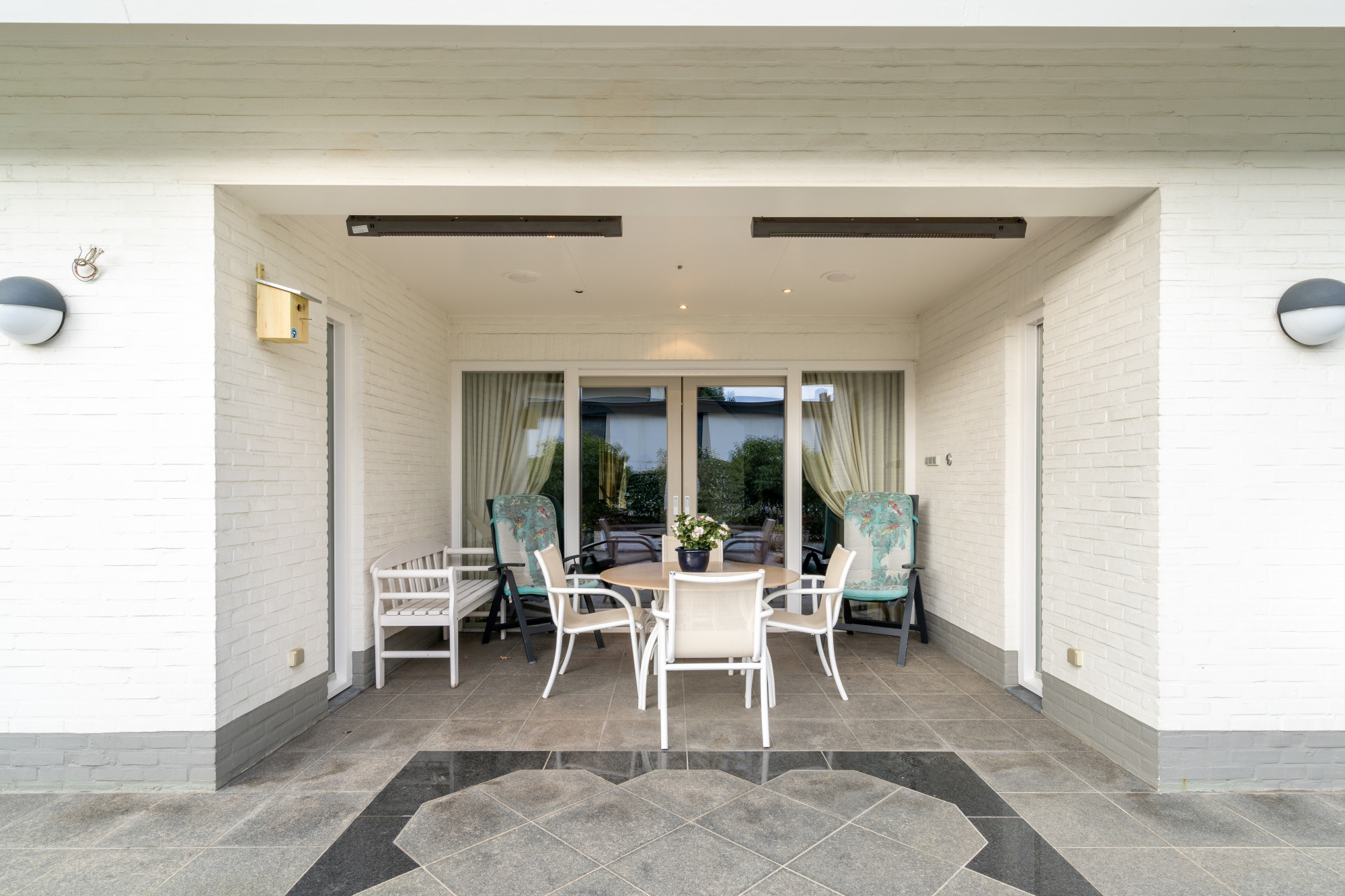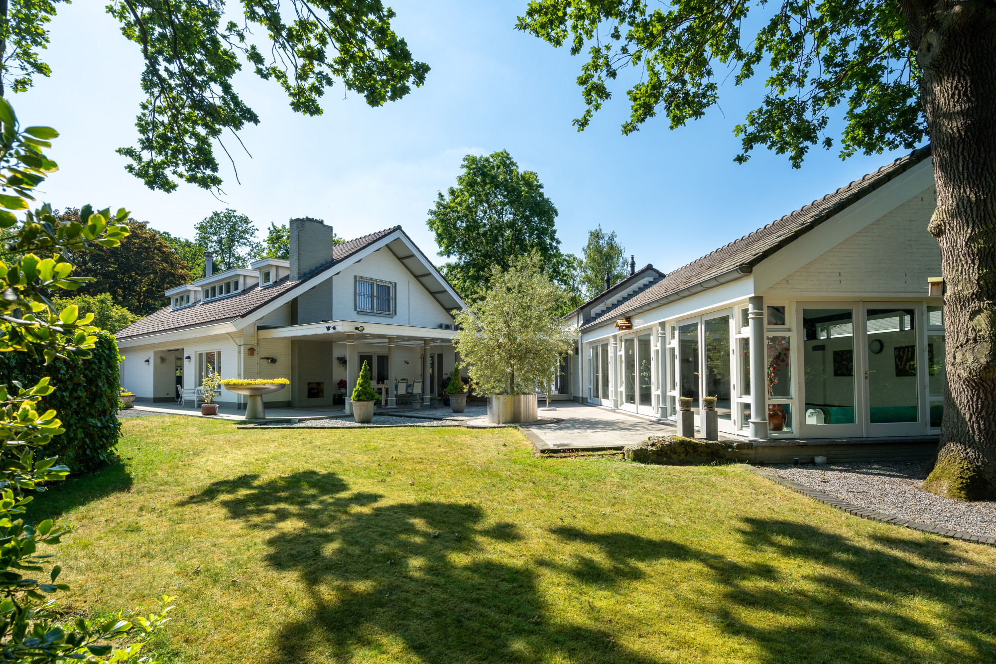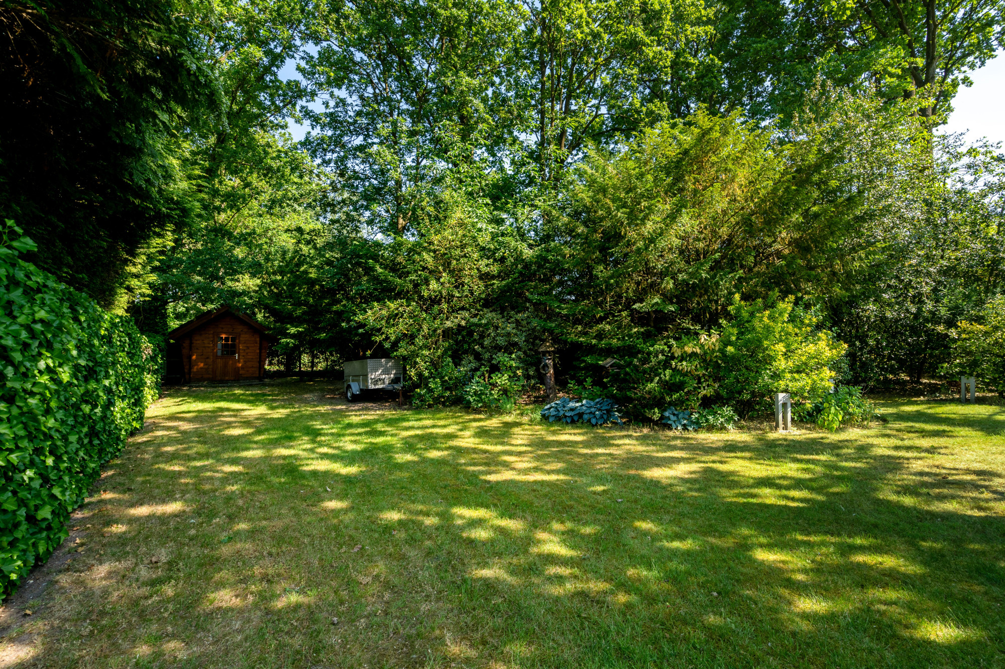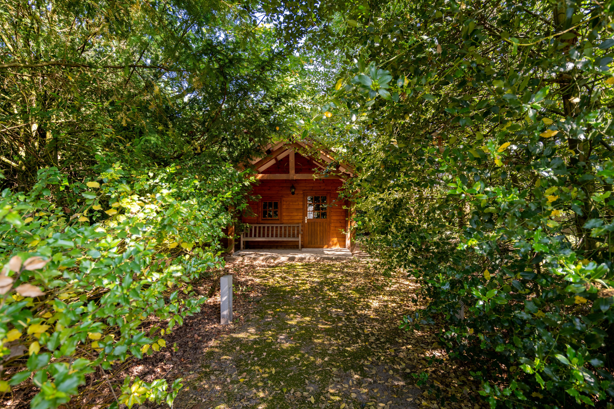 De woning is deels onderkelderd; in deze ruimte zijn de technische installaties van het binnenzwembad ondergebracht. De zuidoostelijk georiënteerde tuin beschikt over een groot overdekt terras en is volledig omheind. Achterin bevindt zich een houten blokhut met extra slaapgelegenheid, een toilet en een wastafel — ideaal als gastenverblijf of poolhouse.