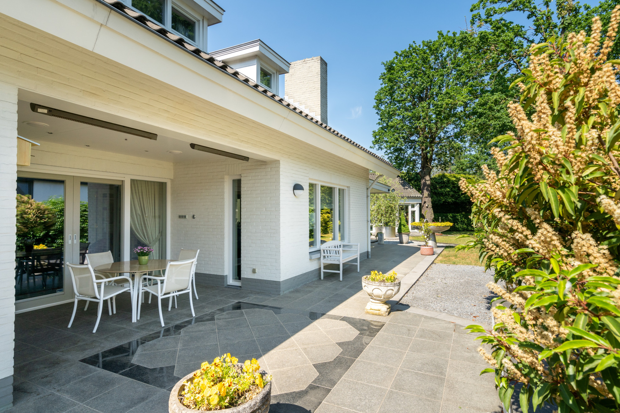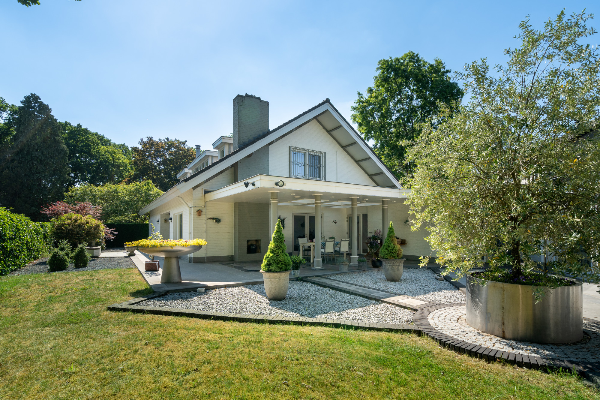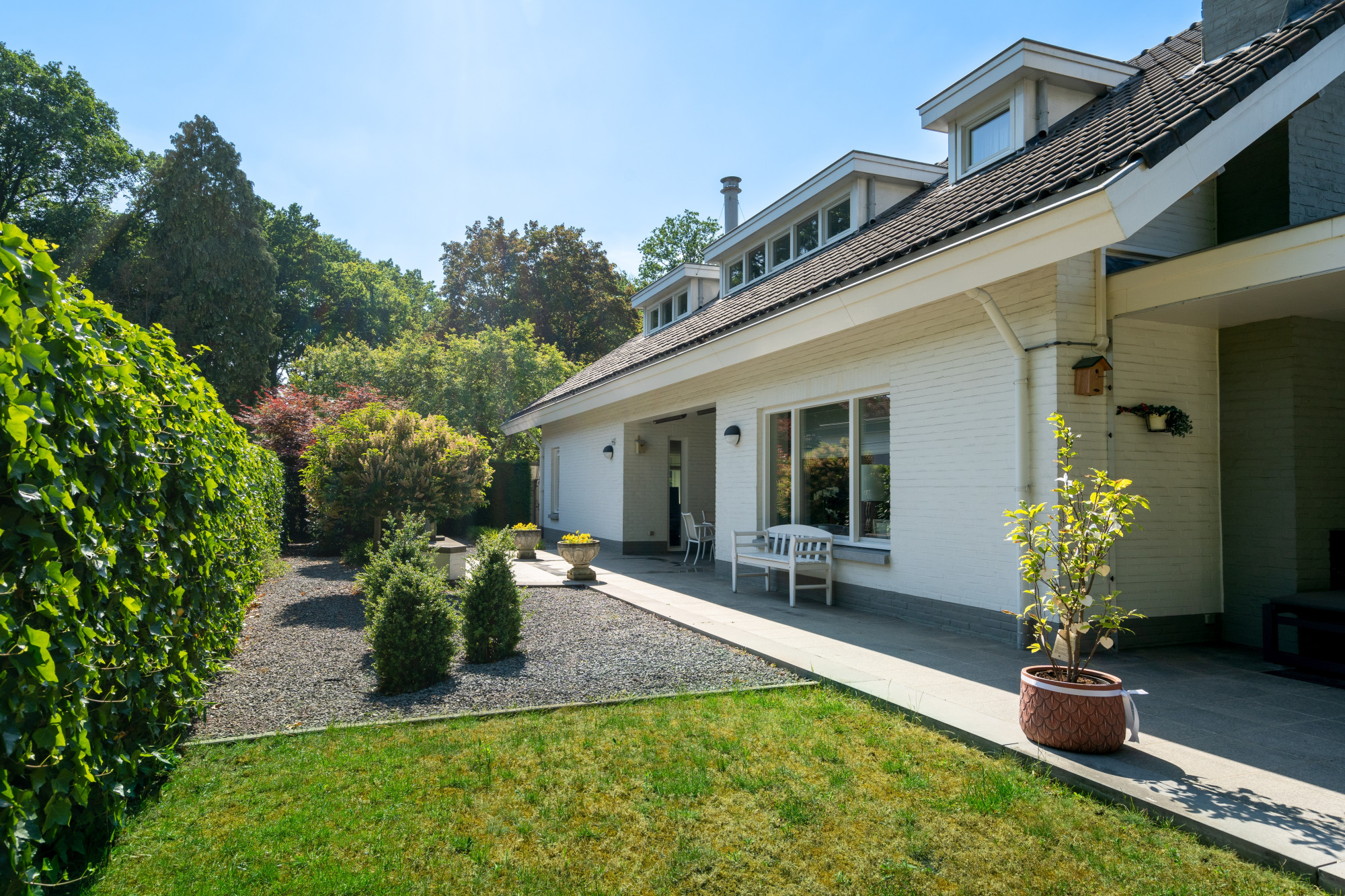 De woning is deels onderkelderd; in deze ruimte zijn de technische installaties van het binnenzwembad ondergebracht. De zuidoostelijk georiënteerde tuin beschikt over een groot overdekt terras en is volledig omheind. Achterin bevindt zich een houten blokhut met extra slaapgelegenheid, een toilet en een wastafel — ideaal als gastenverblijf of poolhouse.
