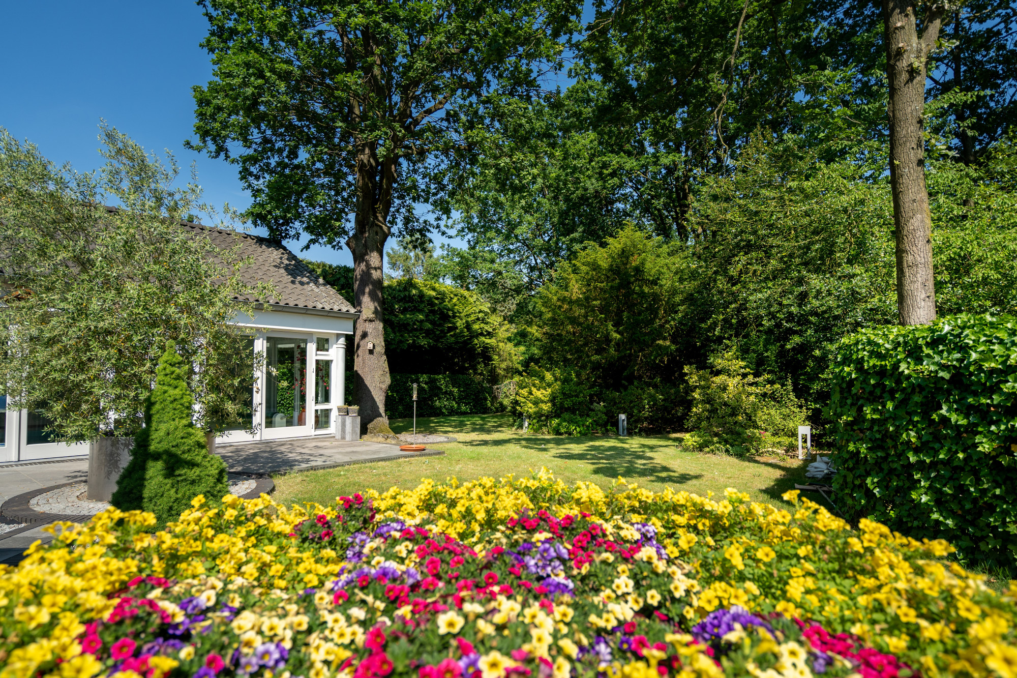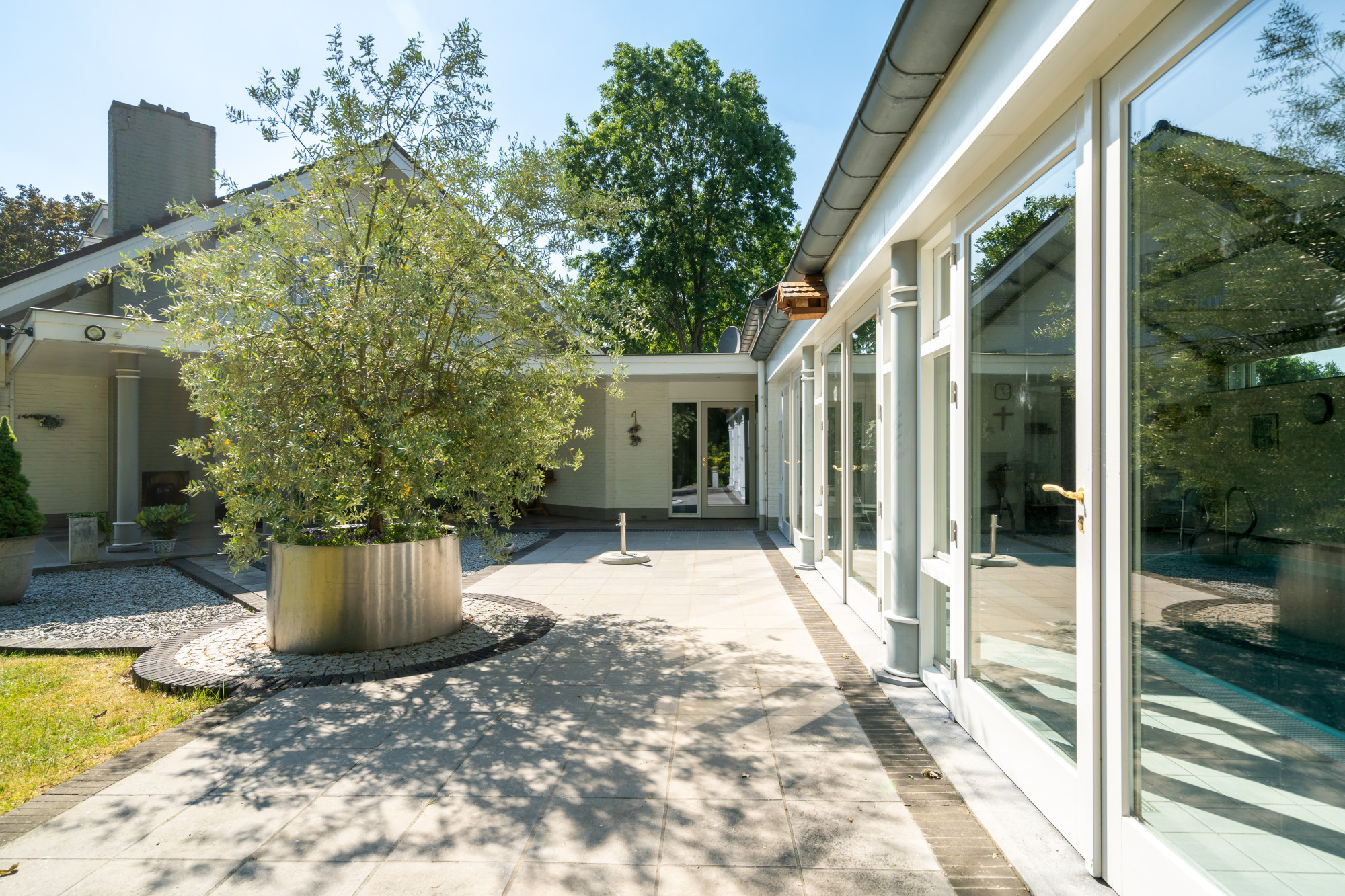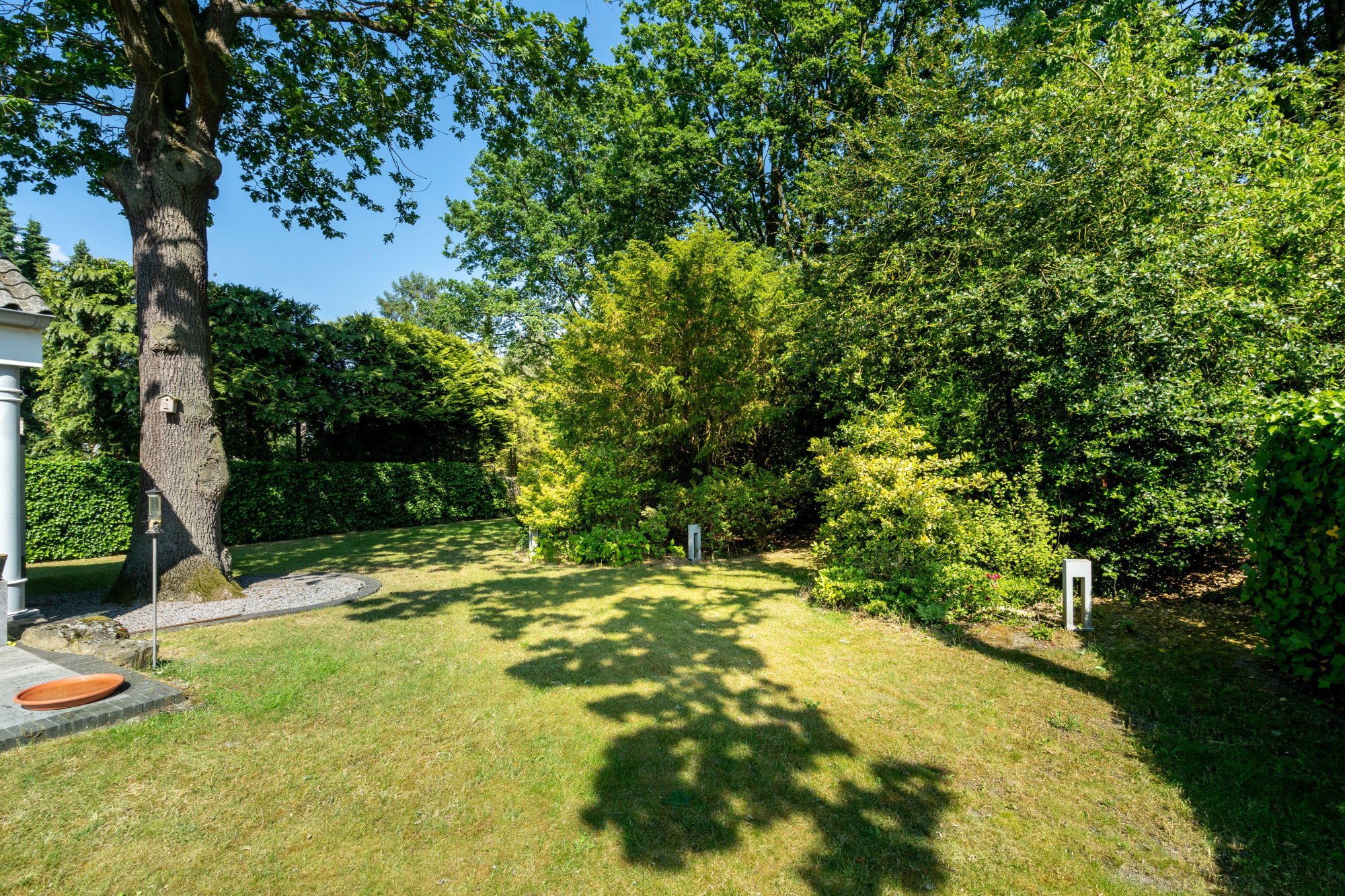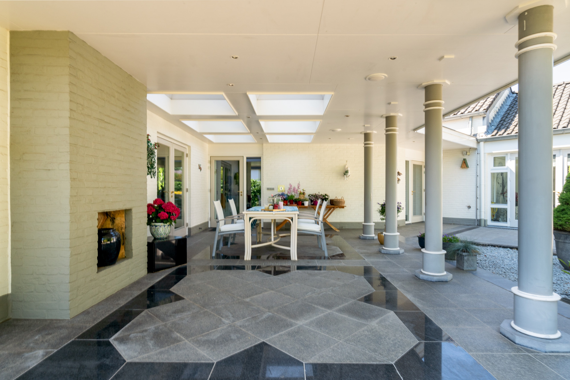 De woning is deels onderkelderd; in deze ruimte zijn de technische installaties van het binnenzwembad ondergebracht. De zuidoostelijk georiënteerde tuin beschikt over een groot overdekt terras en is volledig omheind. Achterin bevindt zich een houten blokhut met extra slaapgelegenheid, een toilet en een wastafel — ideaal als gastenverblijf of poolhouse.