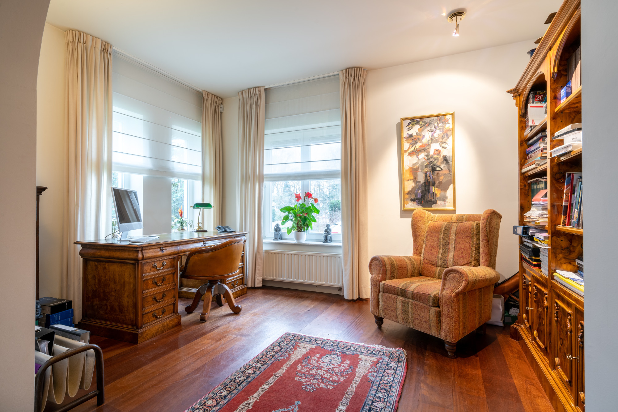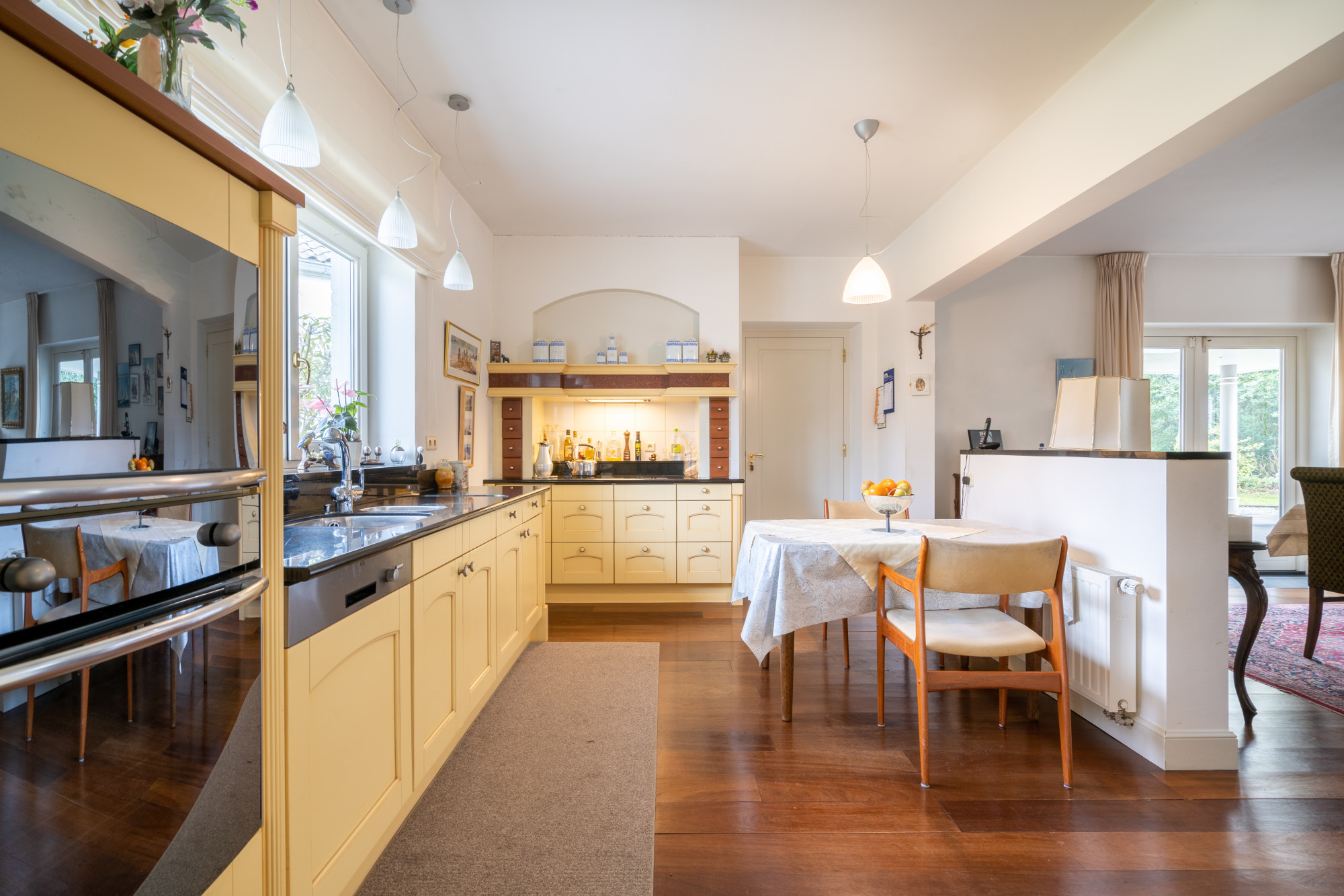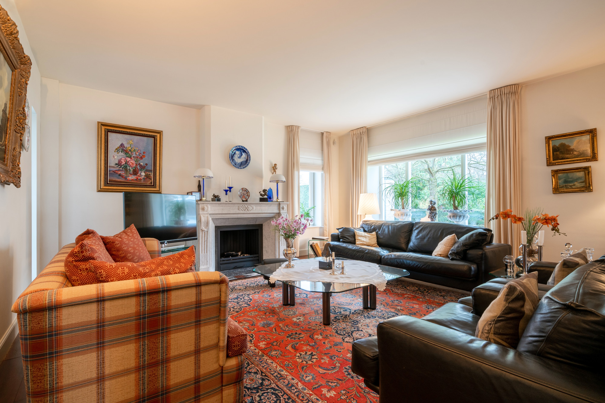 De villa beschikt over een ruime inkomhal met vestiaire en gastentoilet, die toegang biedt tot een centrale ontvangst- en leefruimte. Aansluitend bevinden zich een zitkamer met gashaard, een afzonderlijk thuiskantoor en een eetkamer die naadloos overgaat in de open leefkeuken met centraal kookeiland. Een ruime bijkeuken verbindt het leefgedeelte met de dubbele inpandige garage.