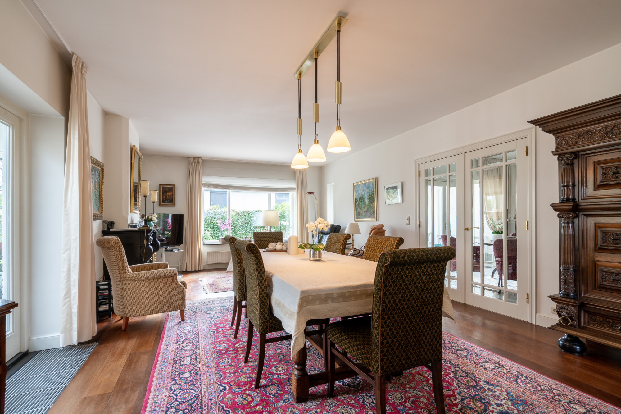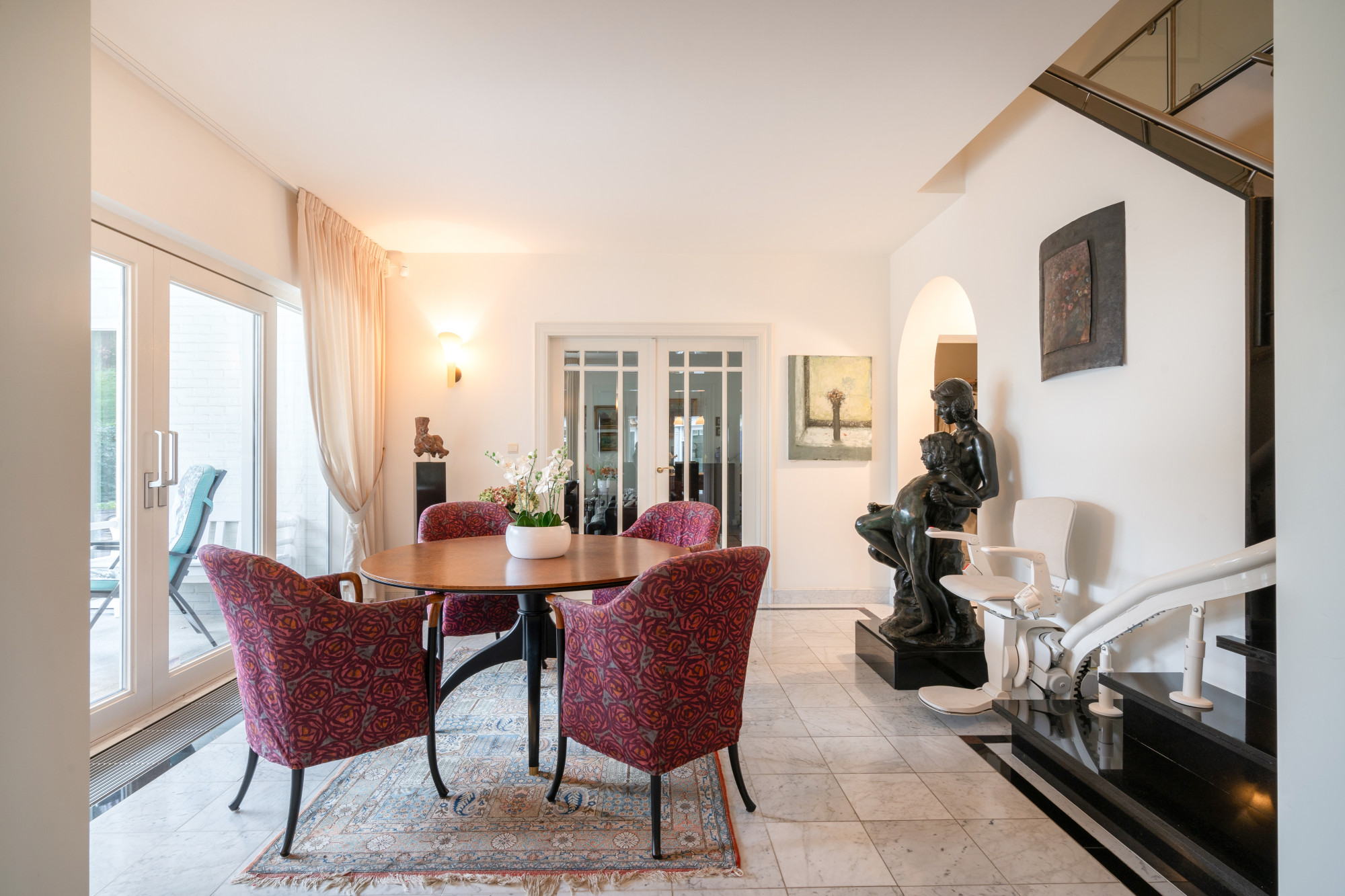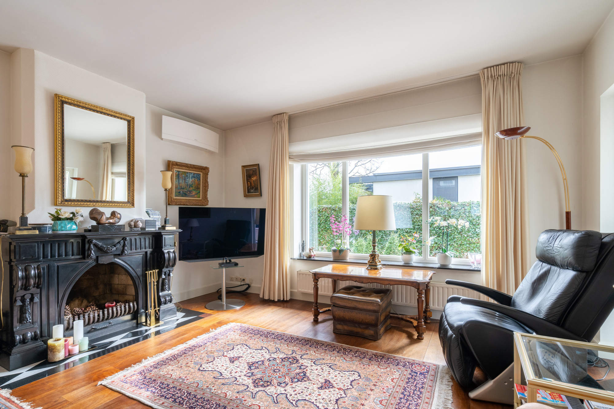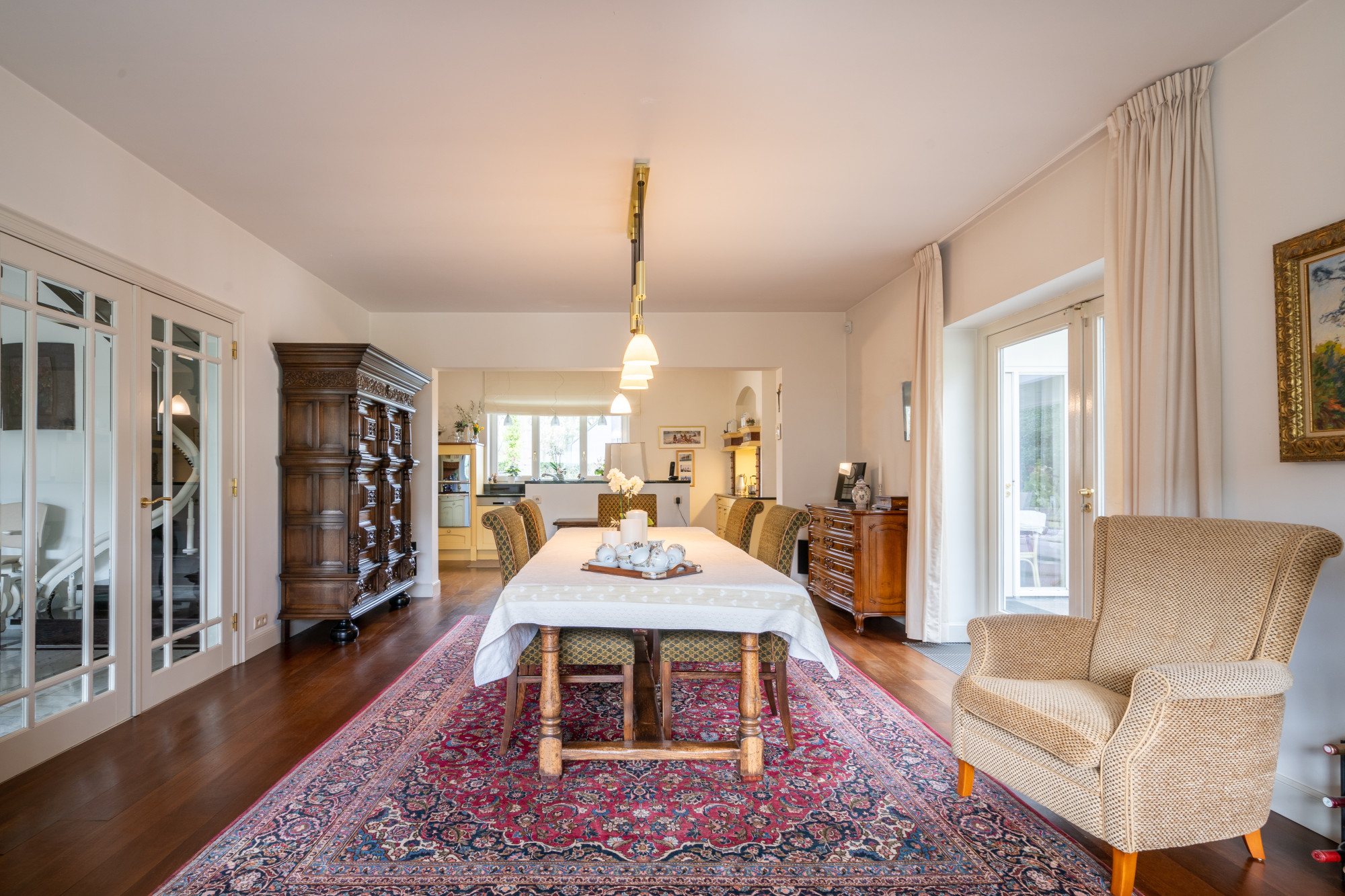 De villa beschikt over een ruime inkomhal met vestiaire en gastentoilet, die toegang biedt tot een centrale ontvangst- en leefruimte. Aansluitend bevinden zich een zitkamer met gashaard, een afzonderlijk thuiskantoor en een eetkamer die naadloos overgaat in de open leefkeuken met centraal kookeiland. Een ruime bijkeuken verbindt het leefgedeelte met de dubbele inpandige garage.