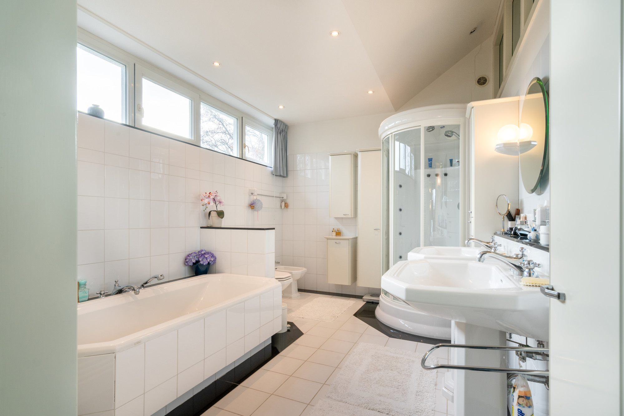 De ensuite badkamer bij de masterbedroom is royaal uitgerust met een traditioneel ligbad, douche met massagefunctie, dubbele wastafel, toilet en bidet. De tweede badkamer beschikt over een douche, een enkele wastafel en een toilet.