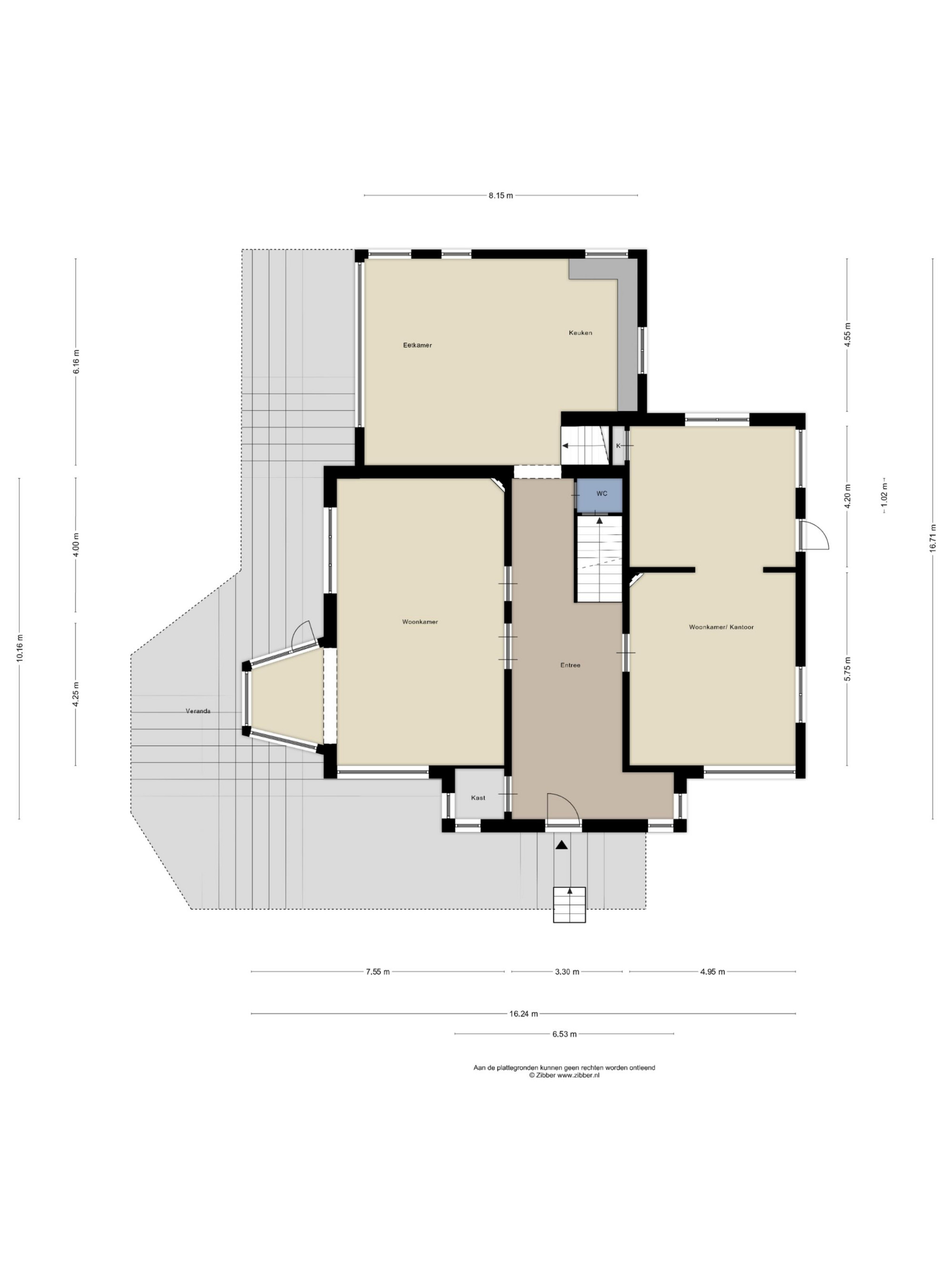 Via de royale hal met schitterende bordestrap zijn alle ruimtes op de begane grond toegankelijk. De woonkamer met erker is aan de linkerzijde en is circa 48m² groot. Aan de rechterzijde van het woonhuis is het kantoor (of tweede woonkamer), dat circa 50m² groot is. De royale keuken (circa 7,90m x 4,55m/ 6,16m) is aan de achterzijde. Vanuit de keuken gaat u naar het dakterras met uitzicht over de tuin.
