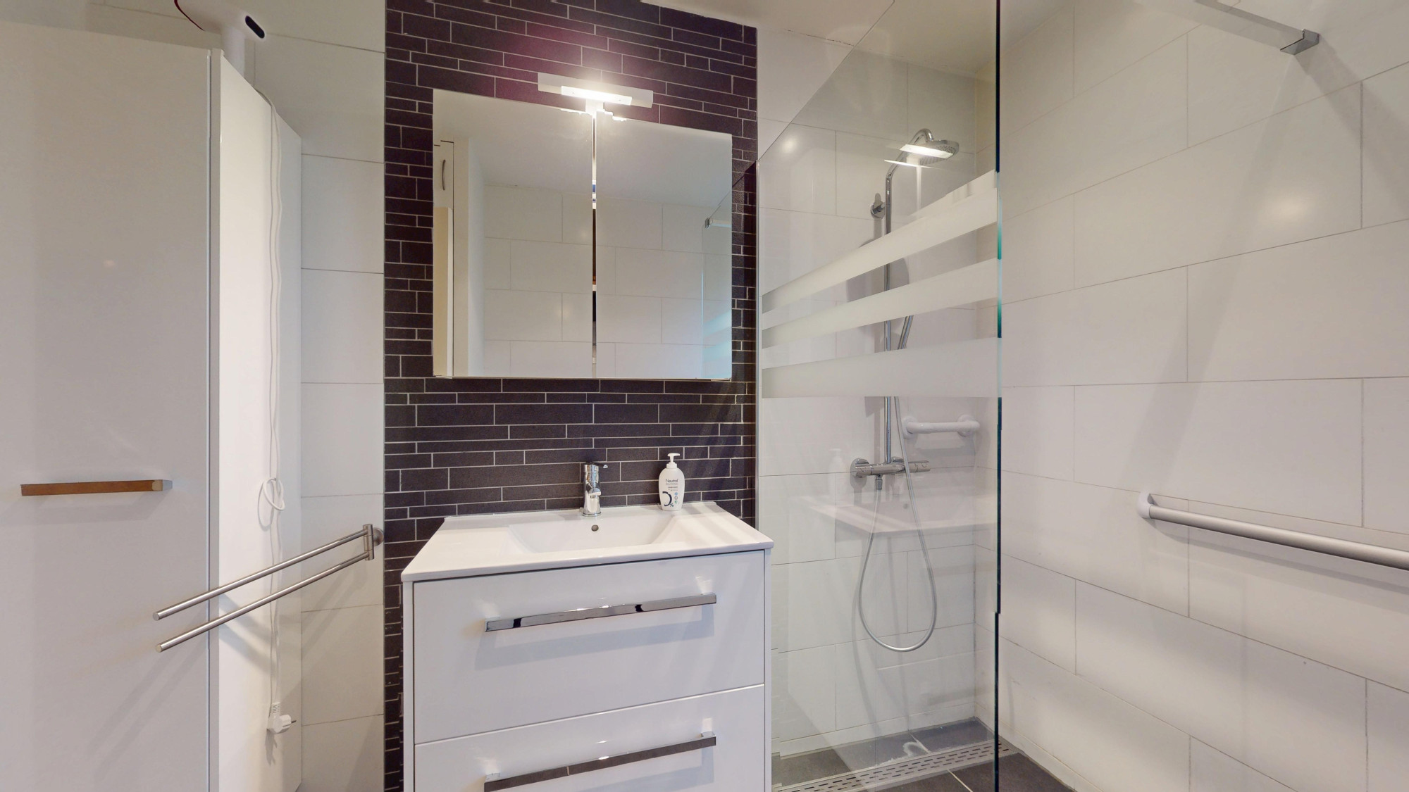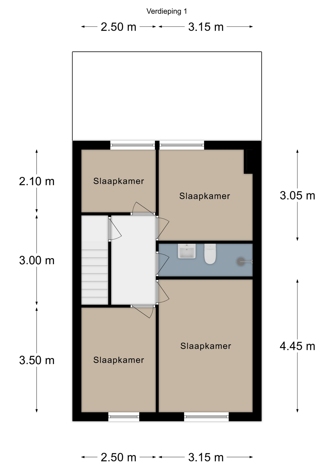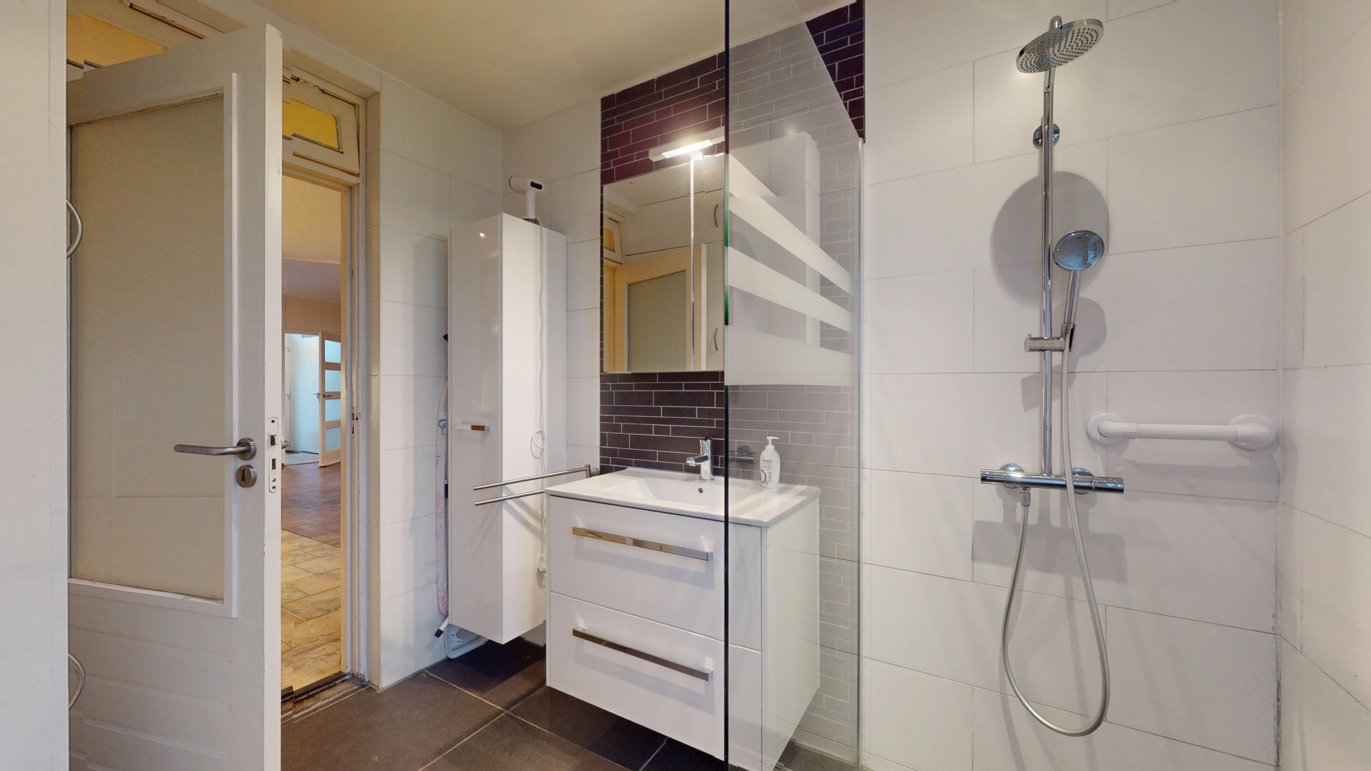 Overloop; 4 slaapkamers; betegelde badkamer met douche, toilet en vaste wastafel.