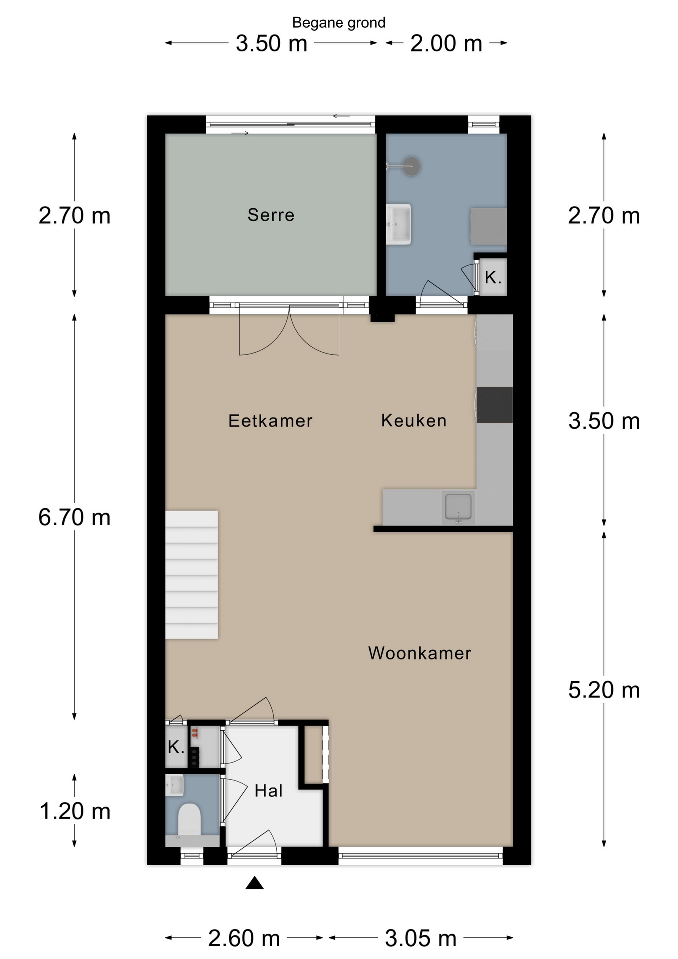Entree met toilet en meterkast; woonkamer met open trap naar verdieping, zit-, eetgedeelte en open keuken; open keuken met verzorgde keukeninstallatie voorzien van inbouwapparatuur; moderne badkamer met inloopdouche, toilet, vaste wastafel met meubel en kast met gehuurde cv-combiketel; serre met schuifpui naar tuin; zonnig gesitueerde tuin met achterom en toegang tot garage; garage met elektrisch bedienbare sectionaalpoort en zijdeur.