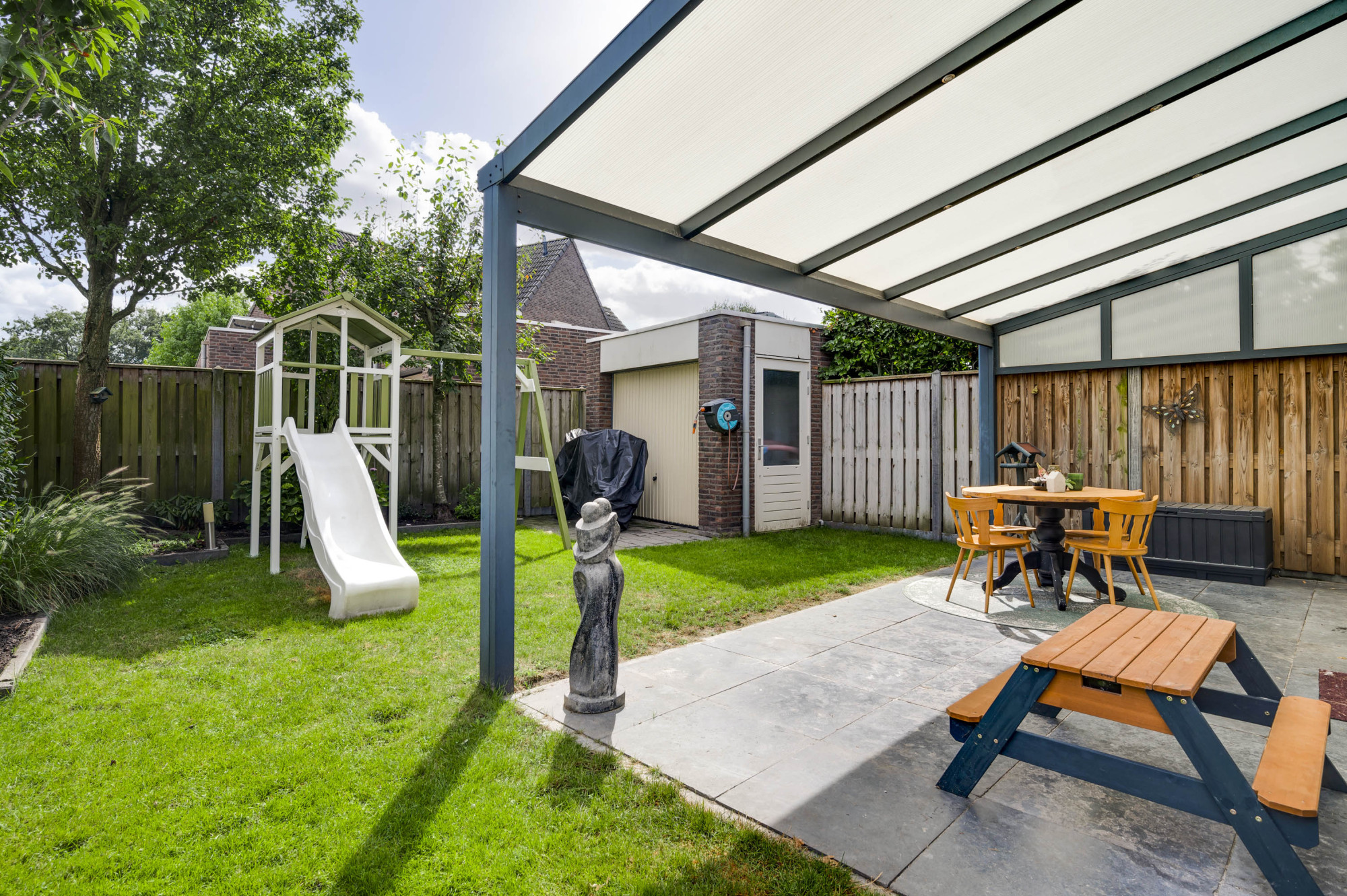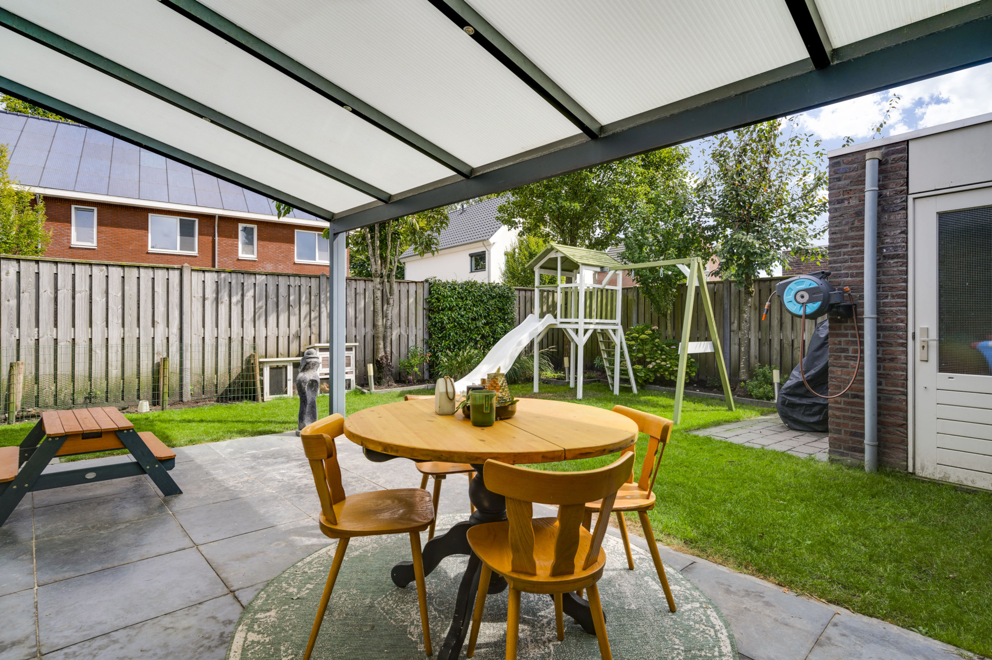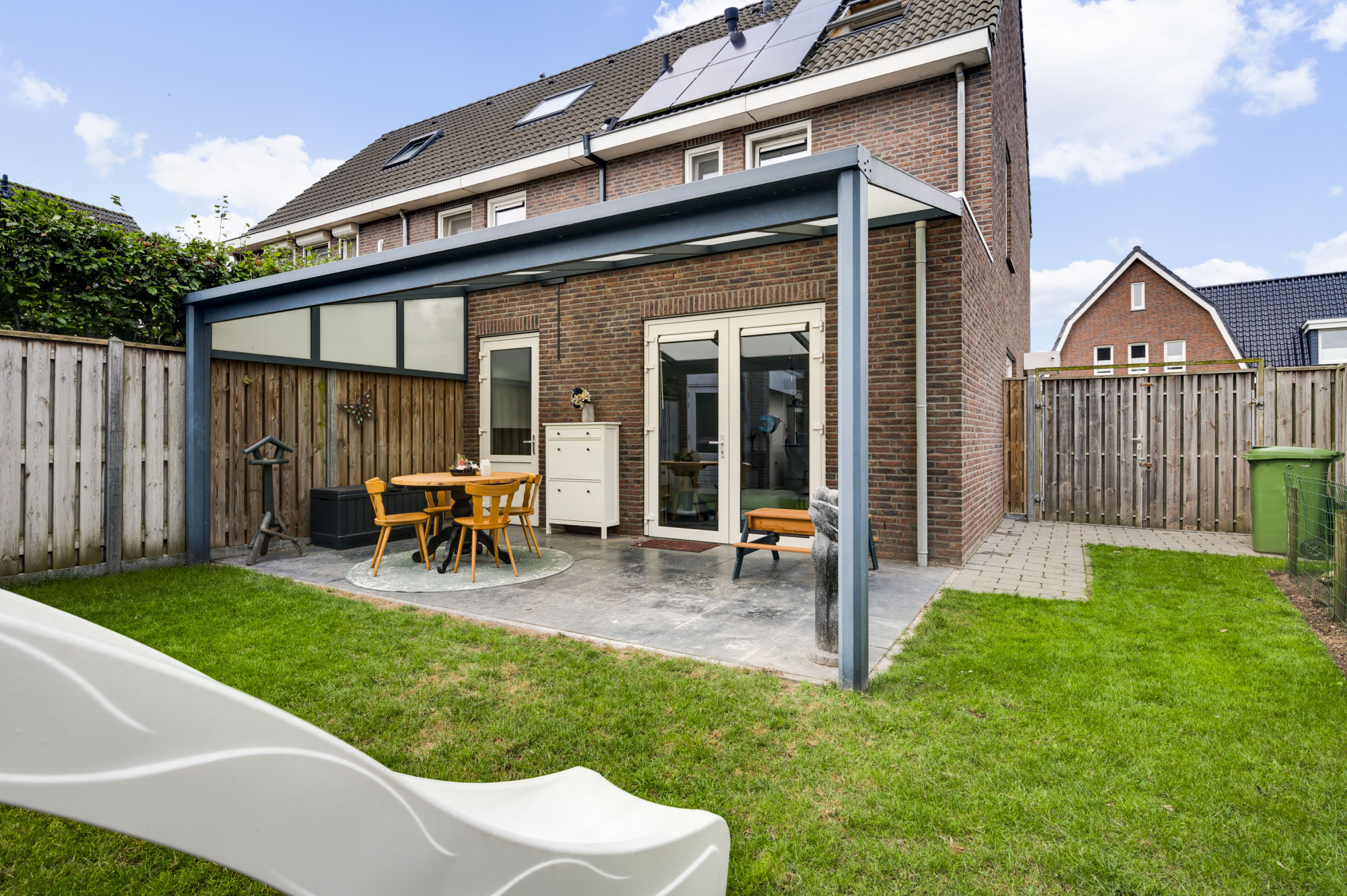 Geniet van de zonnige achtertuin met een fraaie terrasoverkapping en een stenen berging met garagepoort en loopdeur. De voortuin beschikt over een ruime oprit met een laadpaal (ter overname) en biedt plaats voor meerdere auto’s.