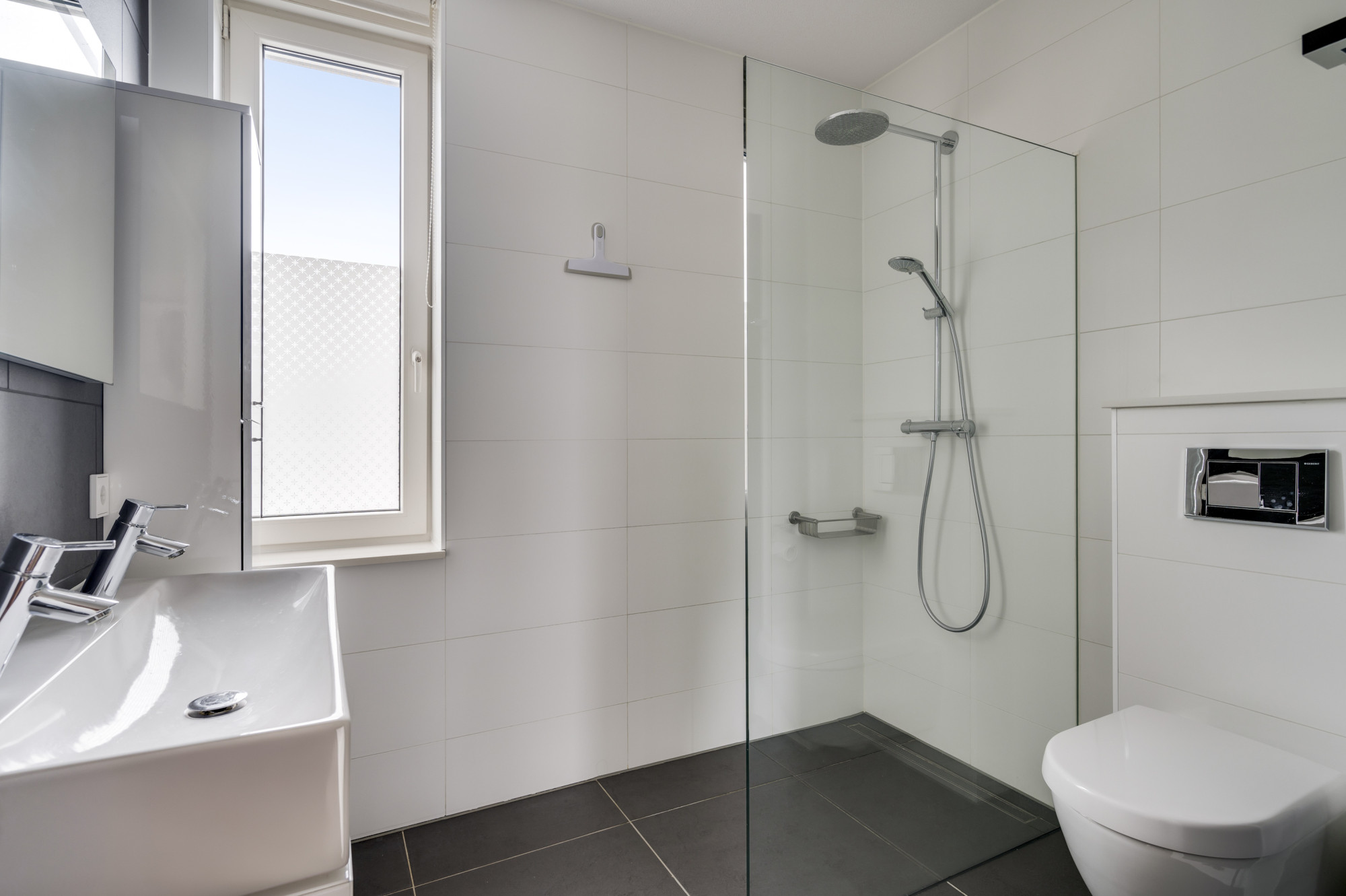 Hier vindt u de overloop en de eerste drie ruime slaapkamers en een moderne badkamer met inloopdouche, dubbele wastafel, zwevend toilet én vloerverwarming.