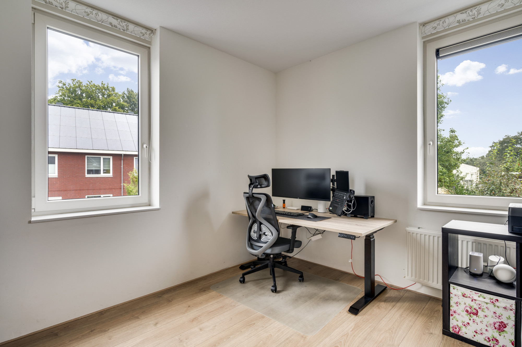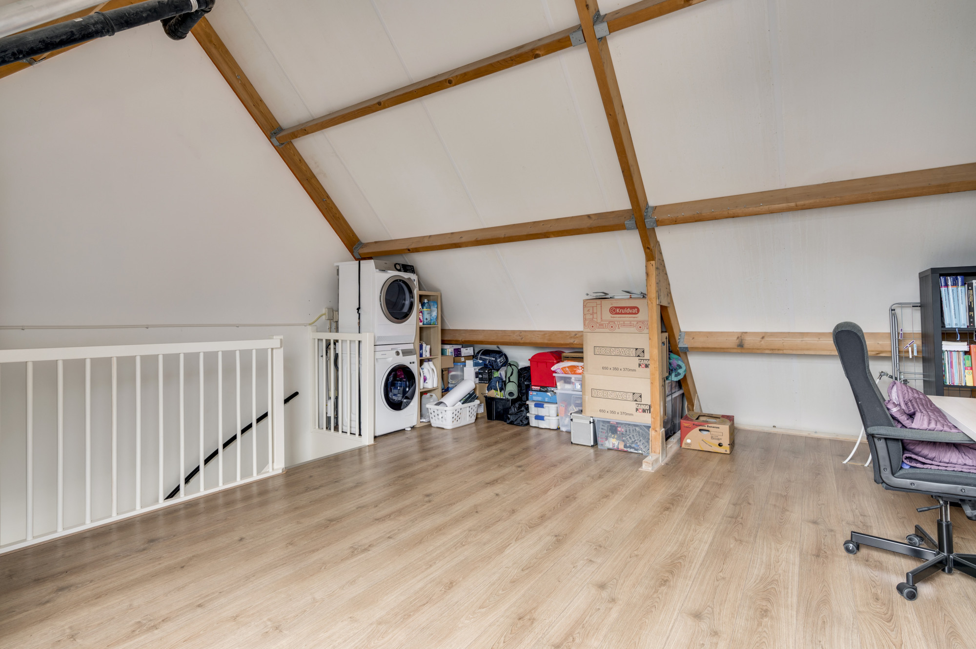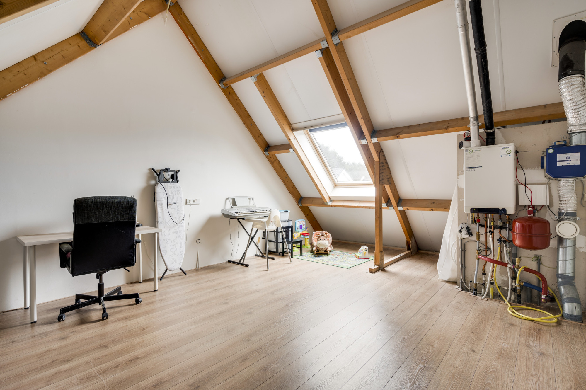 Via een vaste trap bereikt u de royale zolderverdieping, die als riante vierde slaapkamer kan worden gebruikt. Hier vindt u ook de aansluitingen voor witgoed, de cv-installatie (Intergas, eigendom, ca. 2011), de aansturing van de warmtepomp naast de cv en de unit voor de mechanische ventilatie.