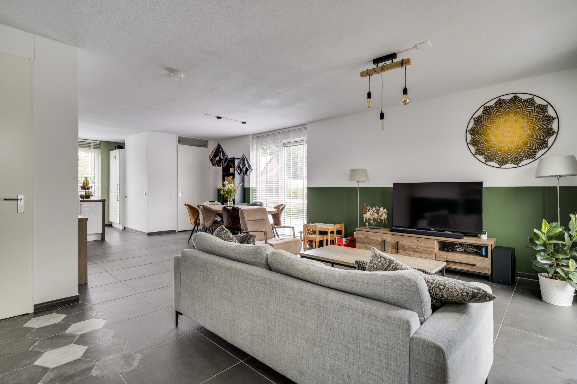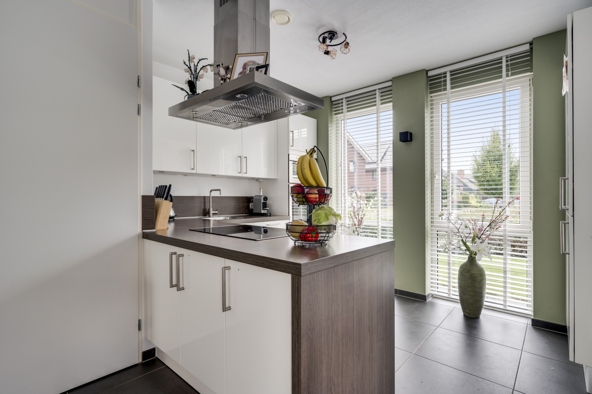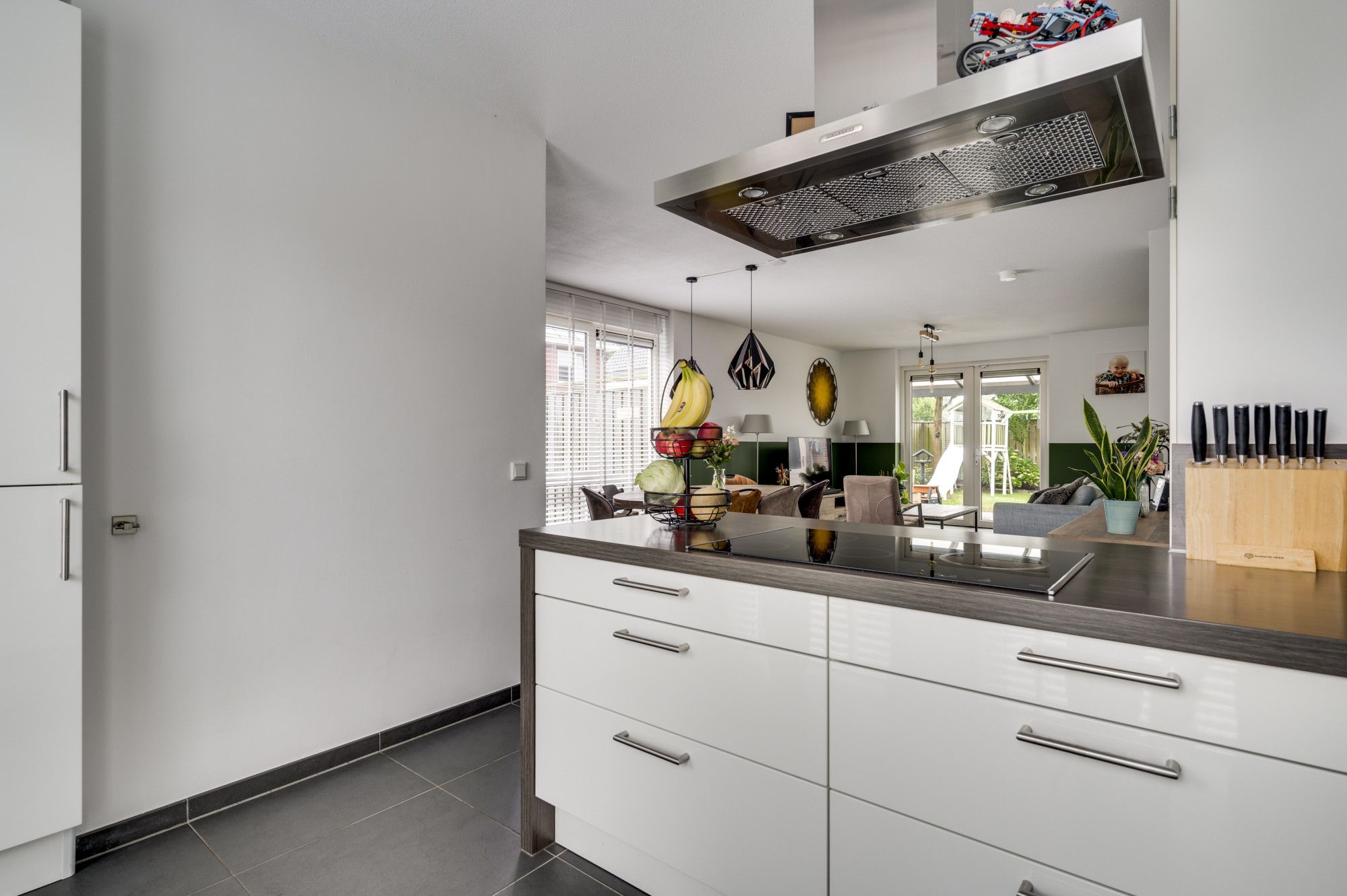Bij binnenkomst wordt u verwelkomd in een moderne hal met toegang tot een lichte en ruime L-vormige woonkamer. De uitgebouwde woonkamer is voorzien van dubbele tuindeuren en een loopdeur, waardoor u direct contact heeft met de zonnige tuin. De moderne keuken is uitgerust met een schiereiland en alle benodigde inbouwapparatuur, zoals een kookplaat, afzuigkap, magnetron, oven, koel-vriescombinatie en een vaatwasser. De begane grond beschikt verder over een praktische trapkast en is volledig voorzien van een stijlvolle tegelvloer met grotendeels vloerverwarming.