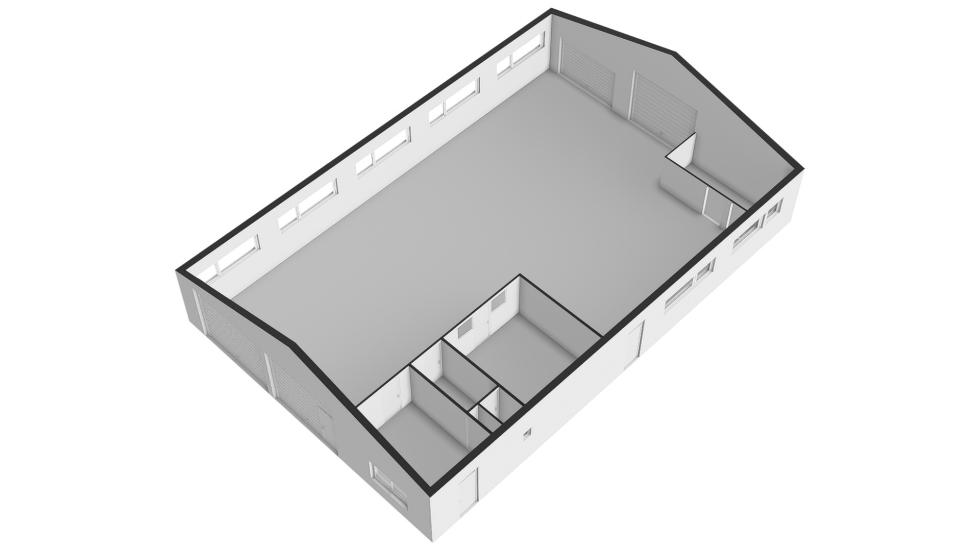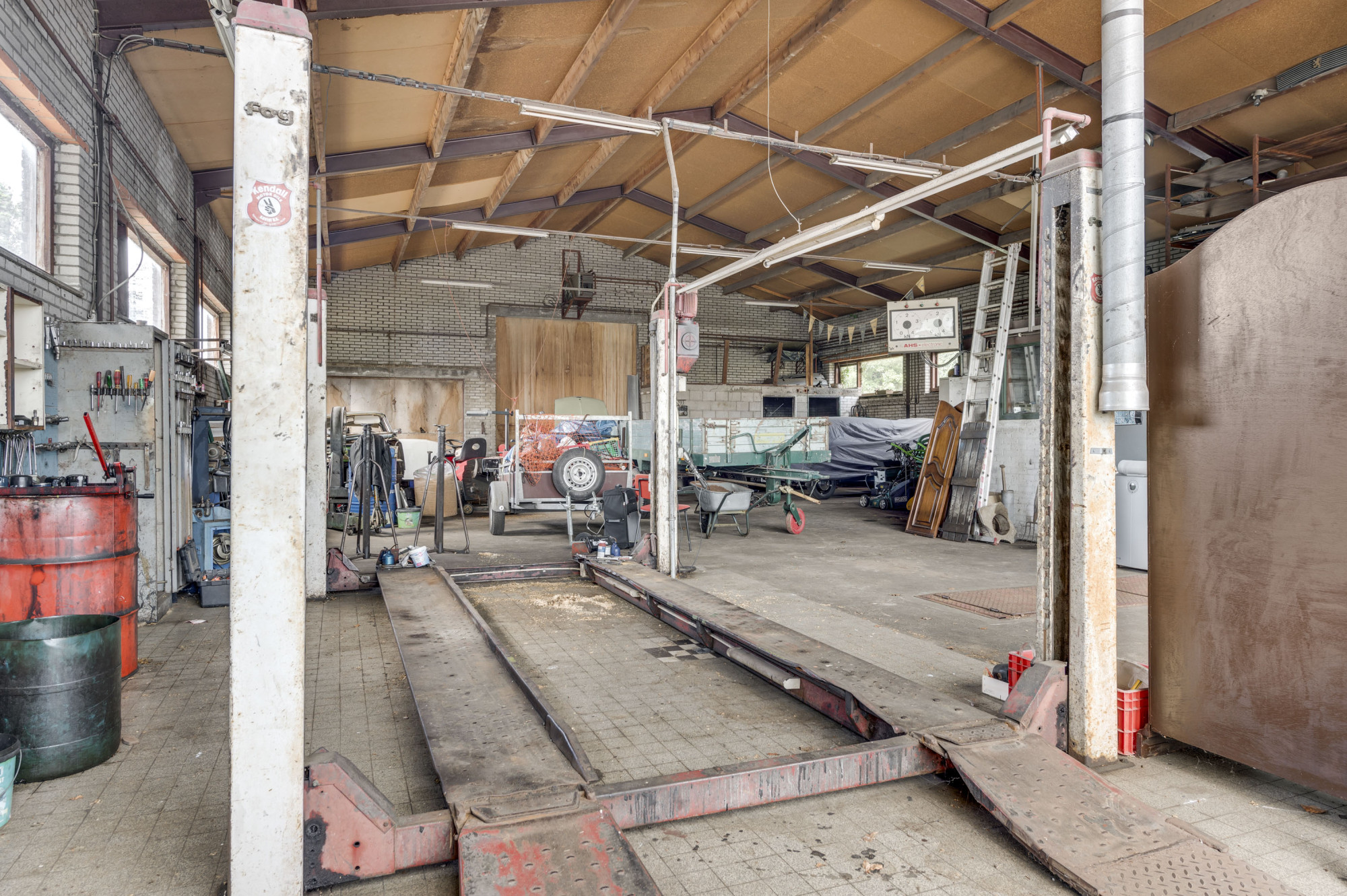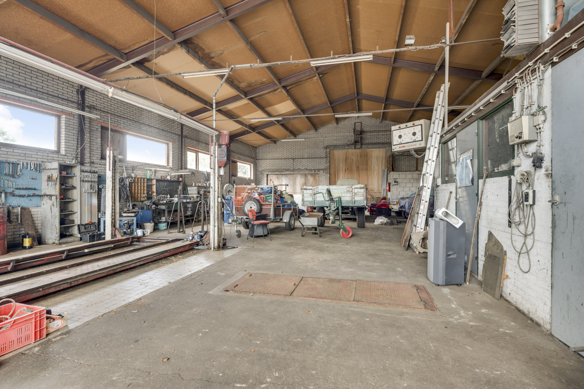 De loods bestaat uit een ruime garage met werkplaats, magazijnruimte, kantoorruimte en een eigen sanitaire groep met toiletruimte met aansluiting toilet en fonteintje.
