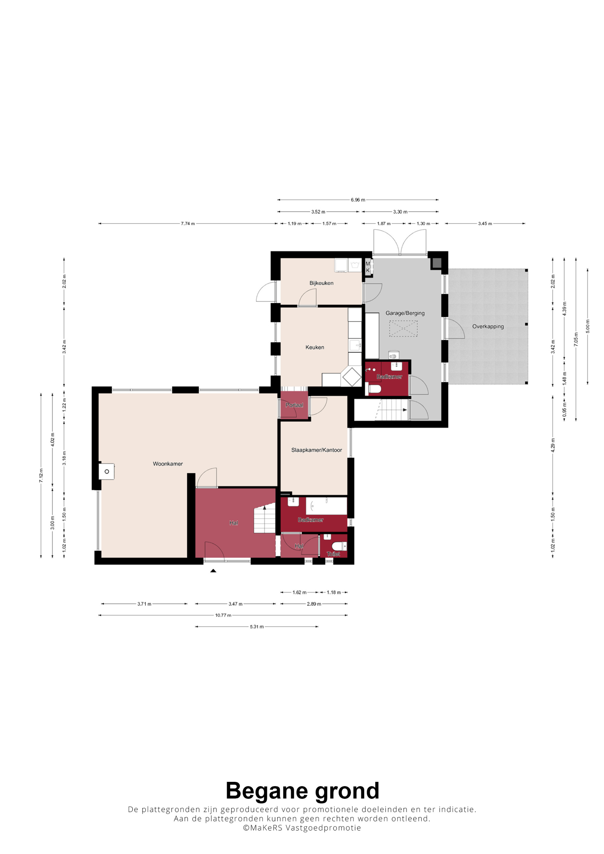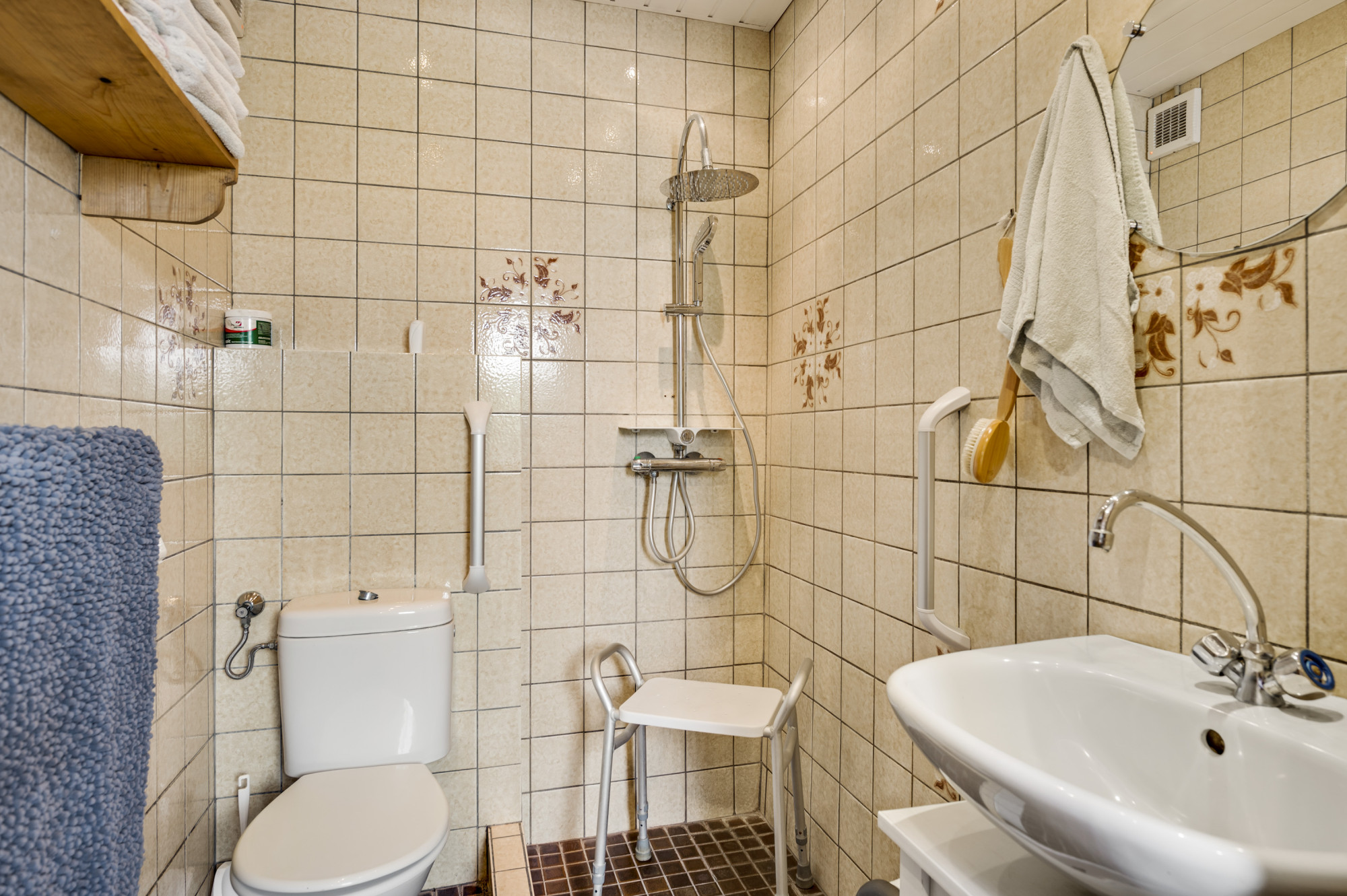 De ruime hal vormt het hart van de woning en biedt toegang tot de trapopgang, het toilet met fonteintje, de eerste badkamer en de woonkamer. De sfeervolle L-vormige woonkamer met vloerverwarming beschikt over een houtkachel en geniet van een prachtige lichtinval. Via een tussen portaal is de aangrenzende woonkeuken en de 1e slaapkamer te bereiken. De keuken is uitgerust met een combinatie in hoekopstelling, voorzien van diverse inbouwapparatuur, waaronder een keramische kookplaat, afzuigkap, koelkast en een vaatwasser. De aangrenzende praktische bijkeuken biedt alle witgoedaansluitingen en een combi magnetron in een kast weg gewerkt, alsmede toegang tot de tuin en inpandig toegang tot de berging/garage. De berging/garage is voorzien van de meterkast, de opstelling van de cv-ketel (Nefit HR, ca. 2019, eigendom) en biedt toegang tot de kelder, de tweede eenvoudige badkamer en een loopdeur naar de tuin met overkapping. De eerste eenvoudige/gedateerde badkamer is ingericht met een ligbad en een wastafel met meubel. De tweede eenvoudige/gedateerde badkamer is ingericht met een douche, tweede toilet en een wastafel. De slaapkamer op de begane grond is multifunctioneel inzetbaar als slaap-, kantoor-, speel- of hobbyruimte.