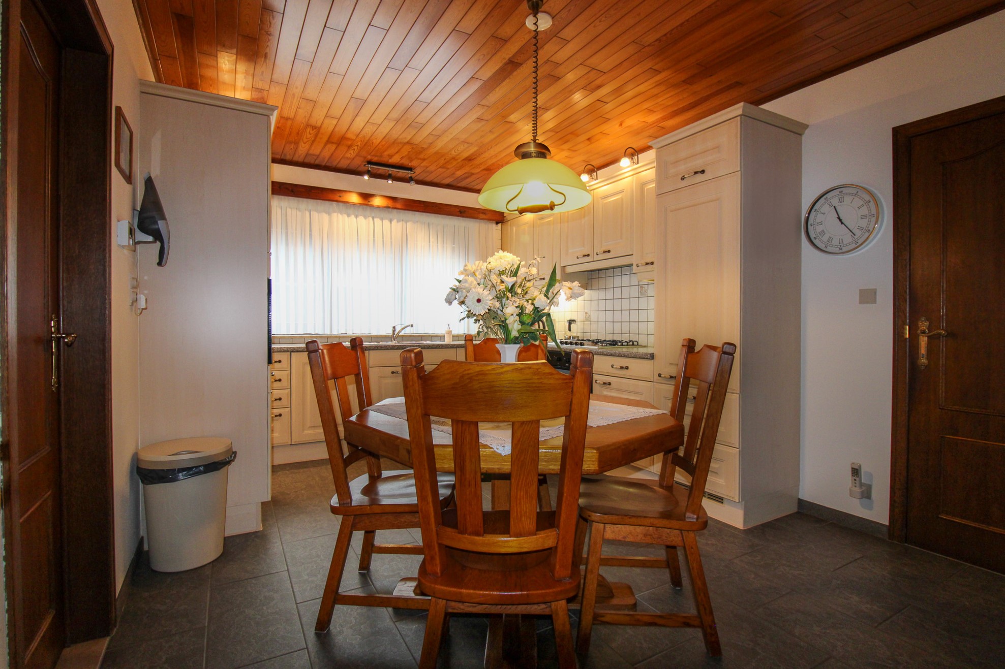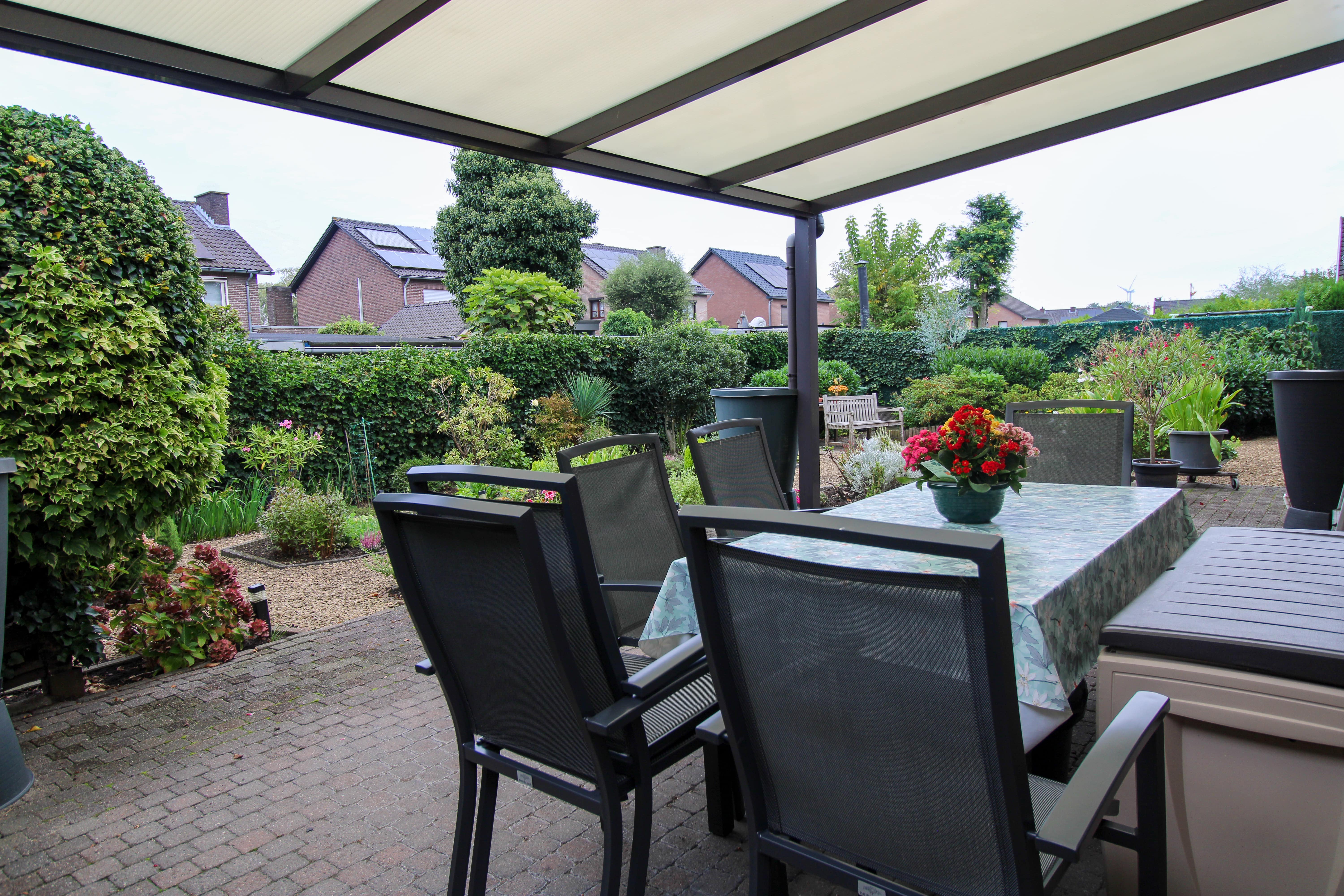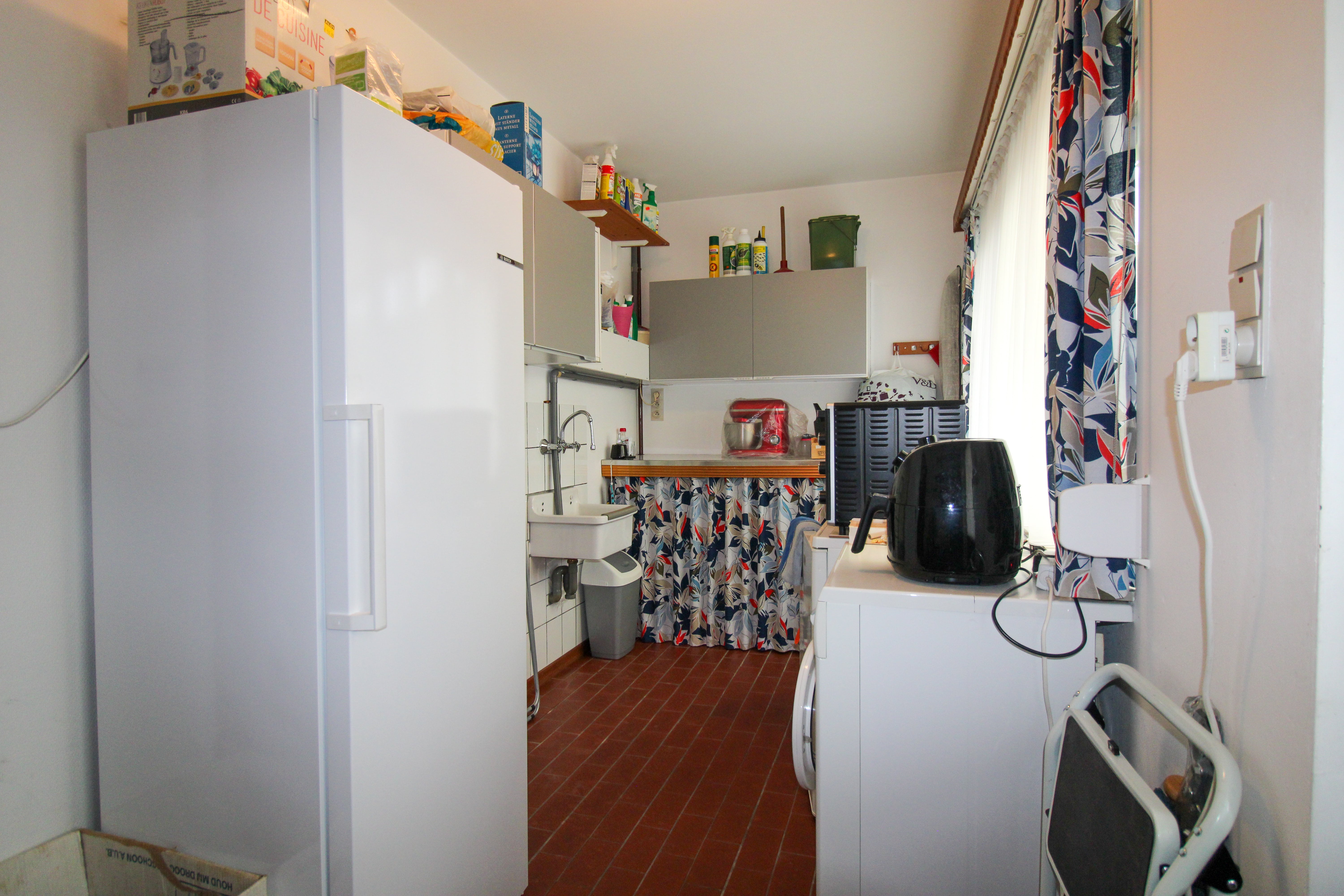 De gezellige leefruimte sluit aan op de aparte keuken. Van hieruit is een ruime berging en het overdekt terras met mooie tuin bereikbaar.