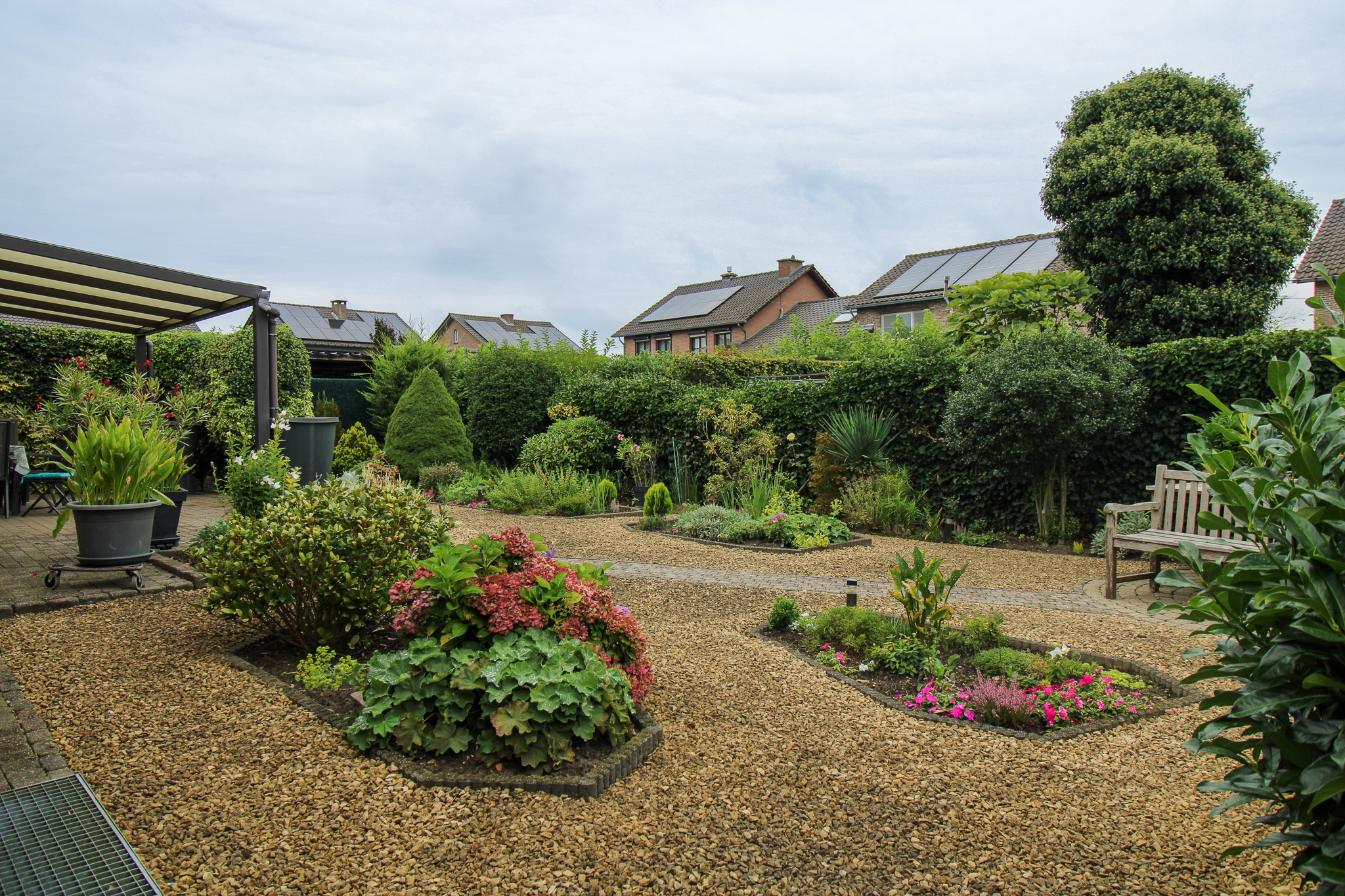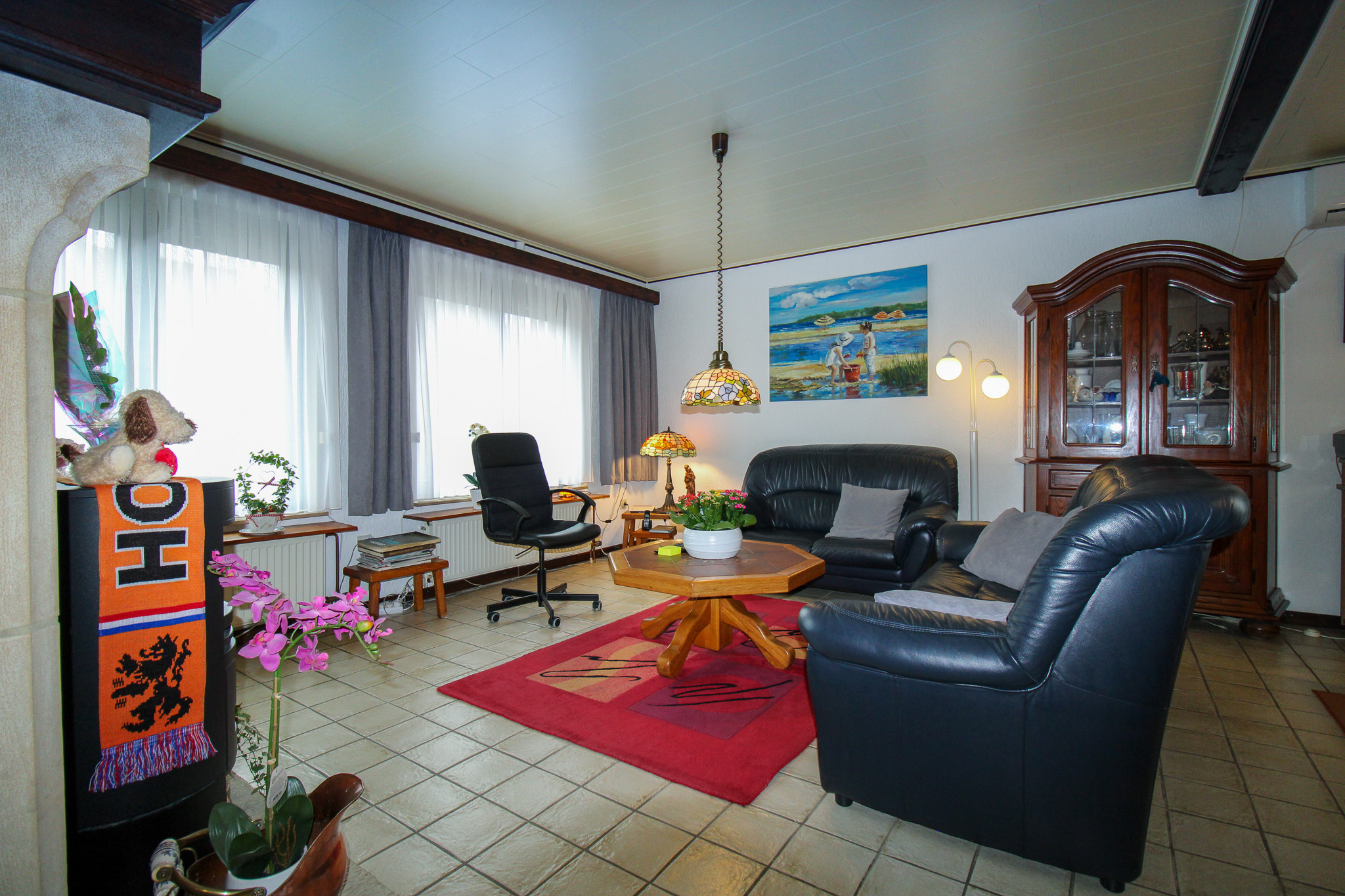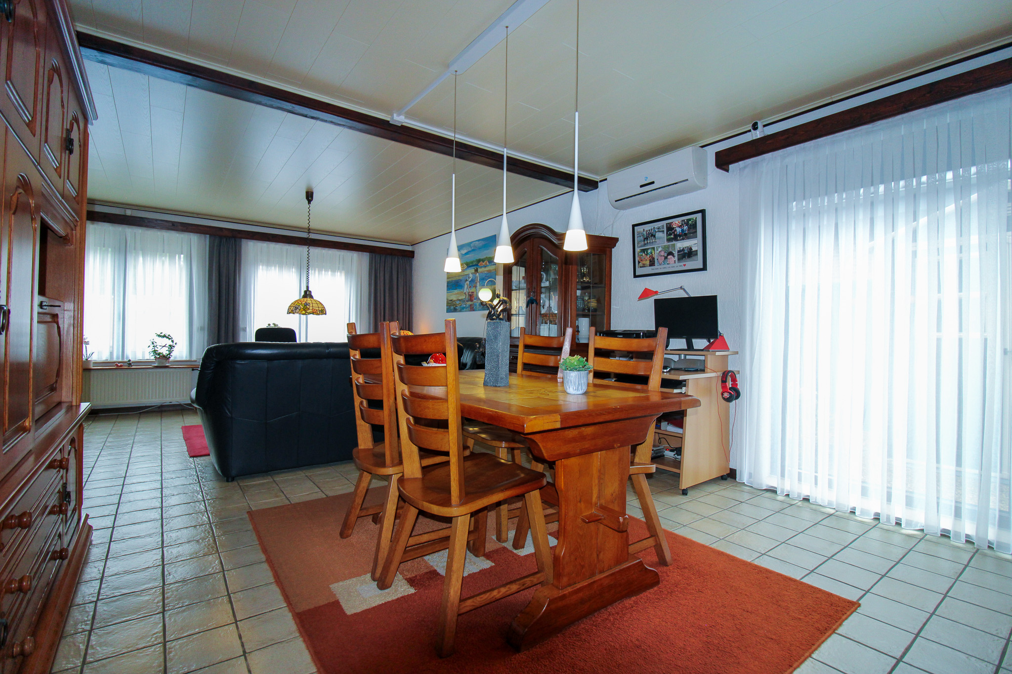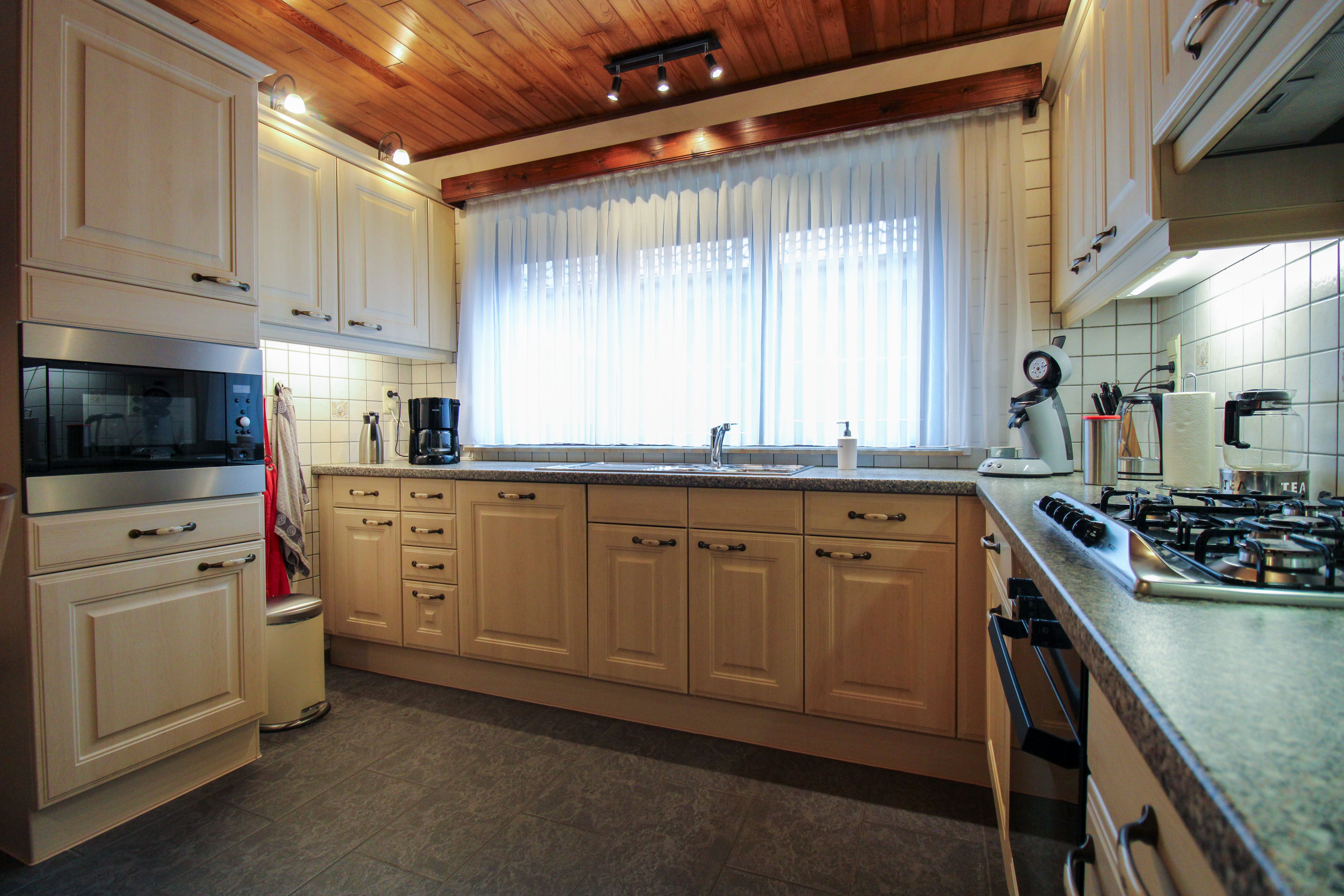 De gezellige leefruimte sluit aan op de aparte keuken. Van hieruit is een ruime berging en het overdekt terras met mooie tuin bereikbaar.