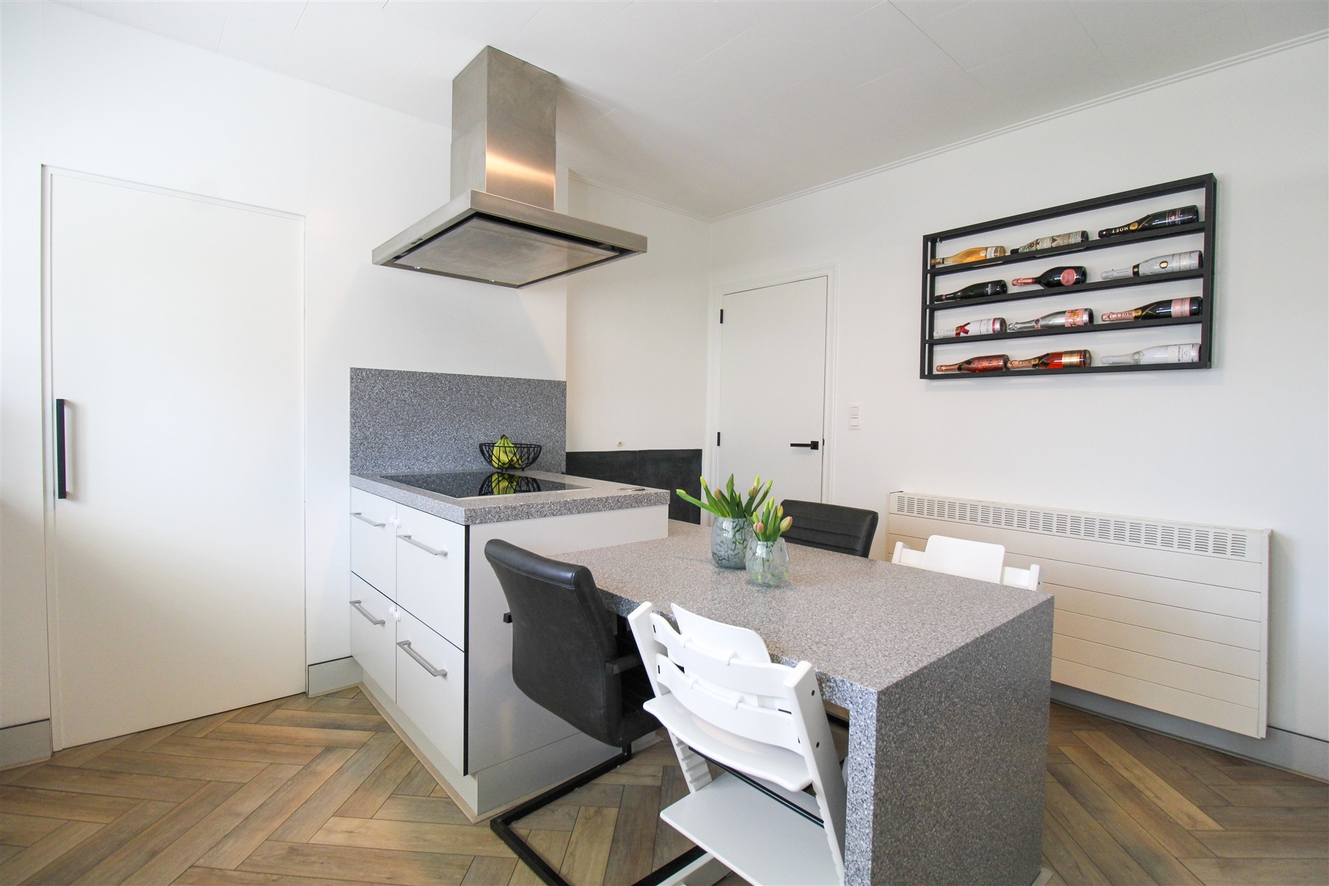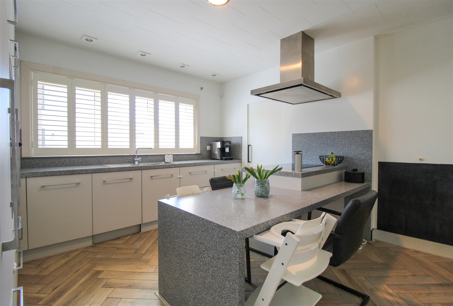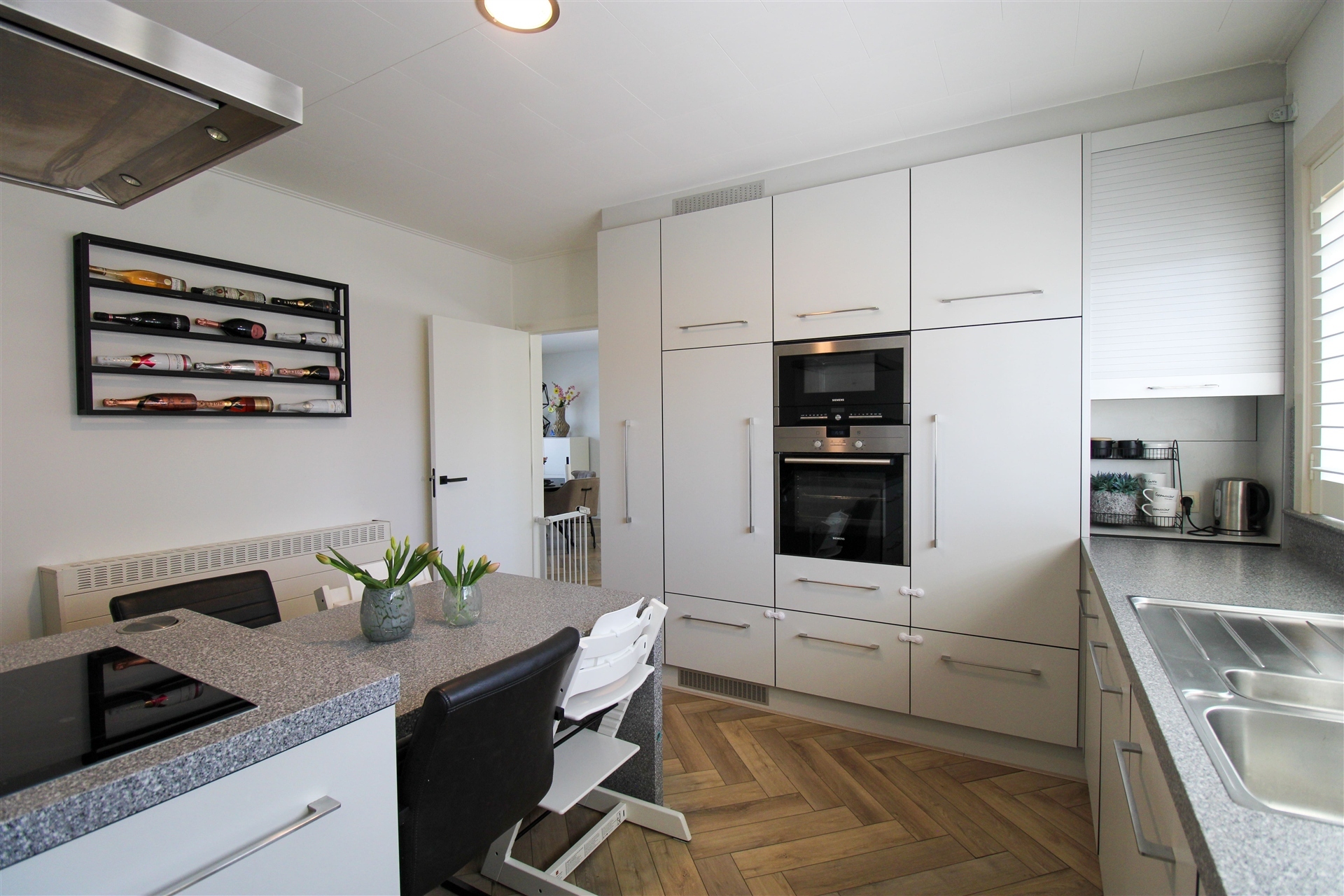 Aansluitend vindt u de praktische keuken met centraal kookeiland. Deze is uitgerust met een inductiekookplaat, dampkap, dubbele spoelbak, oven, microgolfoven, vernieuwde inbouwkoelkast en vernieuwde vaatwasser. Alles voorzien van een soft-close systeem. De keuken grenst aan een praktische bijkeuken/berging, die ook toegang verschaft tot een zeer ruim terras met elektrische zonneluifel.