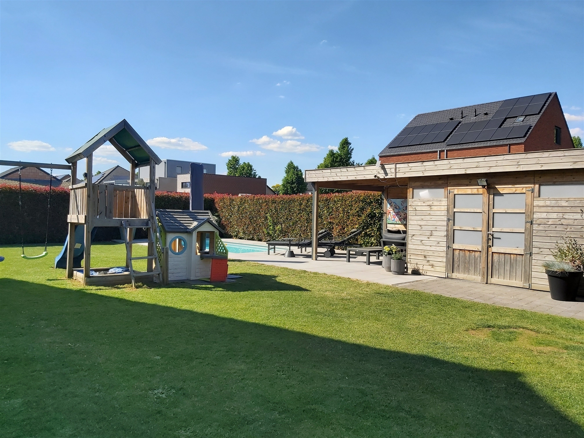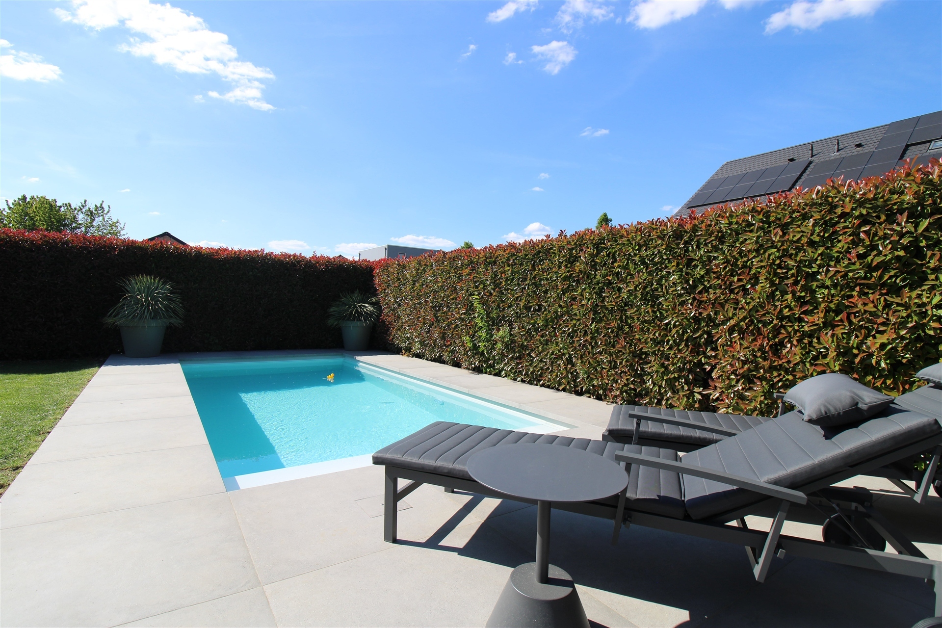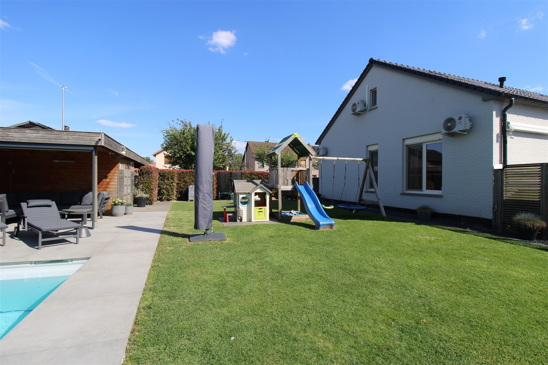 De woning staat op een mooi perceel van 9a80ca, waarbij zowel de voor- als achtertuin met zorg werden aangelegd en een echte meerwaarde vormen voor wie graag buiten leeft. Absolute blikvanger is het verwarmde zwembad, dat volledig automatisch werkt via een warmtepomp, zoutinstallatie en elektrisch rolluik. Ideaal voor zorgeloos zwemplezier van het vroege voorjaar tot het najaar! De tuin is bovendien volledig omheind met nieuw hekwerk en biedt toegang tot een tuinhuis met overkapping uitgerust met een zonnescreen én een aangrenzende carport (2017).