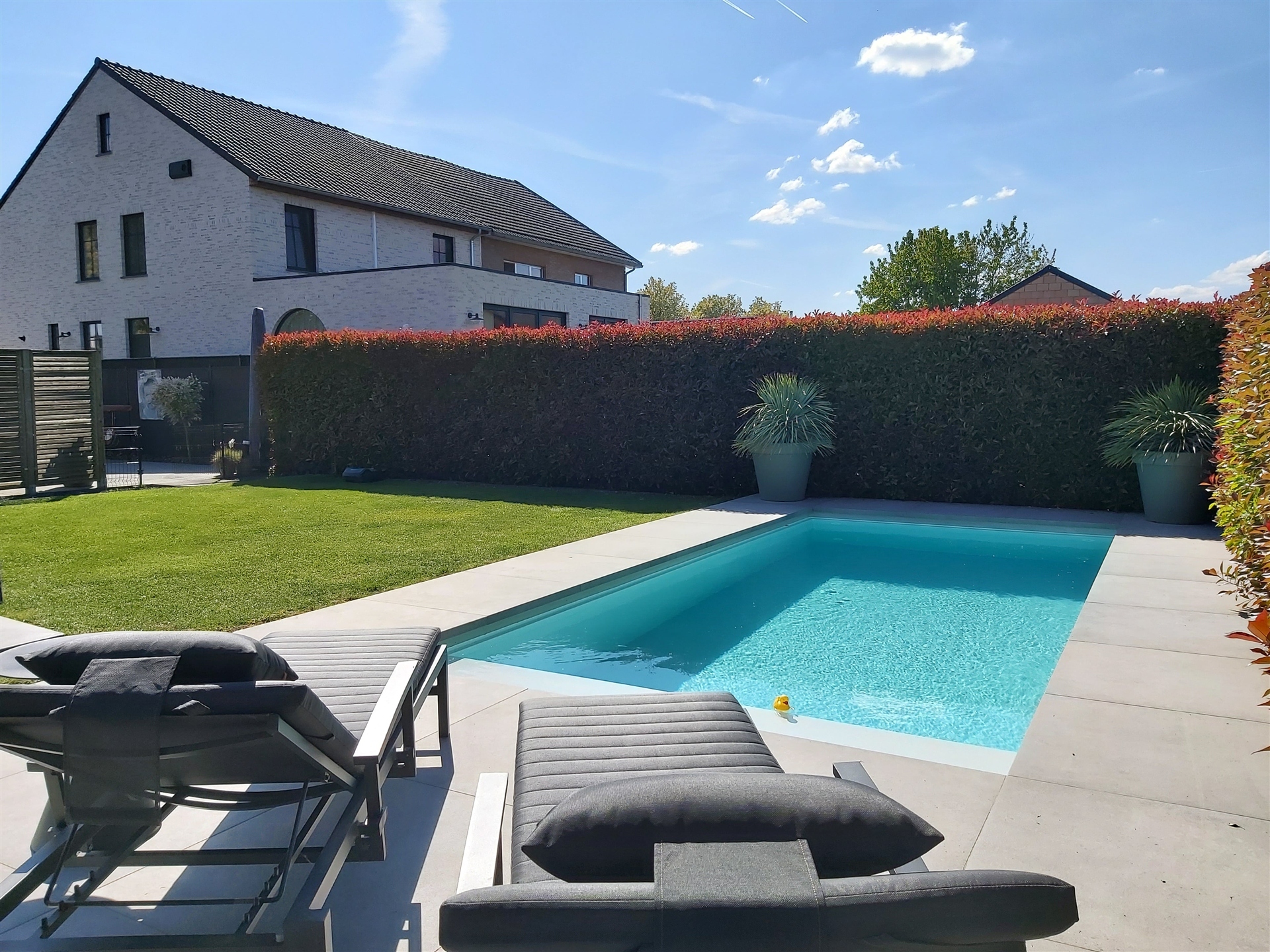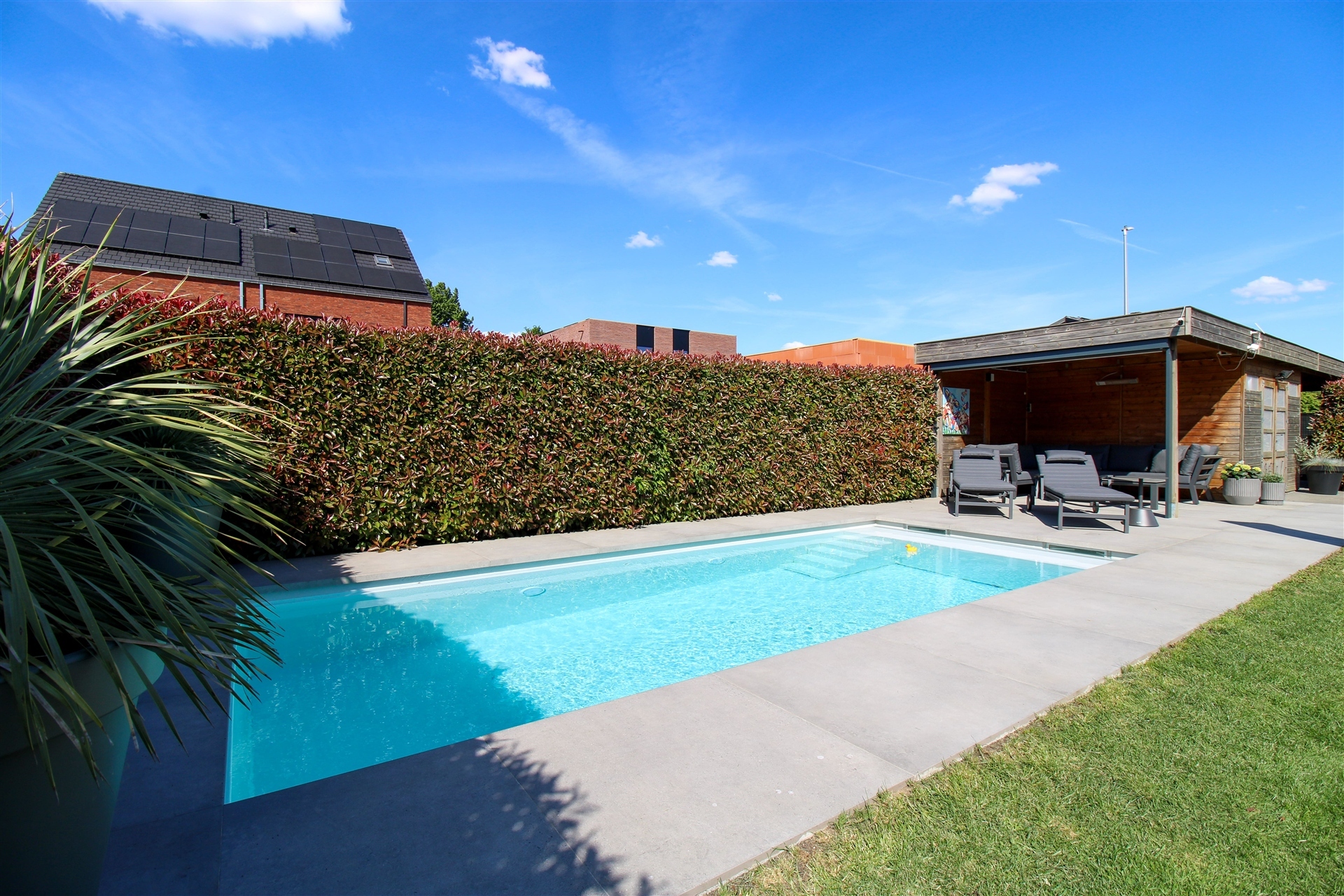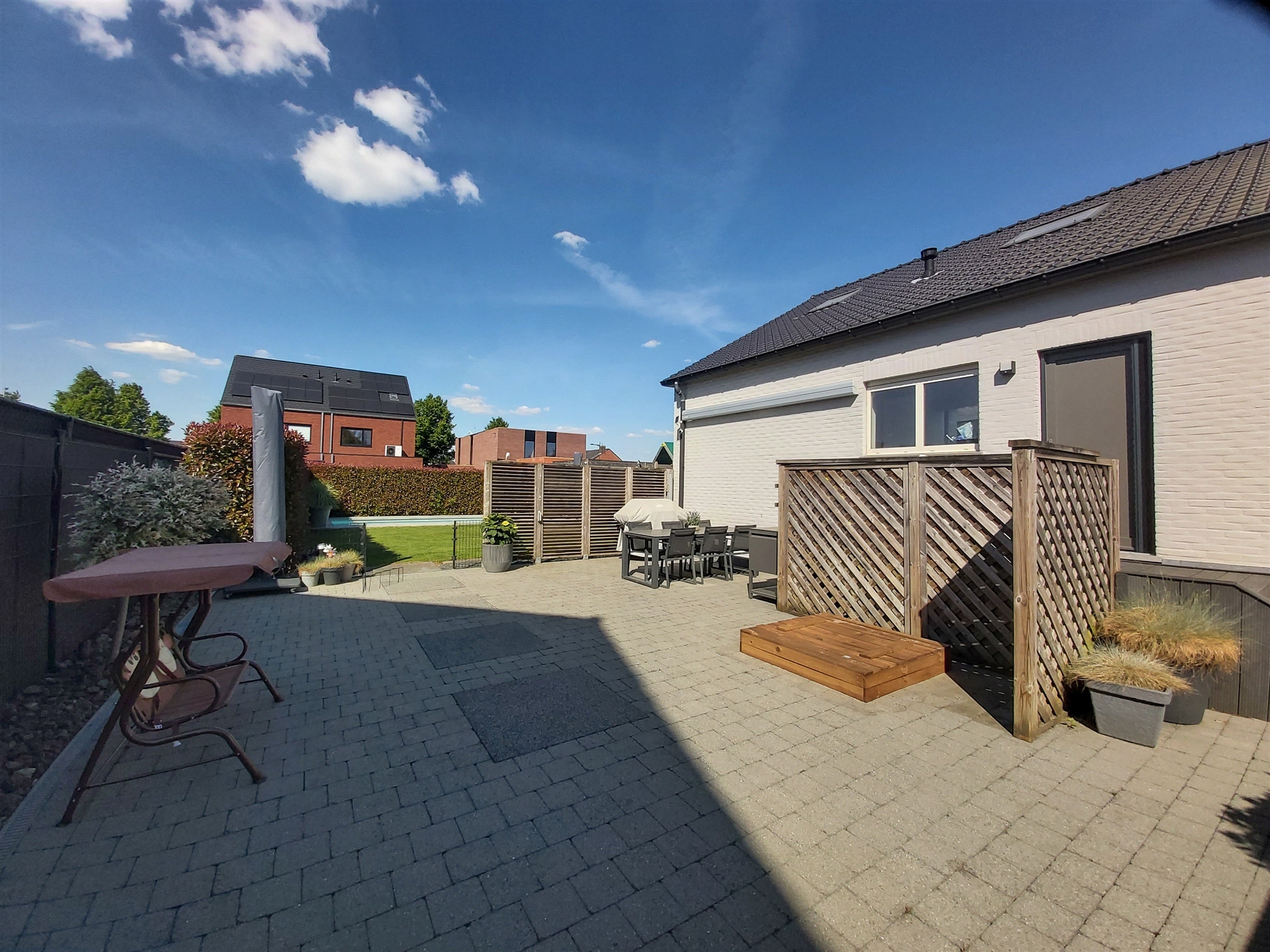 De woning staat op een mooi perceel van 9a80ca, waarbij zowel de voor- als achtertuin met zorg werden aangelegd en een echte meerwaarde vormen voor wie graag buiten leeft. Absolute blikvanger is het verwarmde zwembad, dat volledig automatisch werkt via een warmtepomp, zoutinstallatie en elektrisch rolluik. Ideaal voor zorgeloos zwemplezier van het vroege voorjaar tot het najaar! De tuin is bovendien volledig omheind met nieuw hekwerk en biedt toegang tot een tuinhuis met overkapping uitgerust met een zonnescreen én een aangrenzende carport (2017).