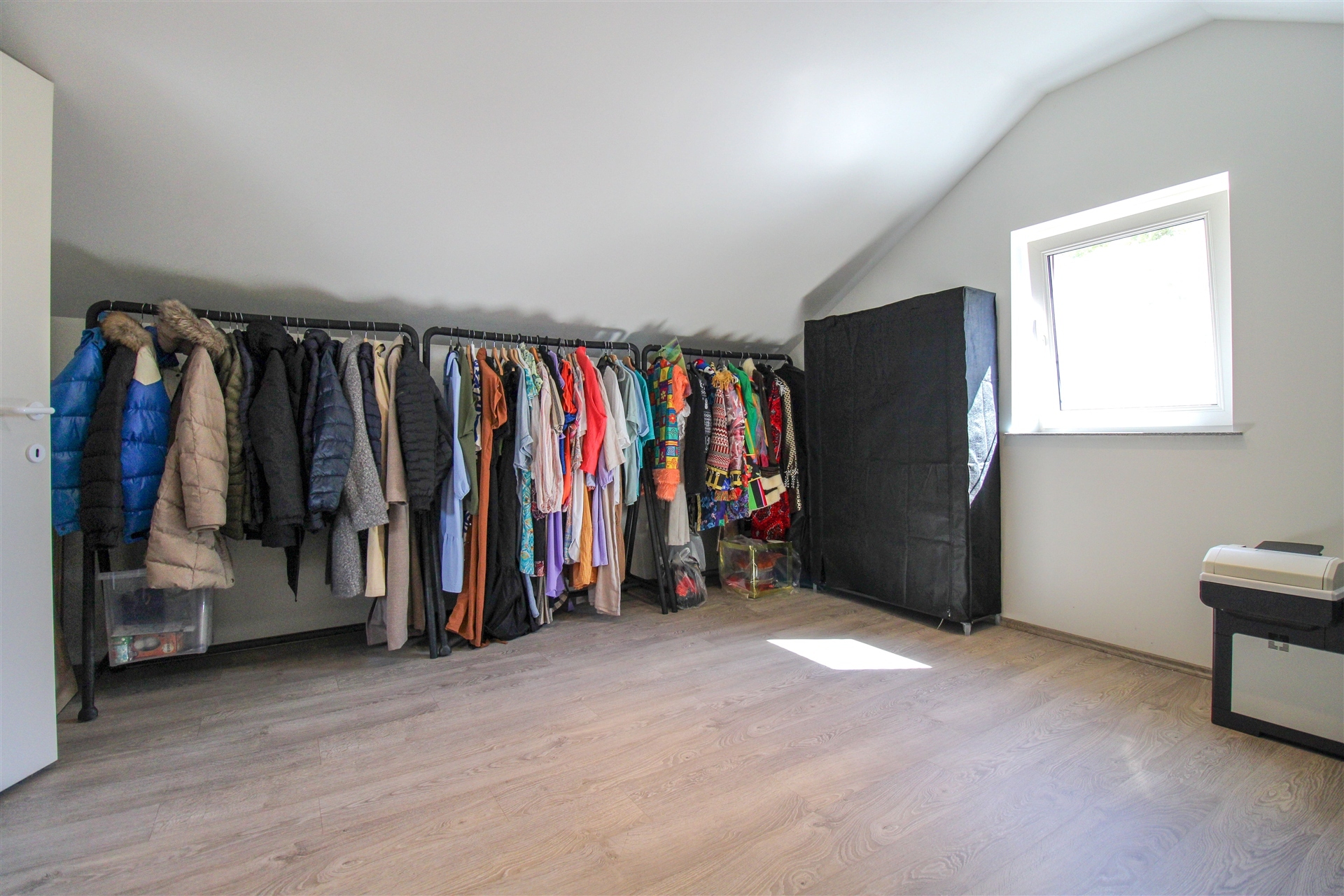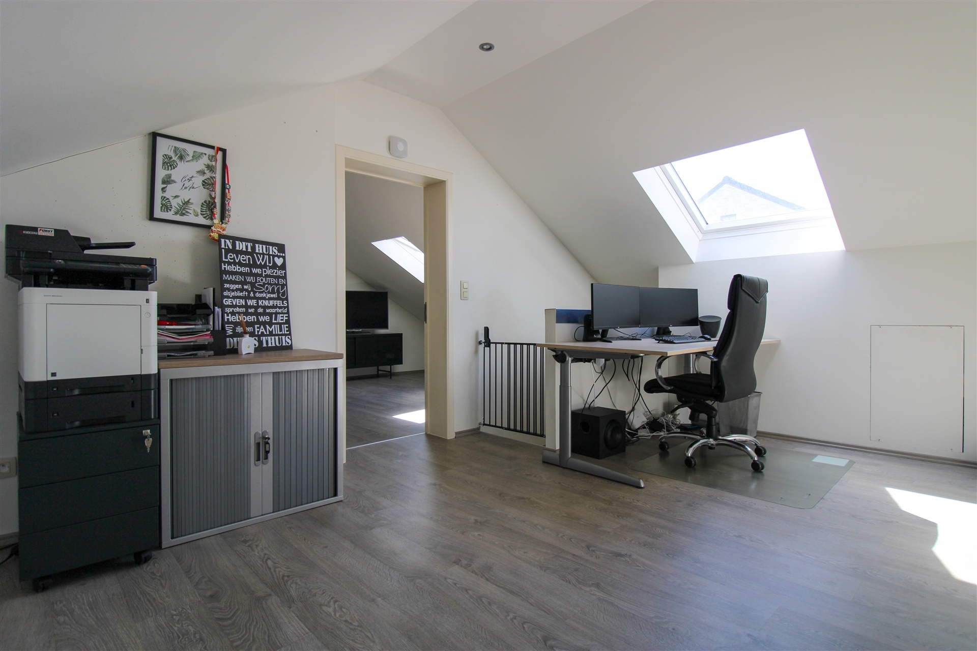 De eerste verdieping is bereikbaar via de trap in de bijkeuken. Hier komt u terecht in een ruime overloop die momenteel gebruikt wordt als bureauruimte. Deze geeft op zijn beurt toegang tot 2 slaapkamers, waarvan één directe toegang heeft tot een mogelijke extra slaapkamer of dressingruimte. Op deze verdieping zijn tevens ingebouwde kasten voorzien!