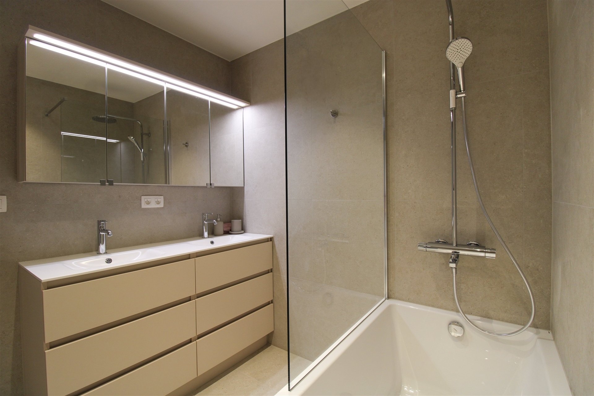 Via de inkomhal bereikt u het slaapgedeelte op het gelijkvloers. Hier bevinden zich drie mooie slaapkamers, een volledig vernieuwde badkamer (2025) met een dubbele lavabo, ligbad met douche-armatuur en toilet, én een trap naar de onderliggende garage met wasruimte.