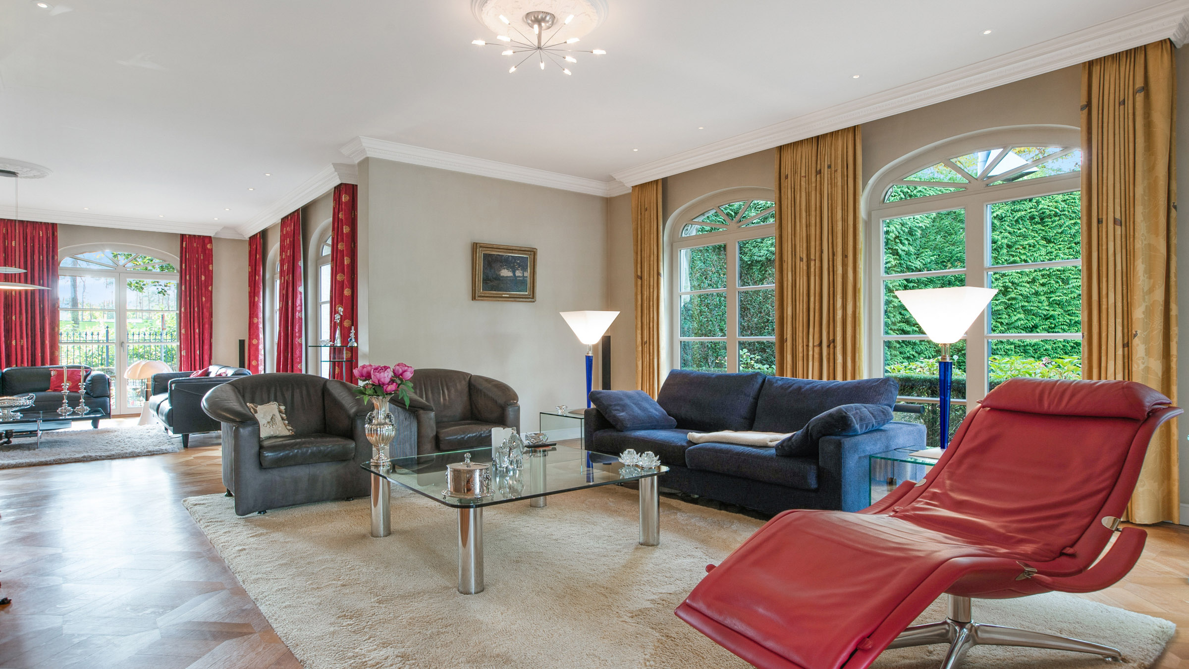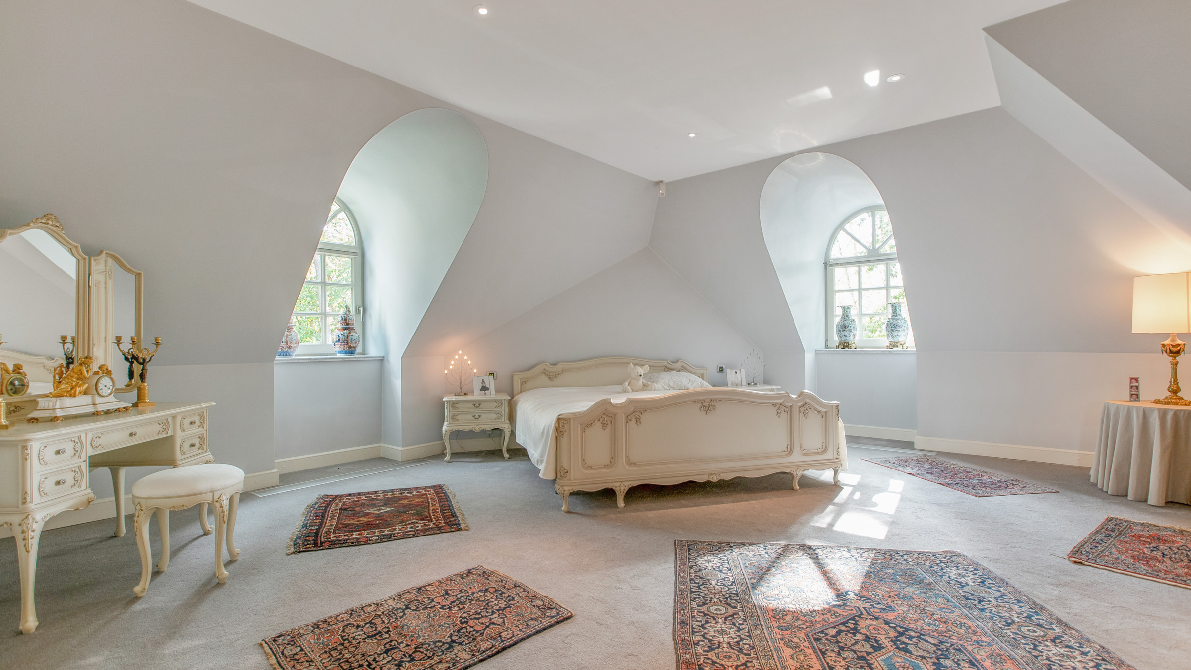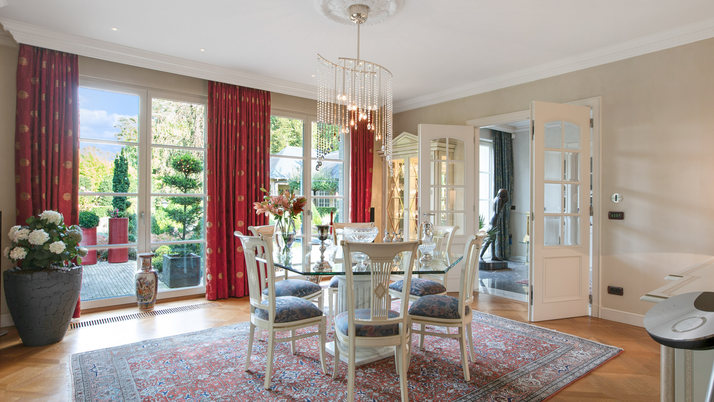- Via de indrukwekkende trappenhal met sierlijke, goudkleurige leuning en verfijnde Swarovski- detail bereikt u de eerste verdieping