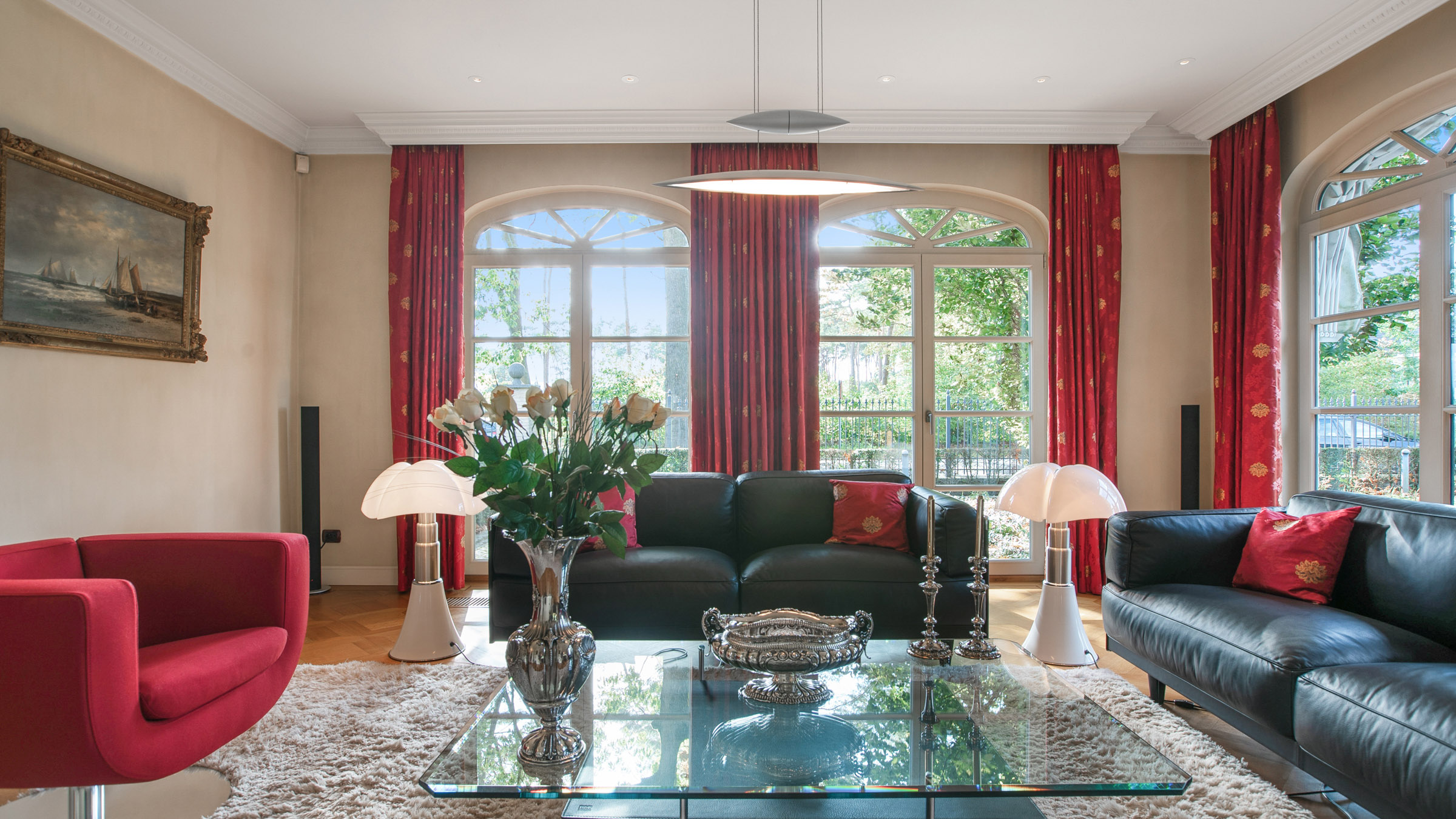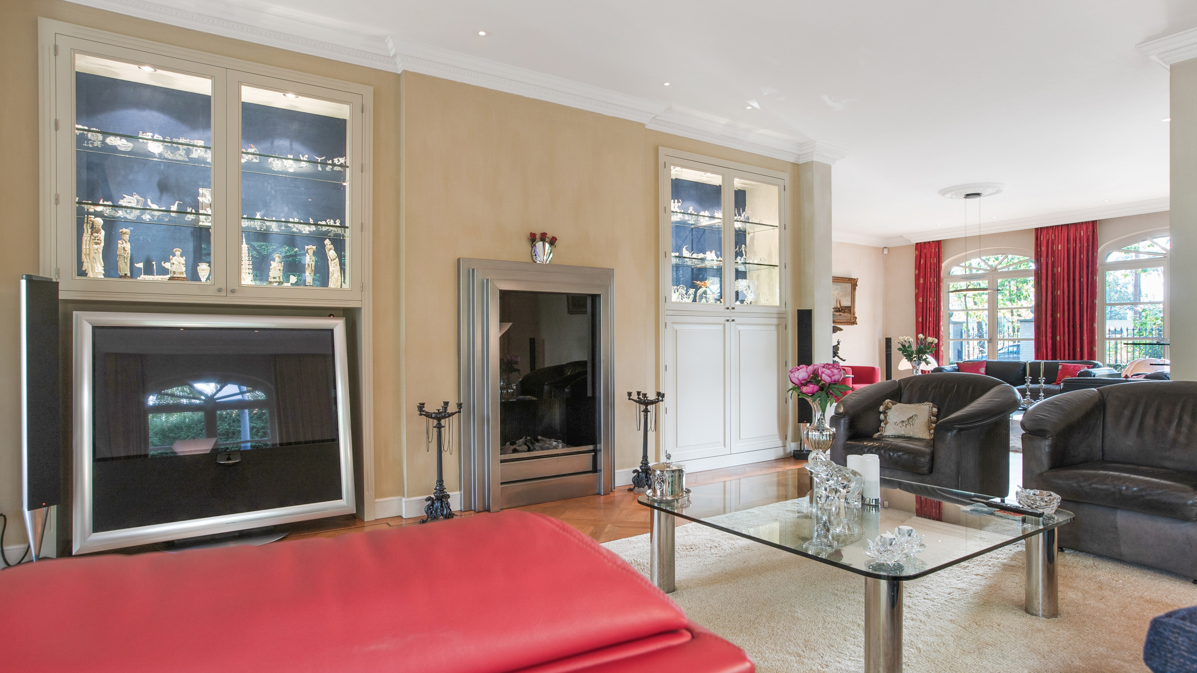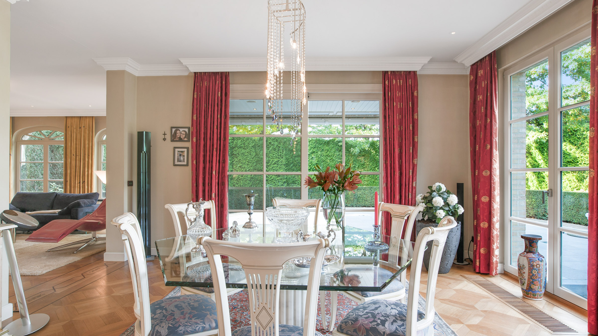 - Via de indrukwekkende trappenhal met sierlijke, goudkleurige leuning en verfijnde Swarovski- detail bereikt u de eerste verdieping