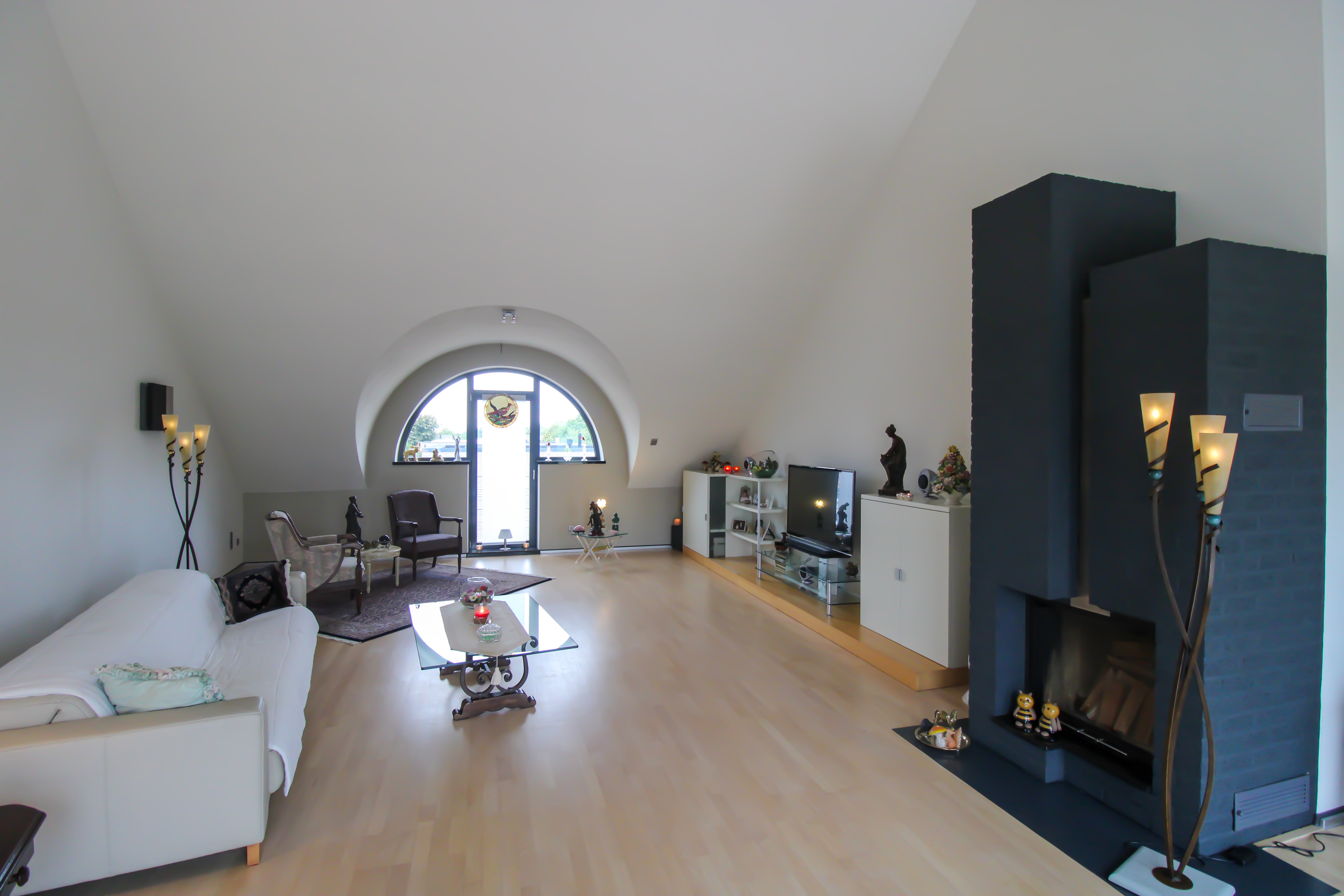 De bovenste verdieping is volledig ingericht als woonkamer en is zonder twijfel de absolute blikvanger van deze woning. De ruimte ademt gezelligheid en klasse: de hoge plafonds en de houthaard zorgen voor warmte en sfeer!