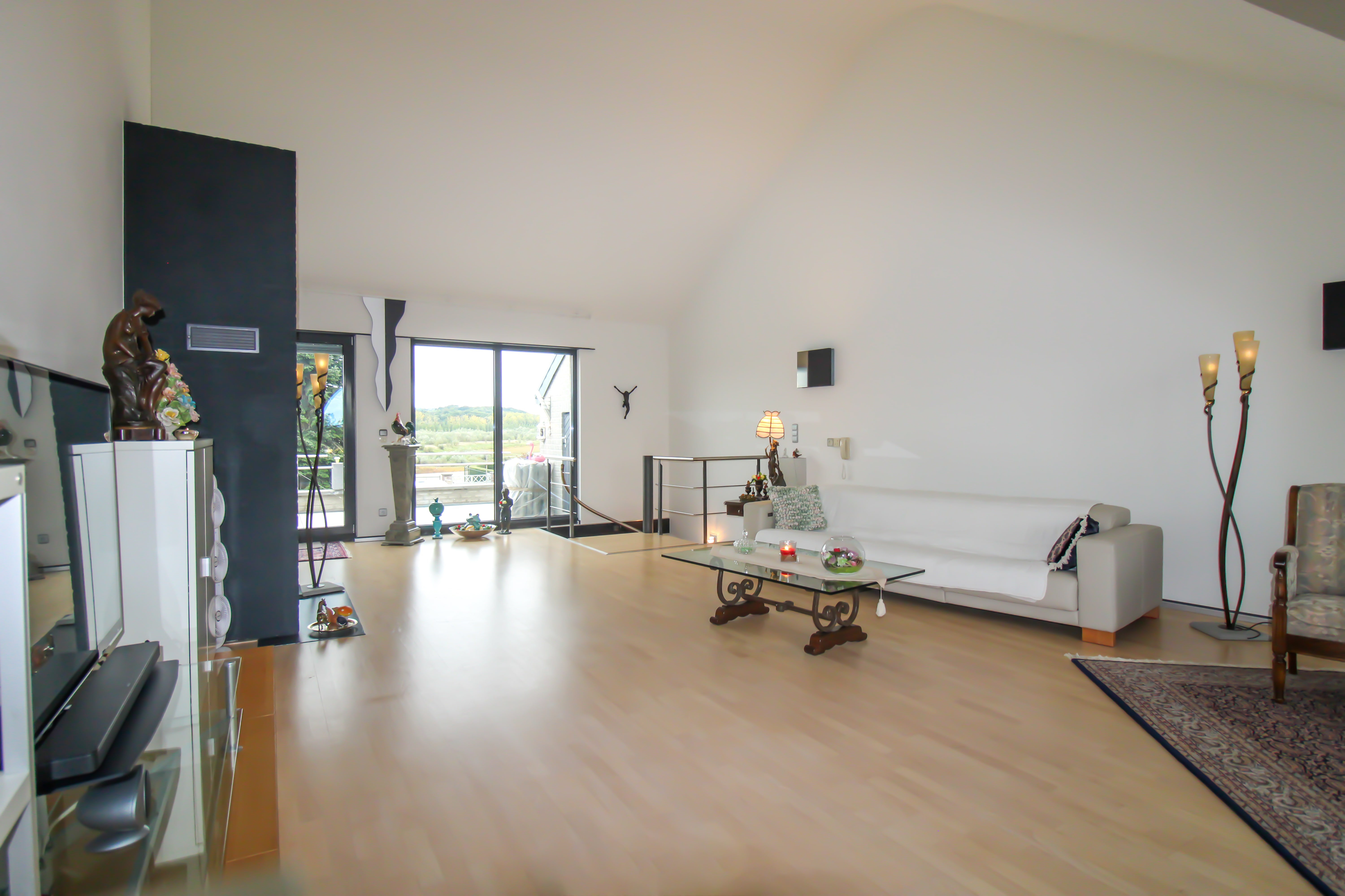 De inkomhal op de eerste verdieping geeft u toegang tot twee slaapkamers, waarvan één is uitgerust met een geïntegreerde badkamer. Deze kamer heeft een open en luxueus karakter, ideaal voor wie houdt van een moderne, loftachtige sfeer.