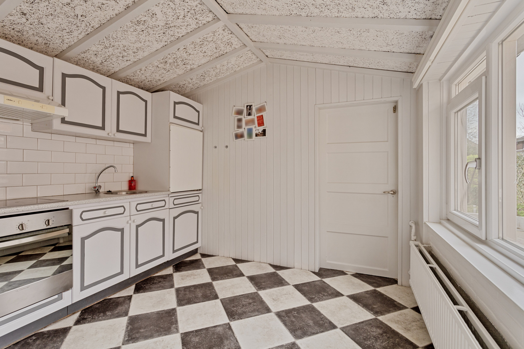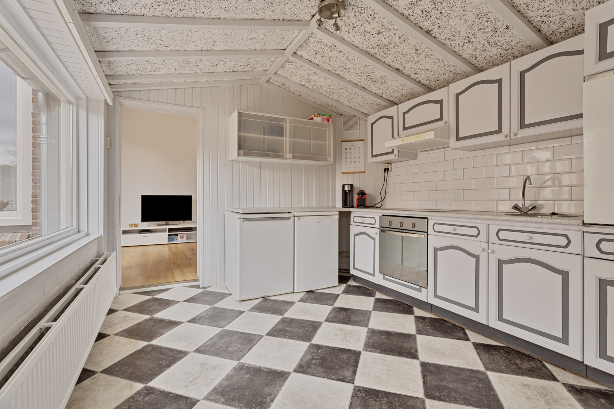 tot de keuken van ca. 8 m² met een eenvoudige witte keukenopstelling. De keuken beschikt over