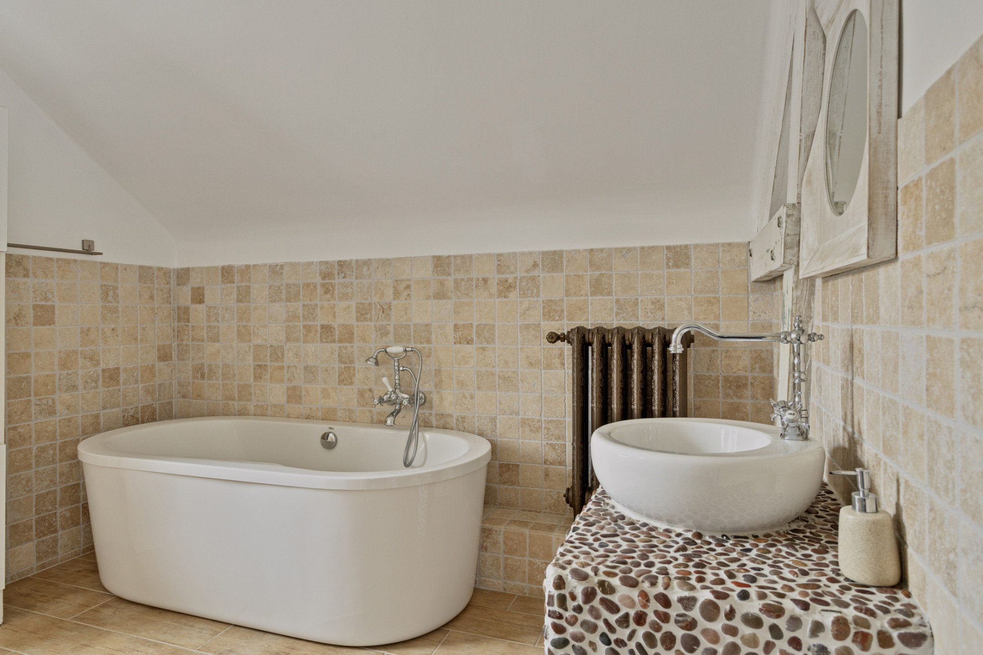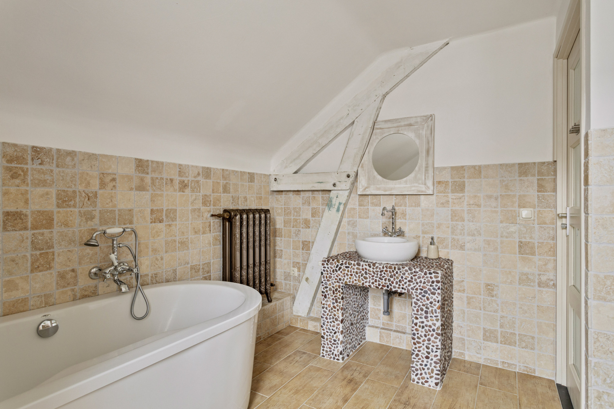 - Luxe badkamer van ca. 9 m² met ruim ligbad, inloop - en regendouche, wastafel, designradiator